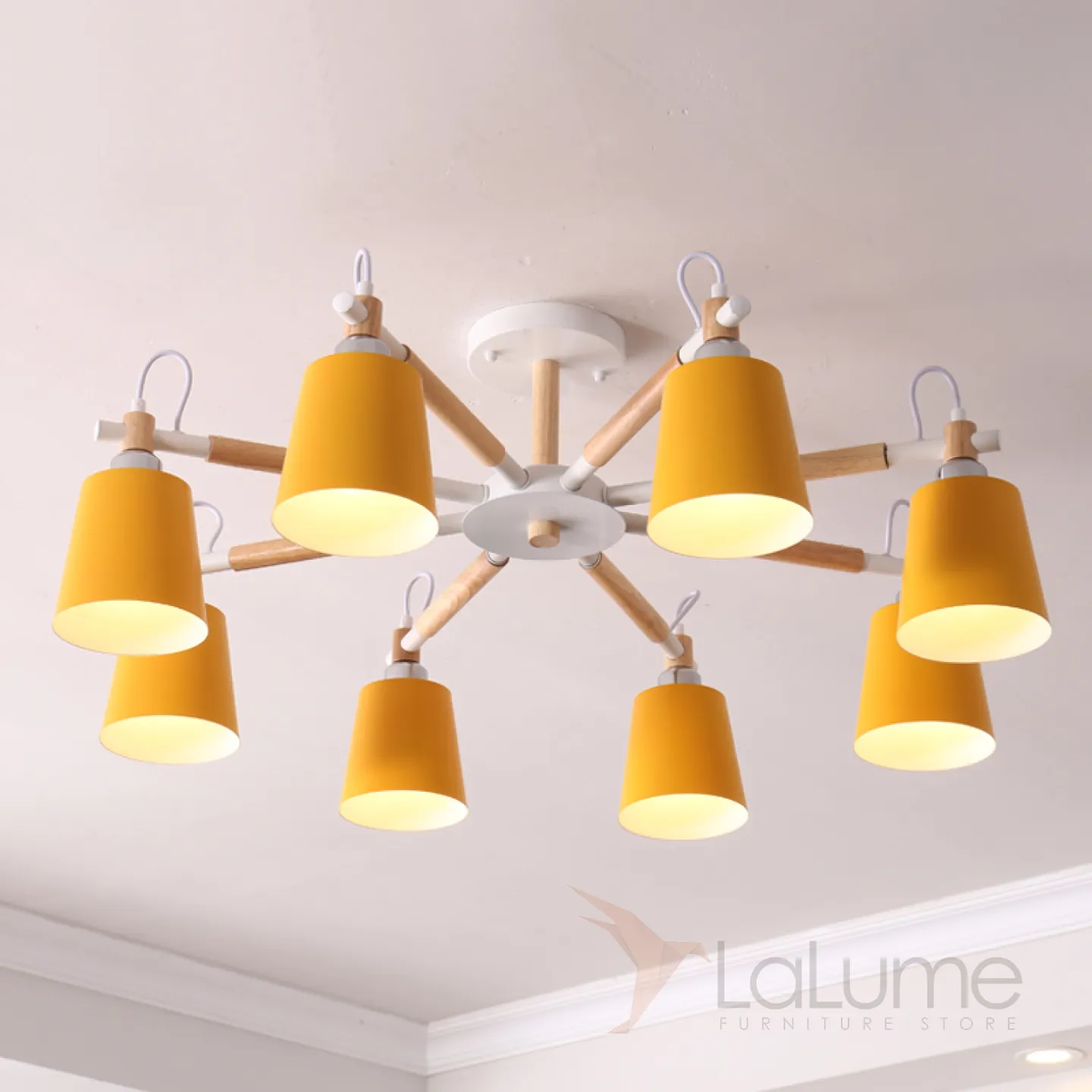 Люстра в скандинавском стиле с разноцветными металлическими плафонами. Стиль и бюджет в полном согласии.