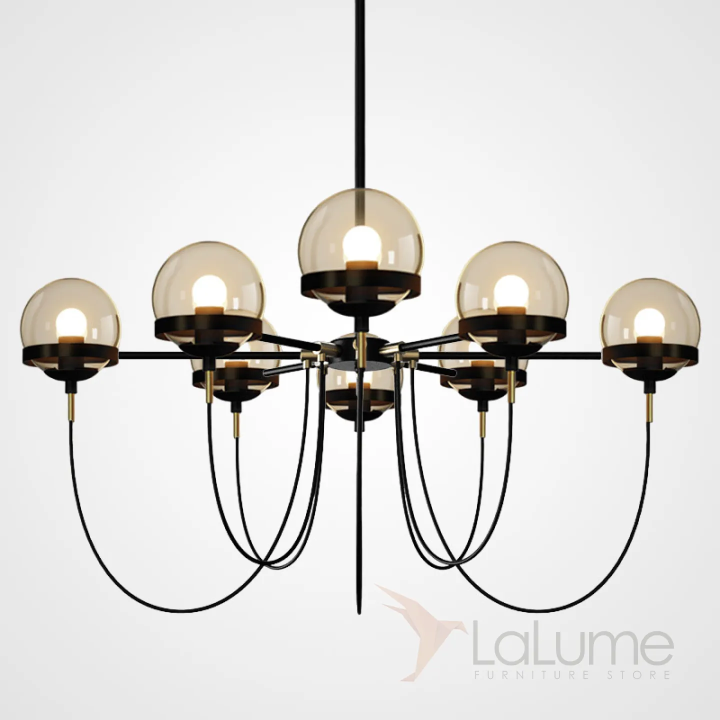 Плафоны и абажуры удерживаются в кольцах только за счет собственного веса, а провода в текстильной оплетке свободно спускаются к центру каркаса, образуя параболические орбиты у каждого шара.