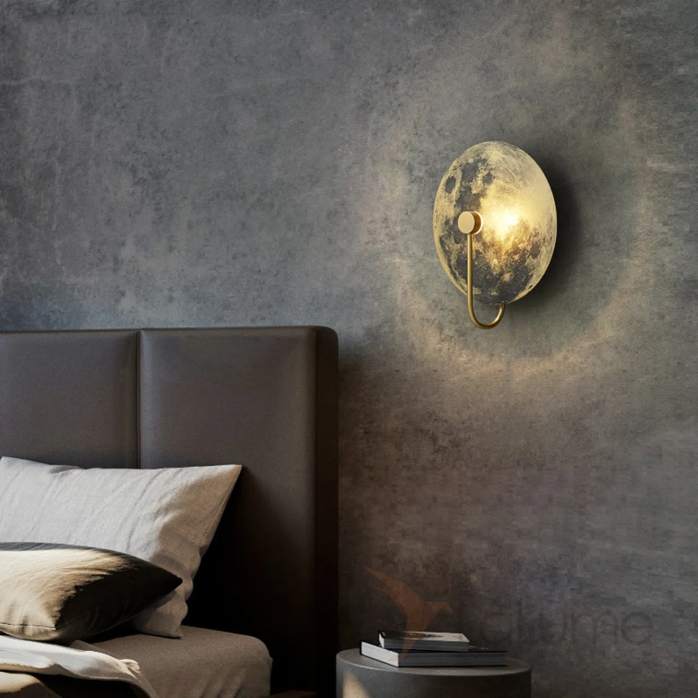 Настенный светодиодный светильник-инсталляция с изображением луны, подсвеченной круглым плафоном на латунном кронштейне ASTRONOMY D34