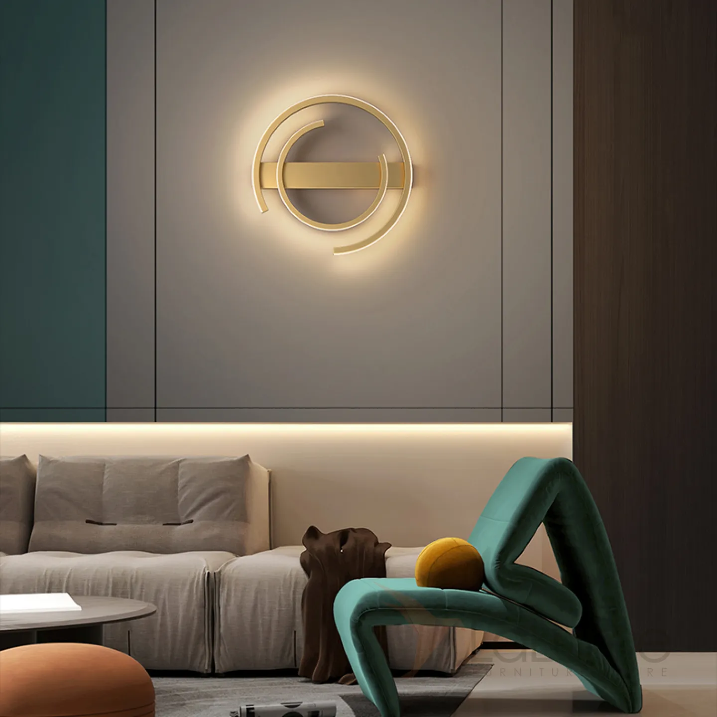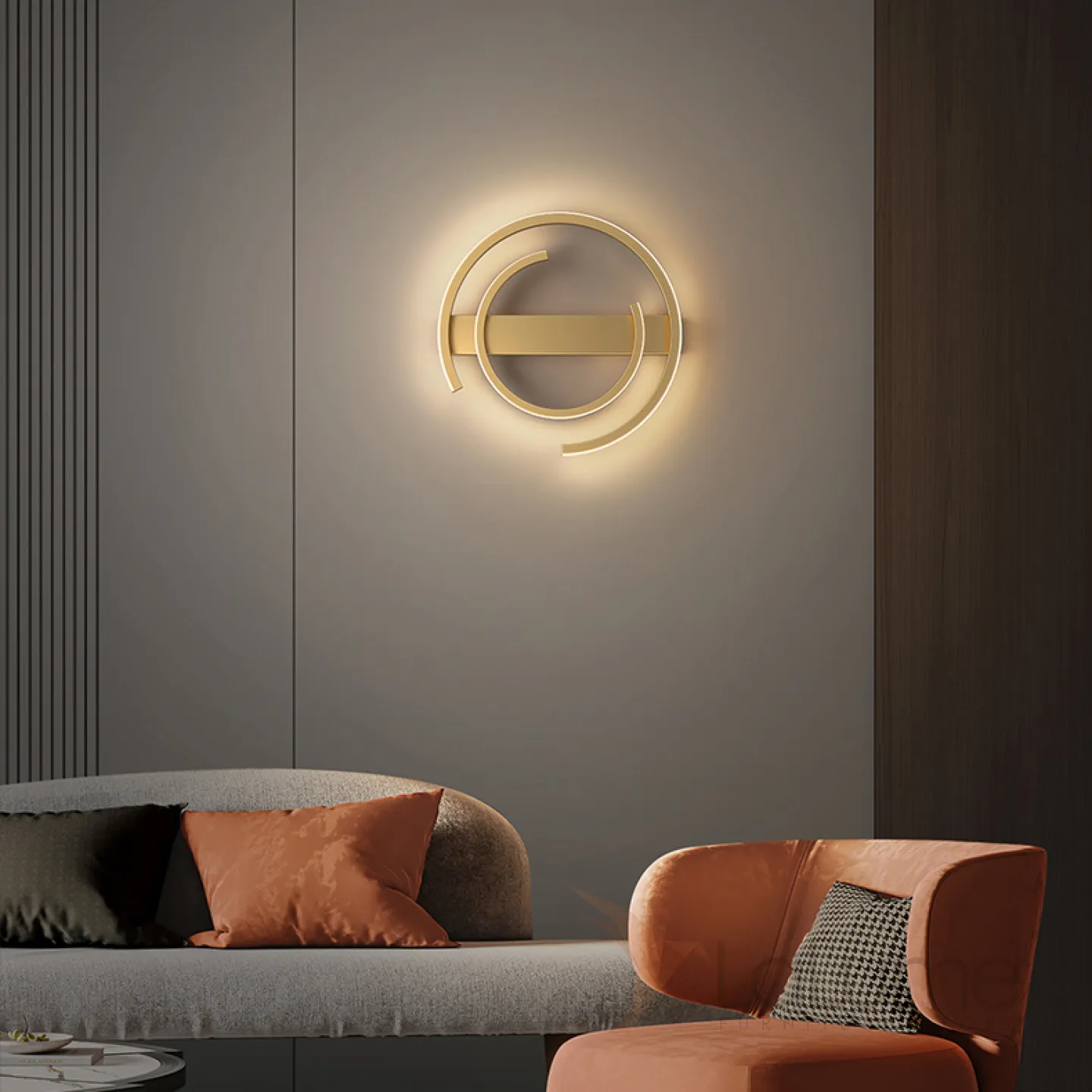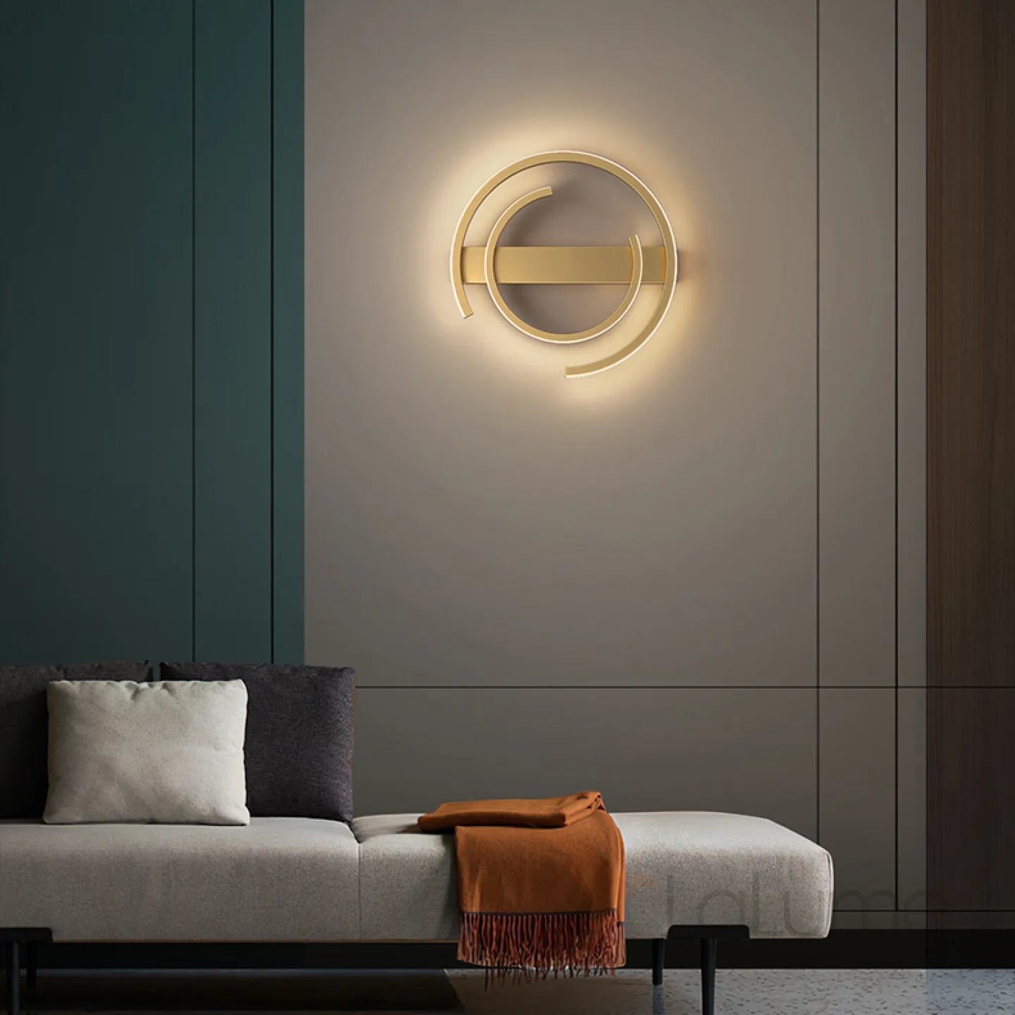 Серия настенных светодиодных светильников в виде комбинации полуколец разного диаметра на прямоугольном креплении LOFT Brass