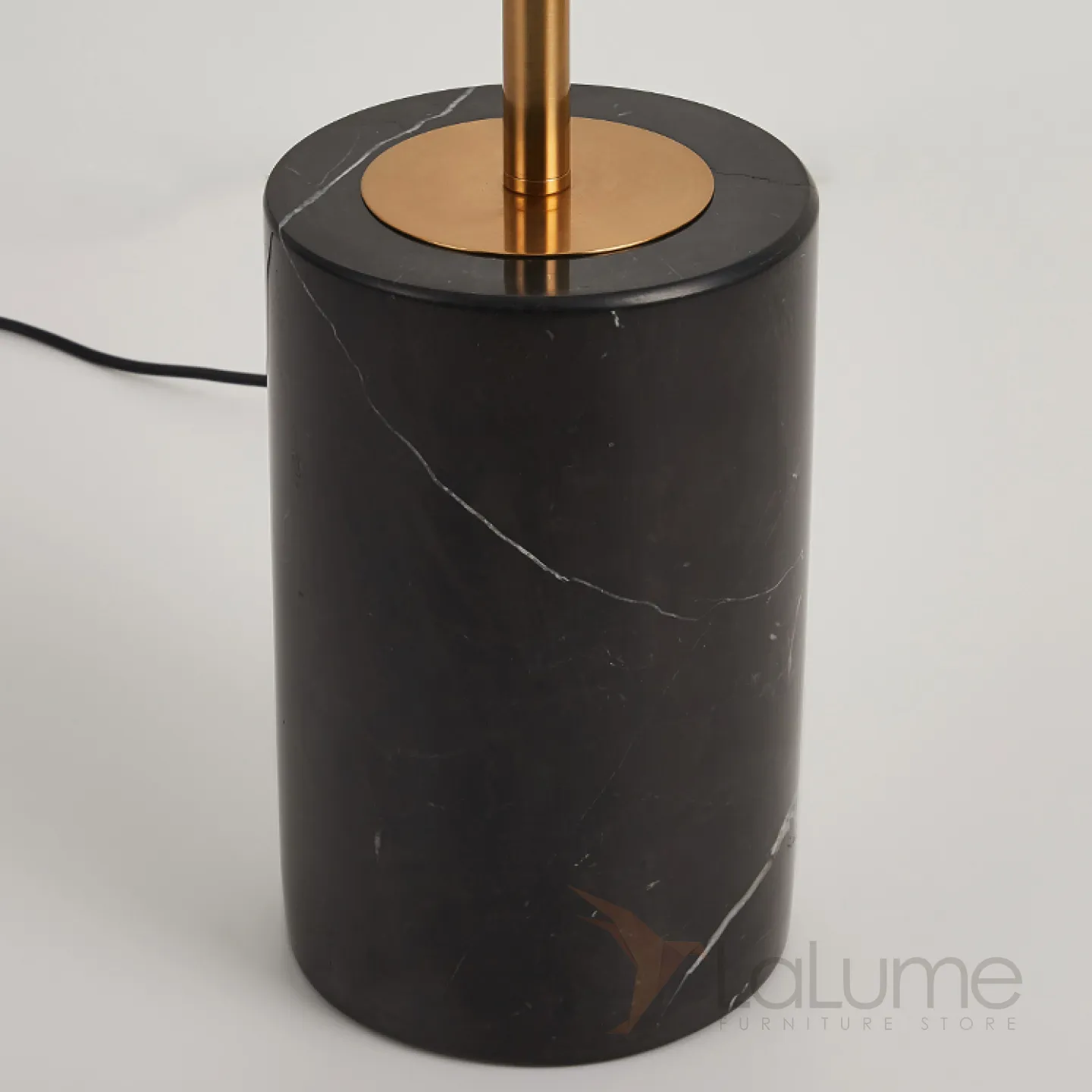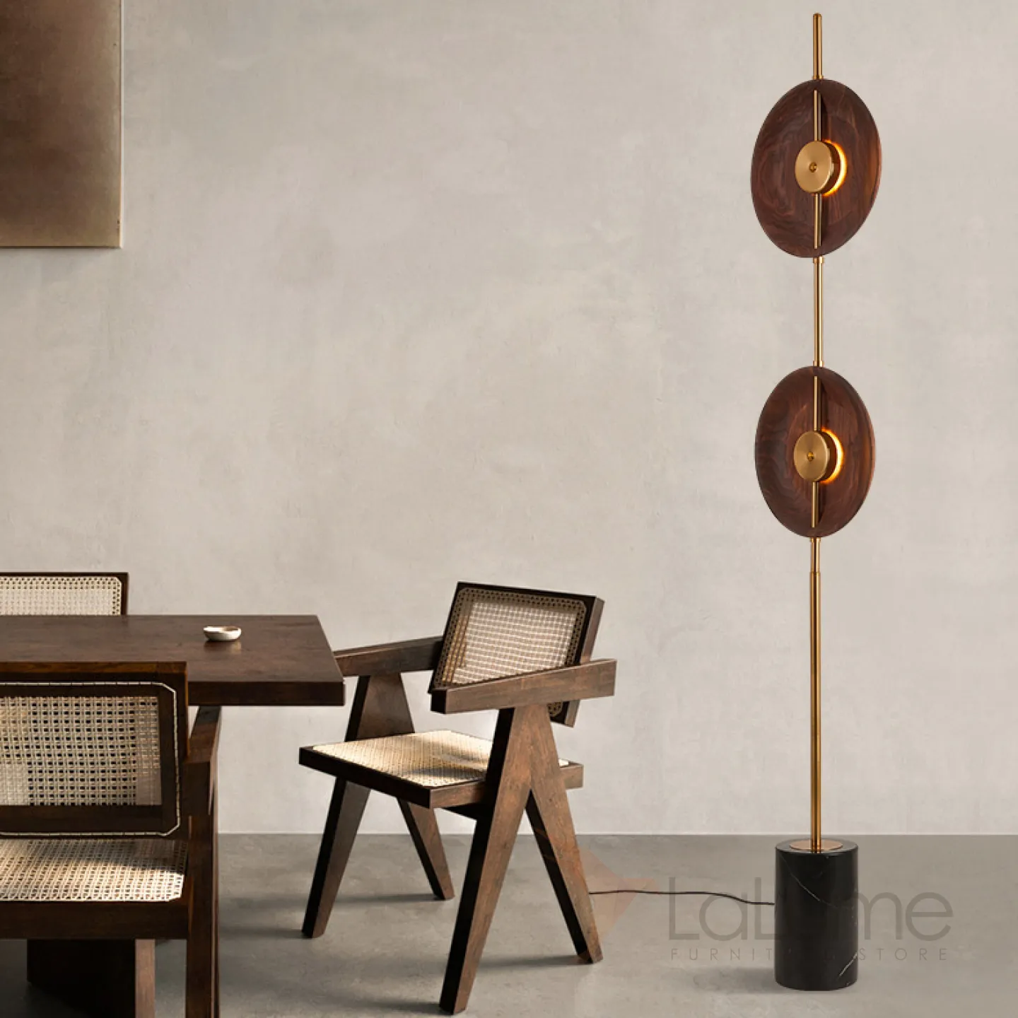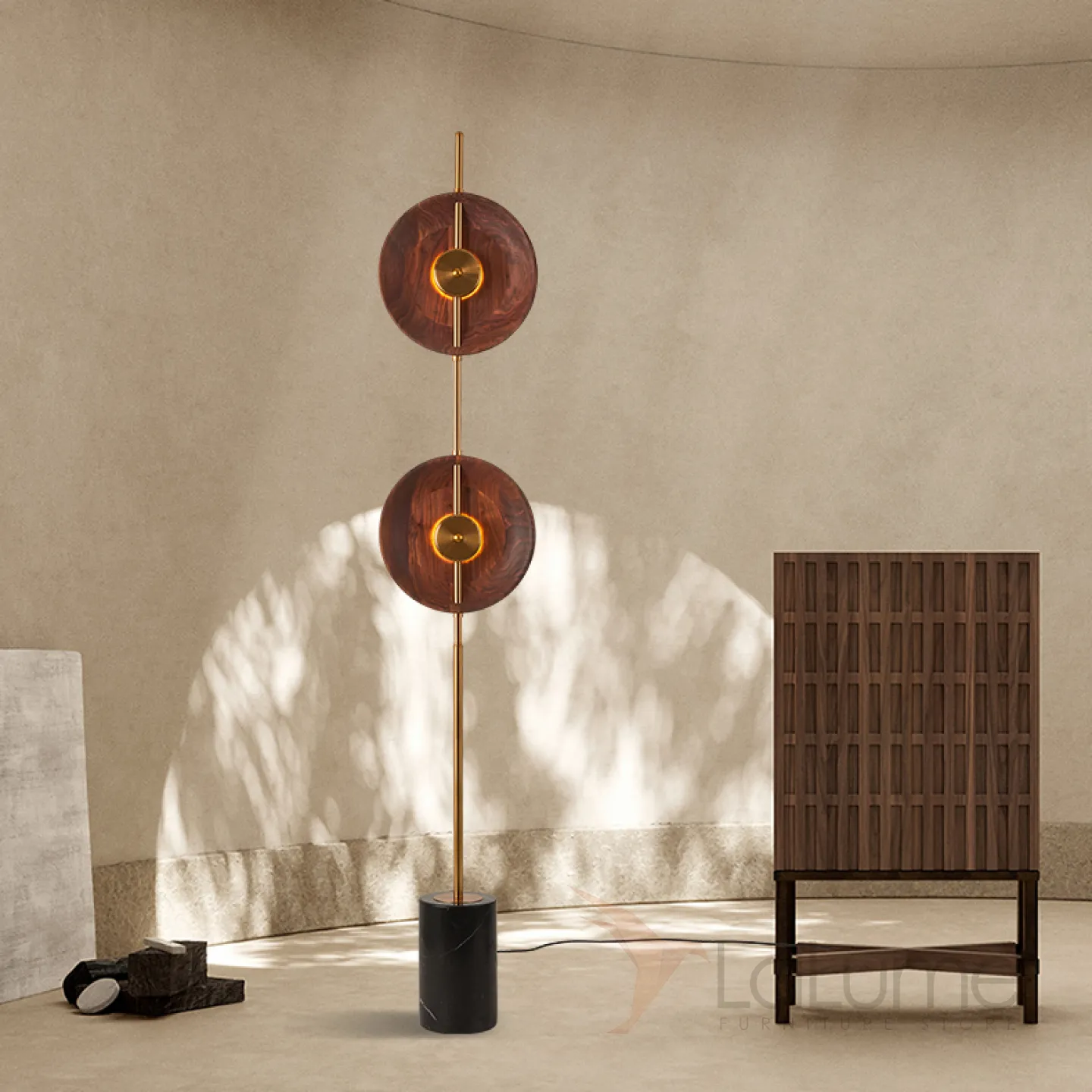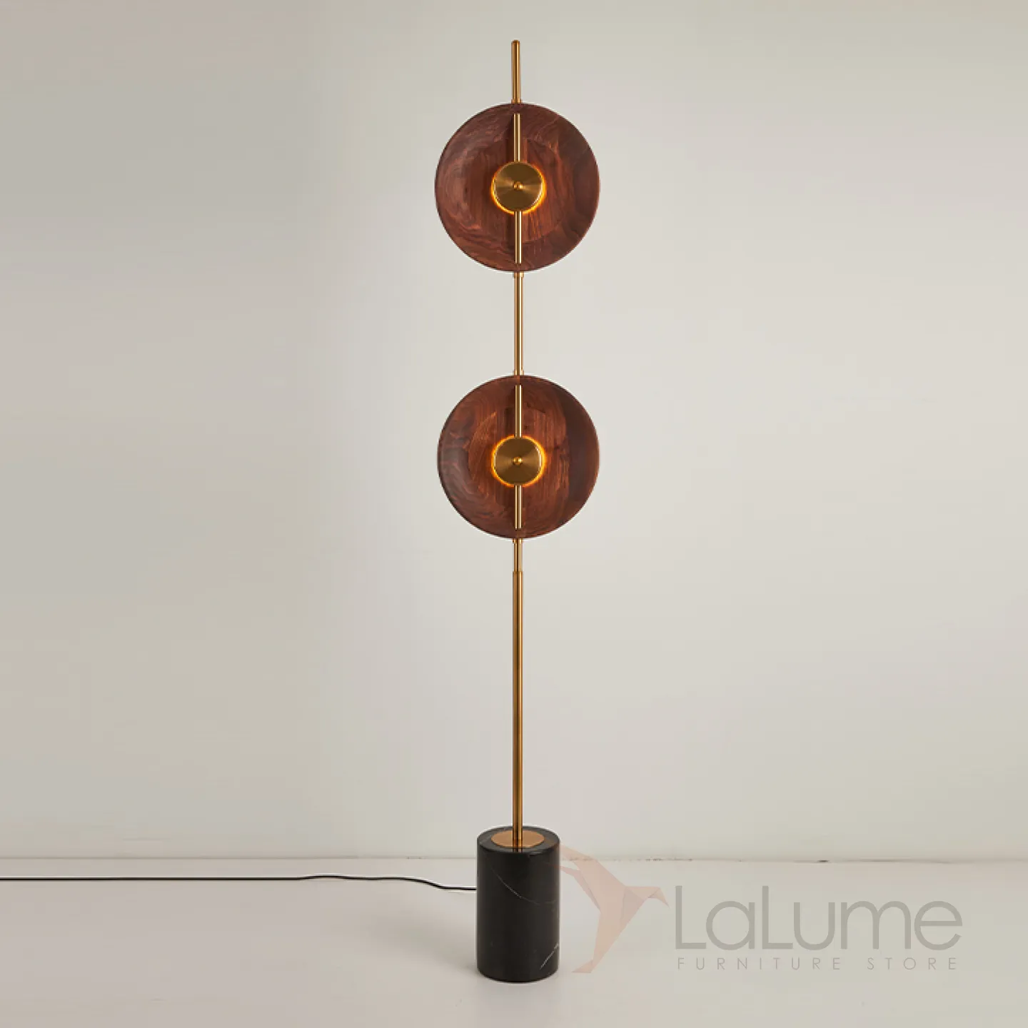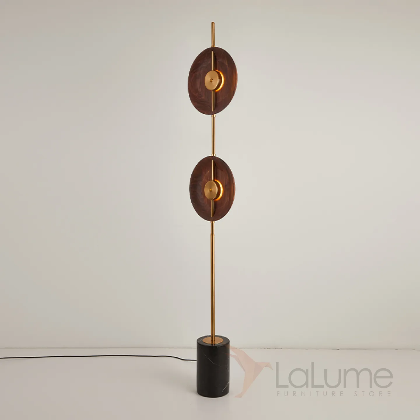 Светодиодный торшер с двумя дисковидными рассеивателями из орехового дерева на вертикальной стойке с мраморным основанием GERALDINE