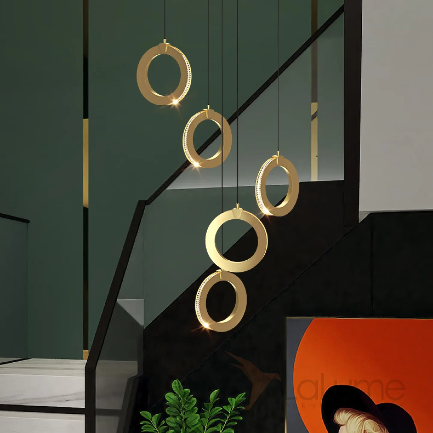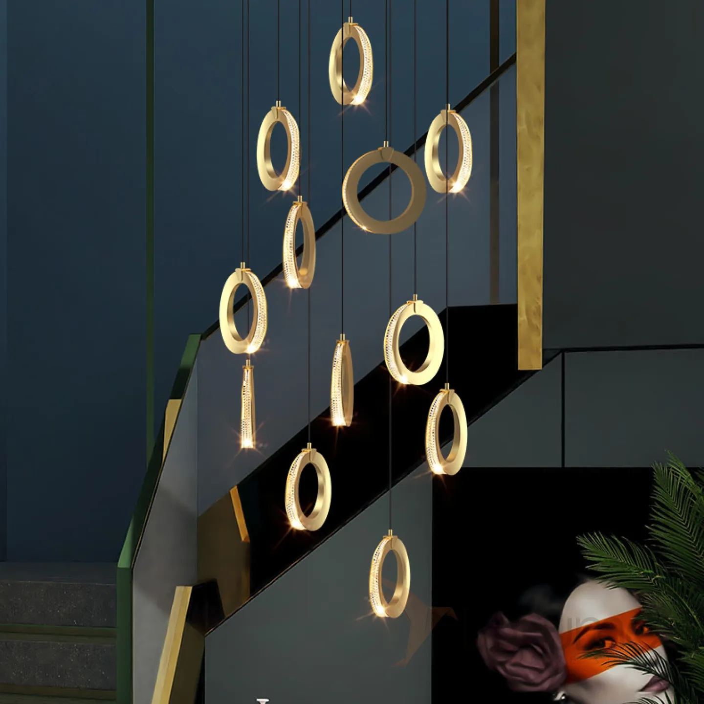 Готовая комбинация подвесных светодиодных светильников с кольцевидными плафонами с прозрачными рельефными рассеивателями по контуру корпуса CARLIN L12