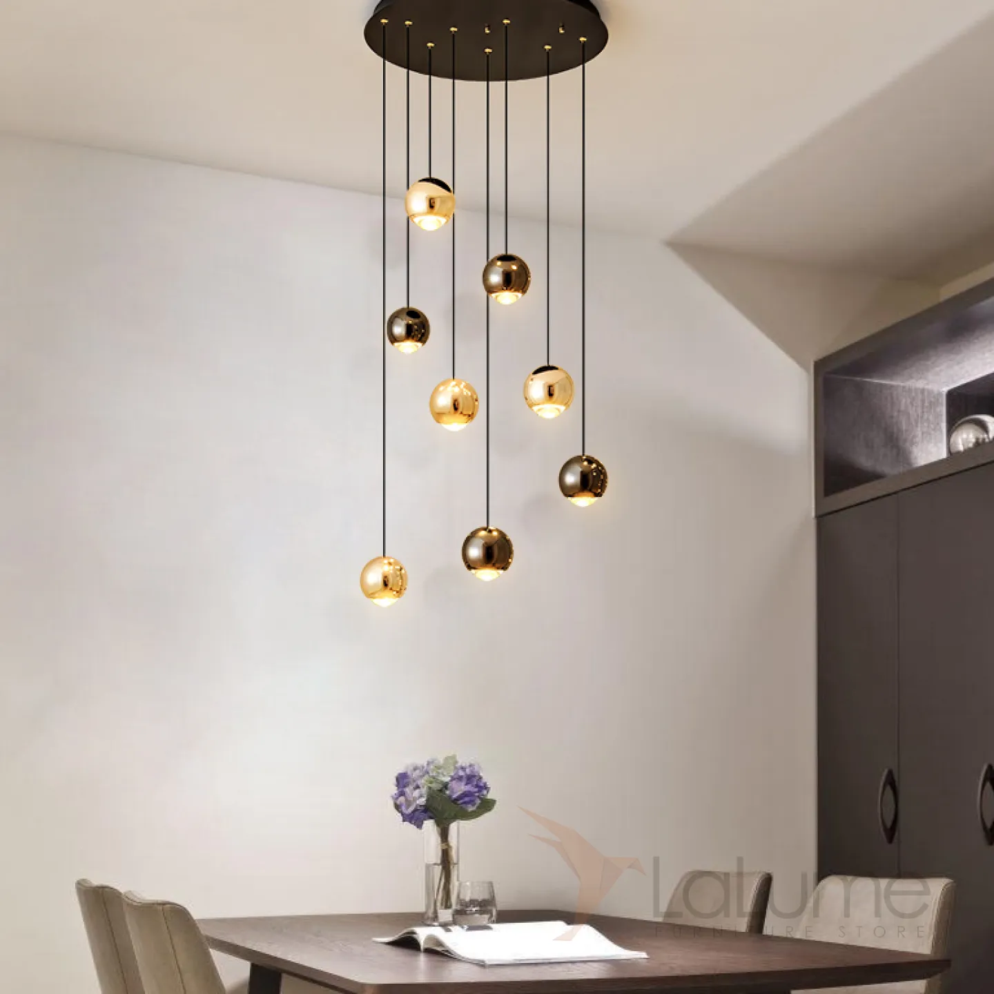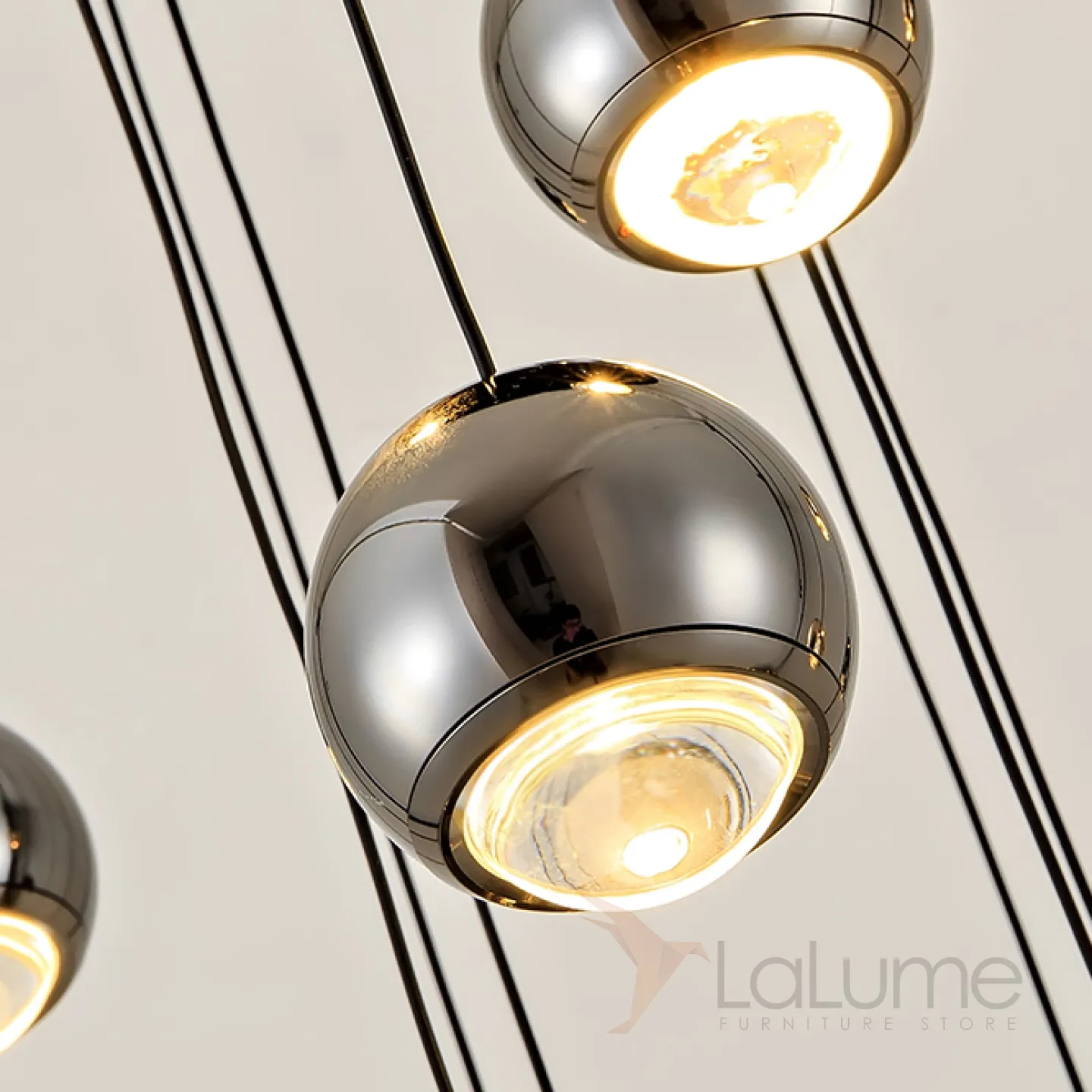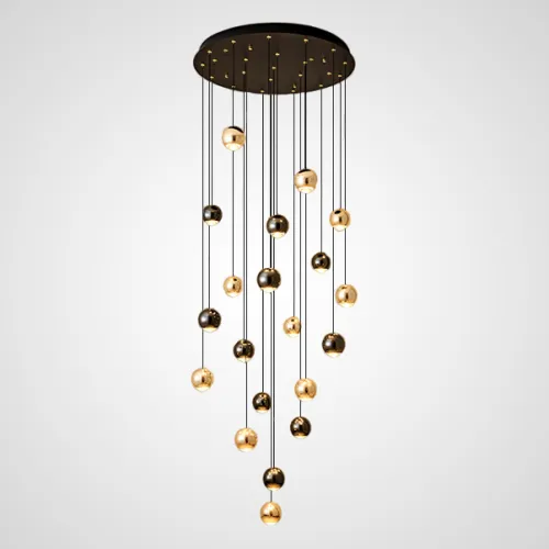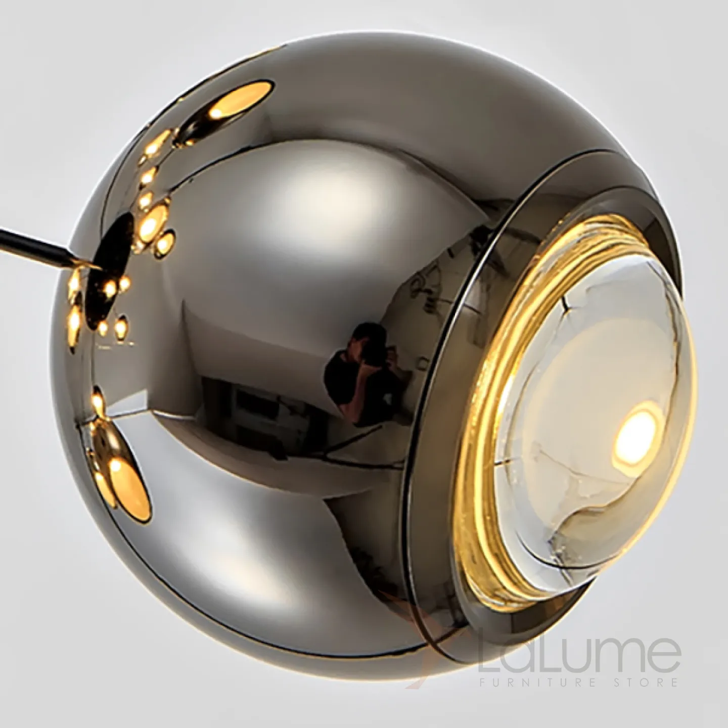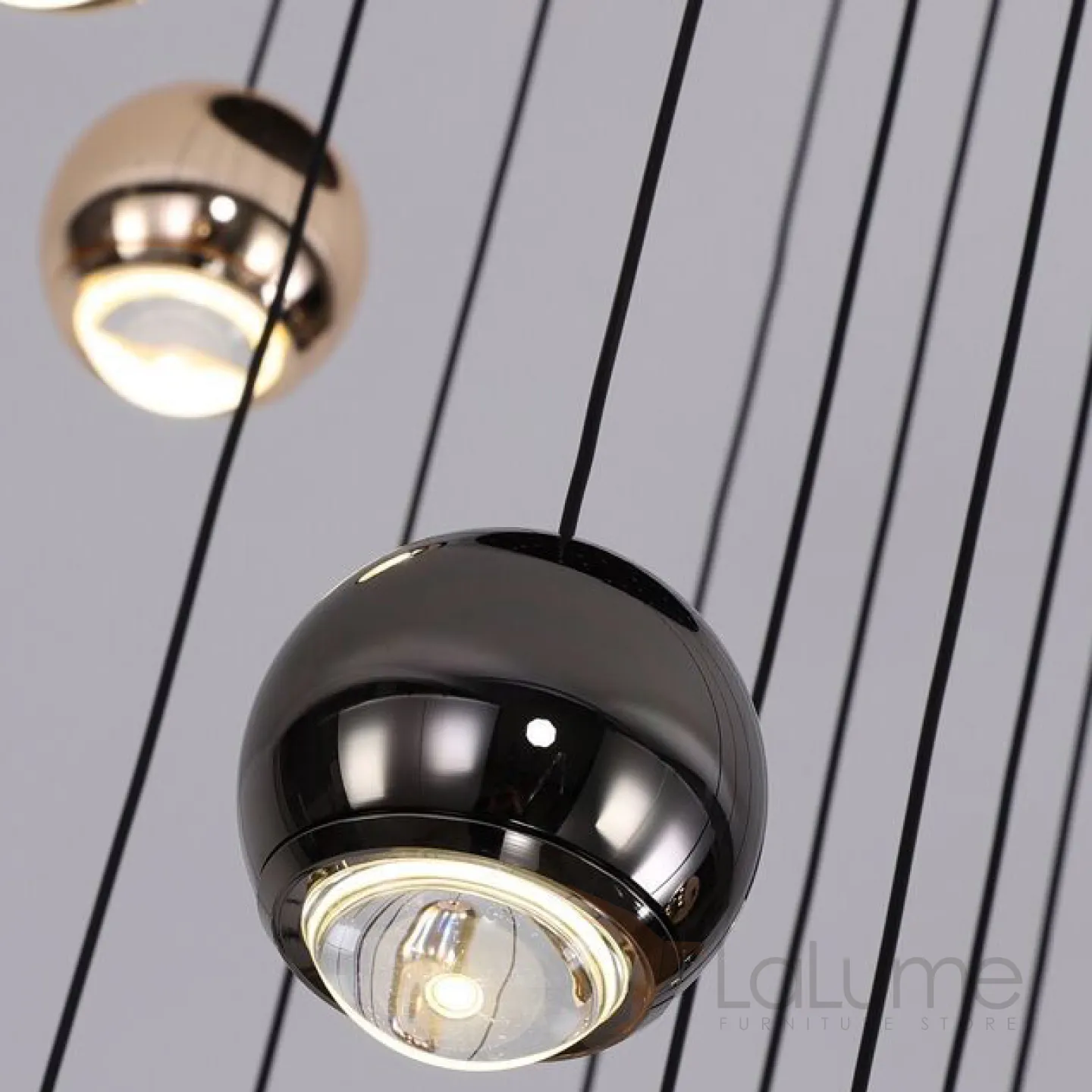 Готовая комбинация подвесных светильников с шарообразными плафонами в цвете латуни и черного жемчуга с линзами из оптического стекла KARA D40