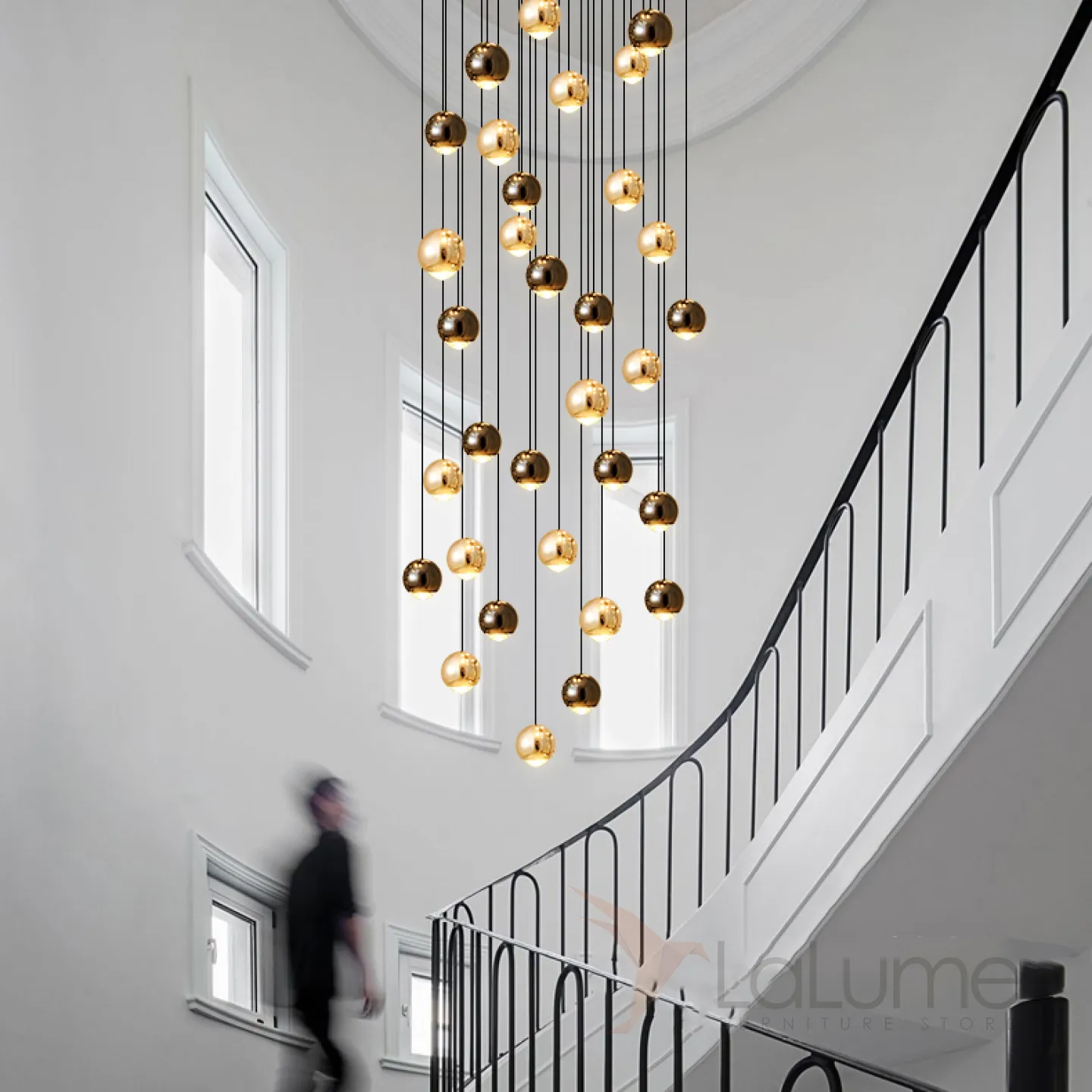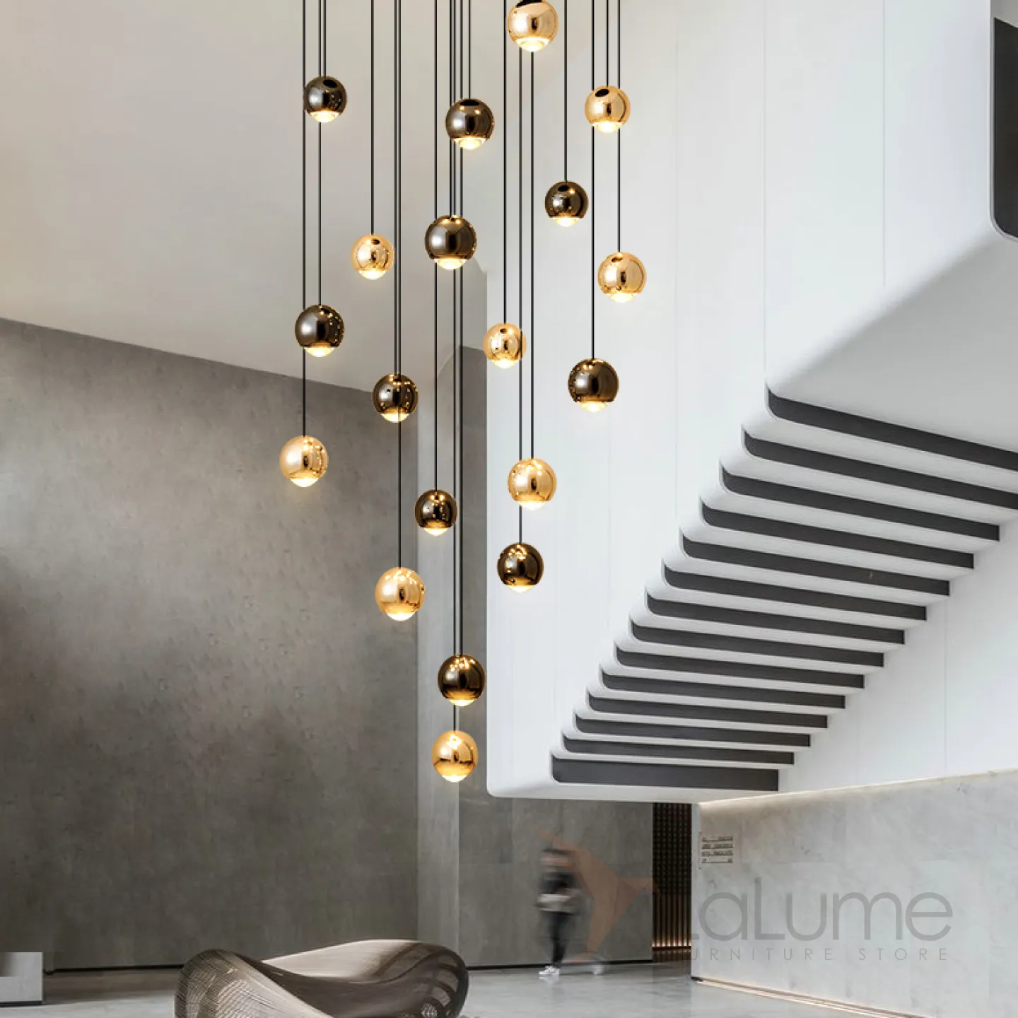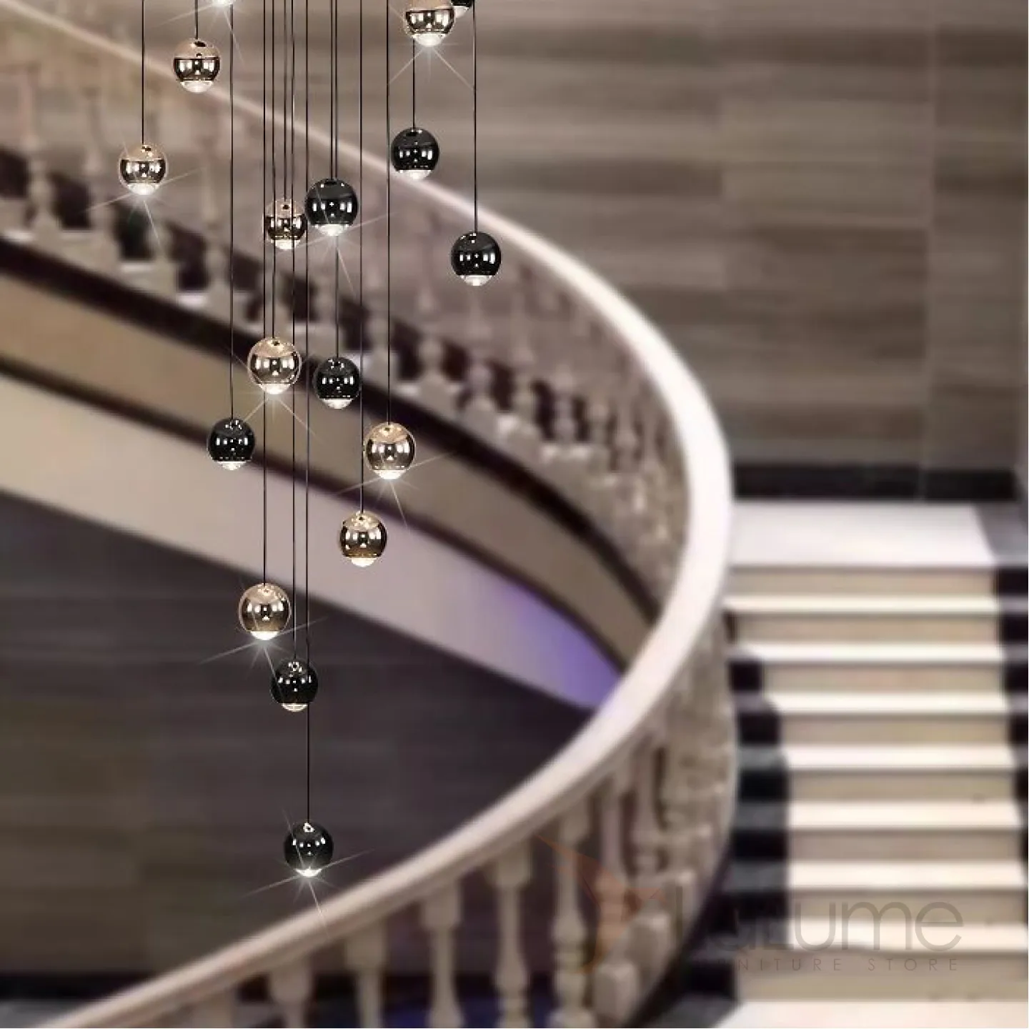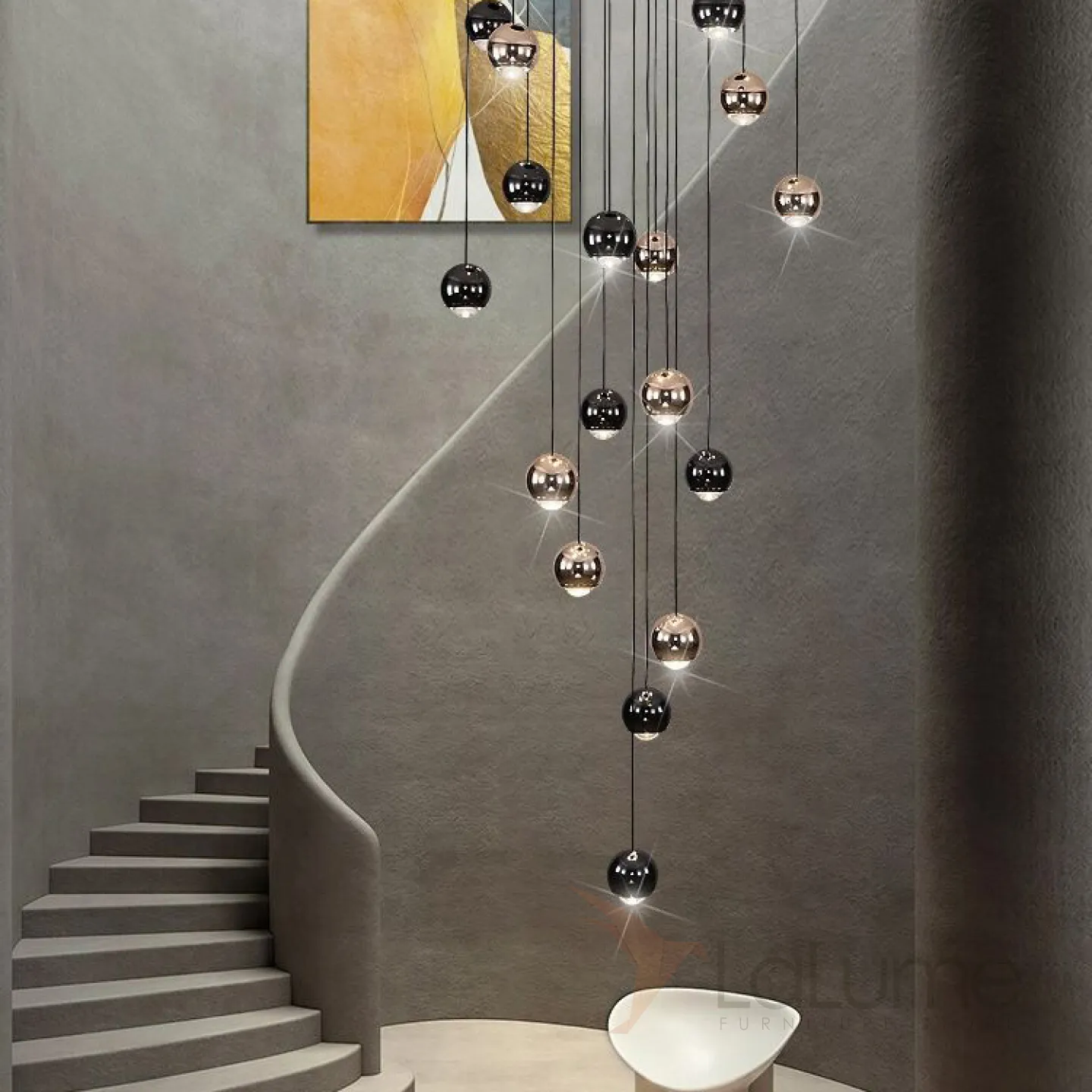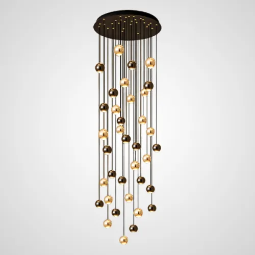 Готовая комбинация подвесных светильников с шарообразными плафонами в цвете латуни и черного жемчуга с линзами из оптического стекла KARA D40