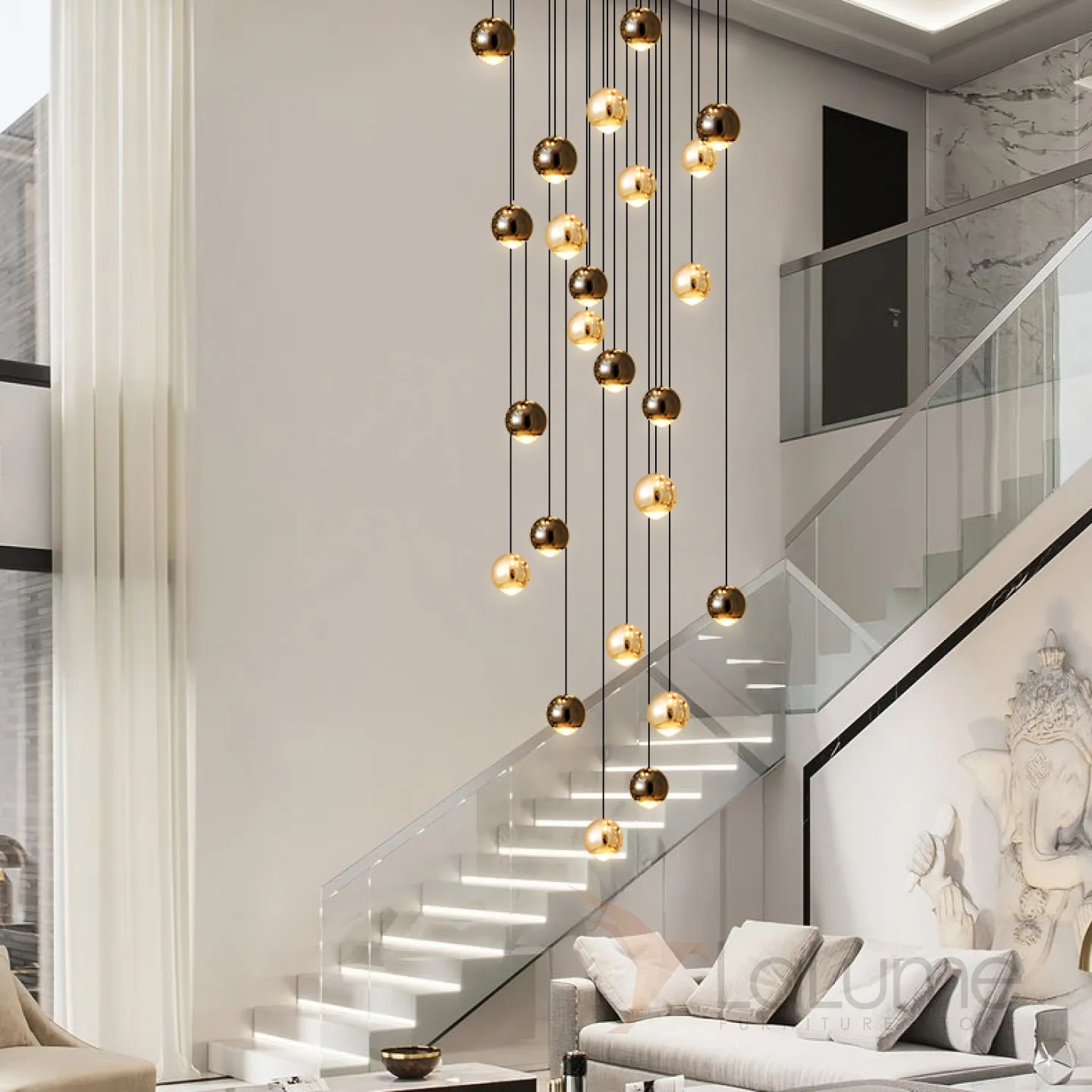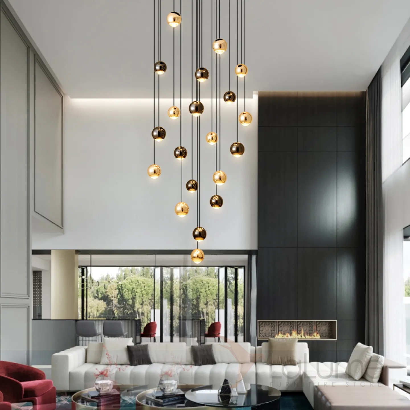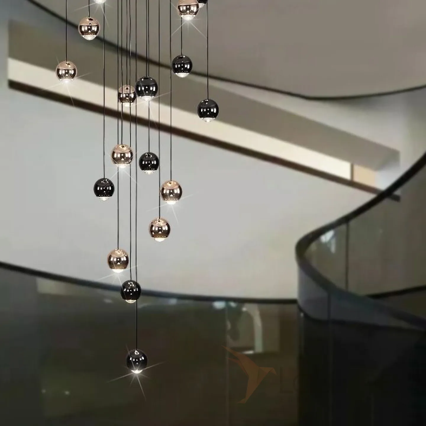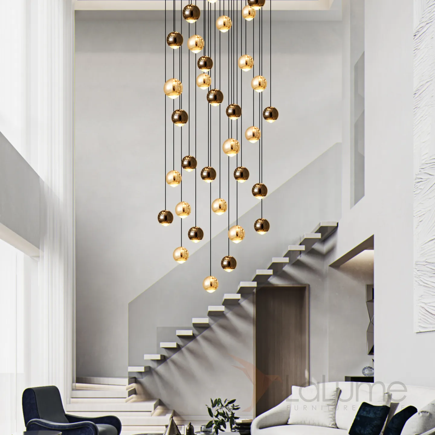 Готовая комбинация подвесных светильников с шарообразными плафонами в цвете латуни и черного жемчуга с линзами из оптического стекла KARA D40