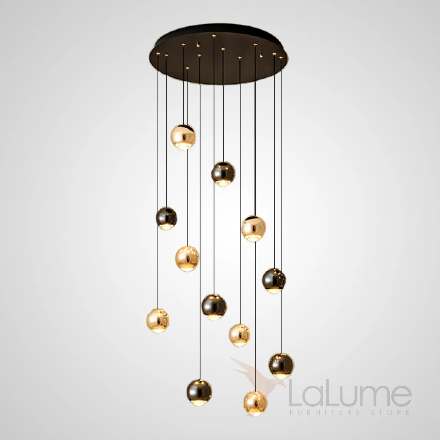 Готовая комбинация подвесных светильников с шарообразными плафонами в цвете латуни и черного жемчуга с линзами из оптического стекла KARA D50