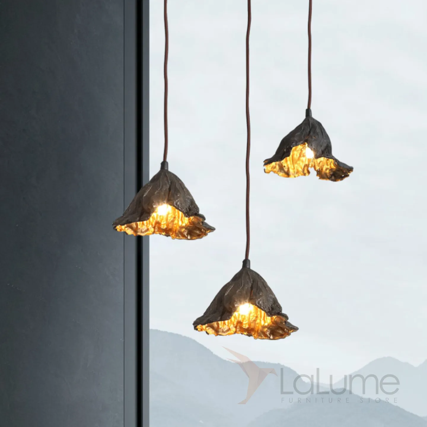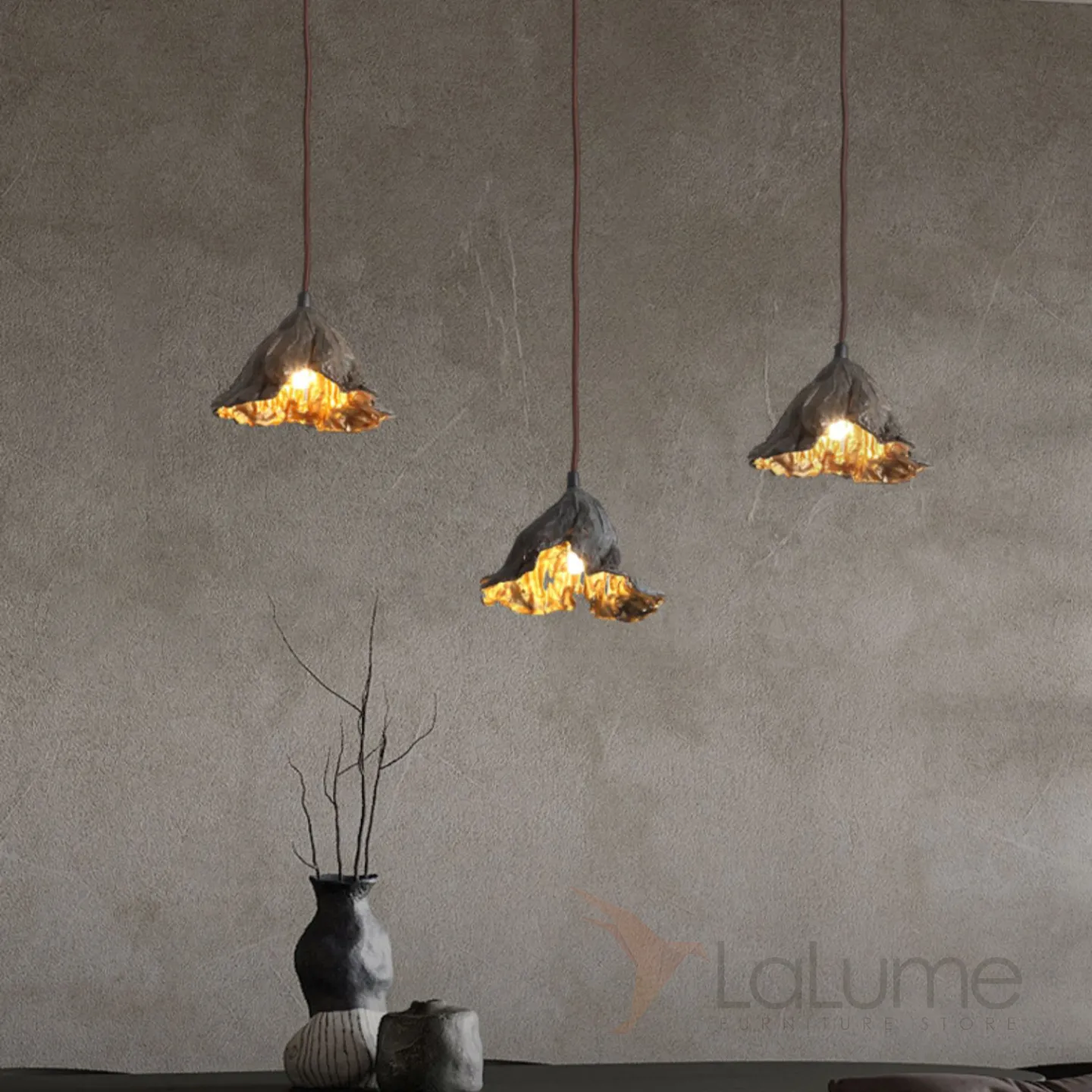 Готовая комбинация подвесных светильников с тремя плафонами в виде высушенных цветов с внутренней отделкой под золото LILIAN TRIO