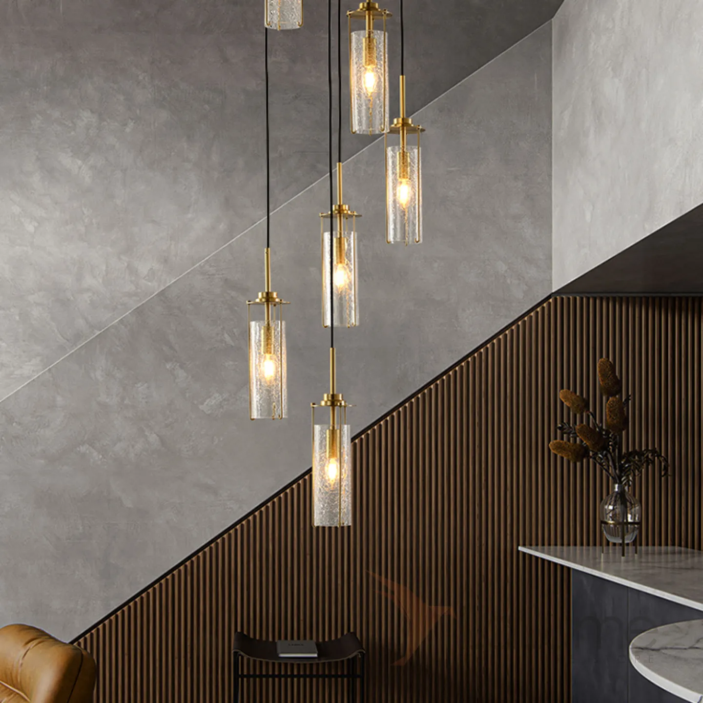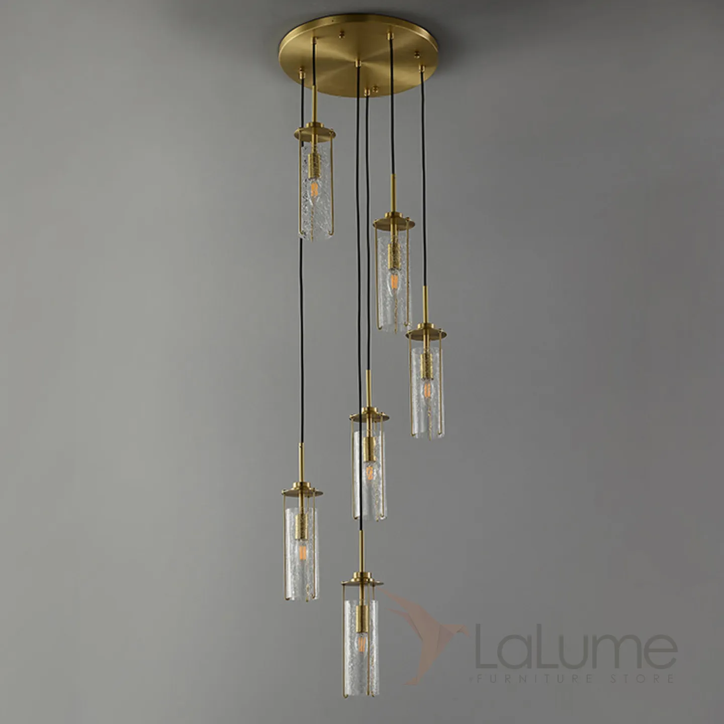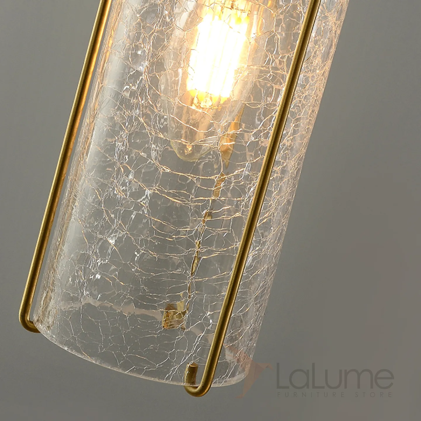 Готовая комбинация подвесных светильников с цилиндрическими плафонами из кракелированного стекла в металлических держателях GABRIELLA MORE