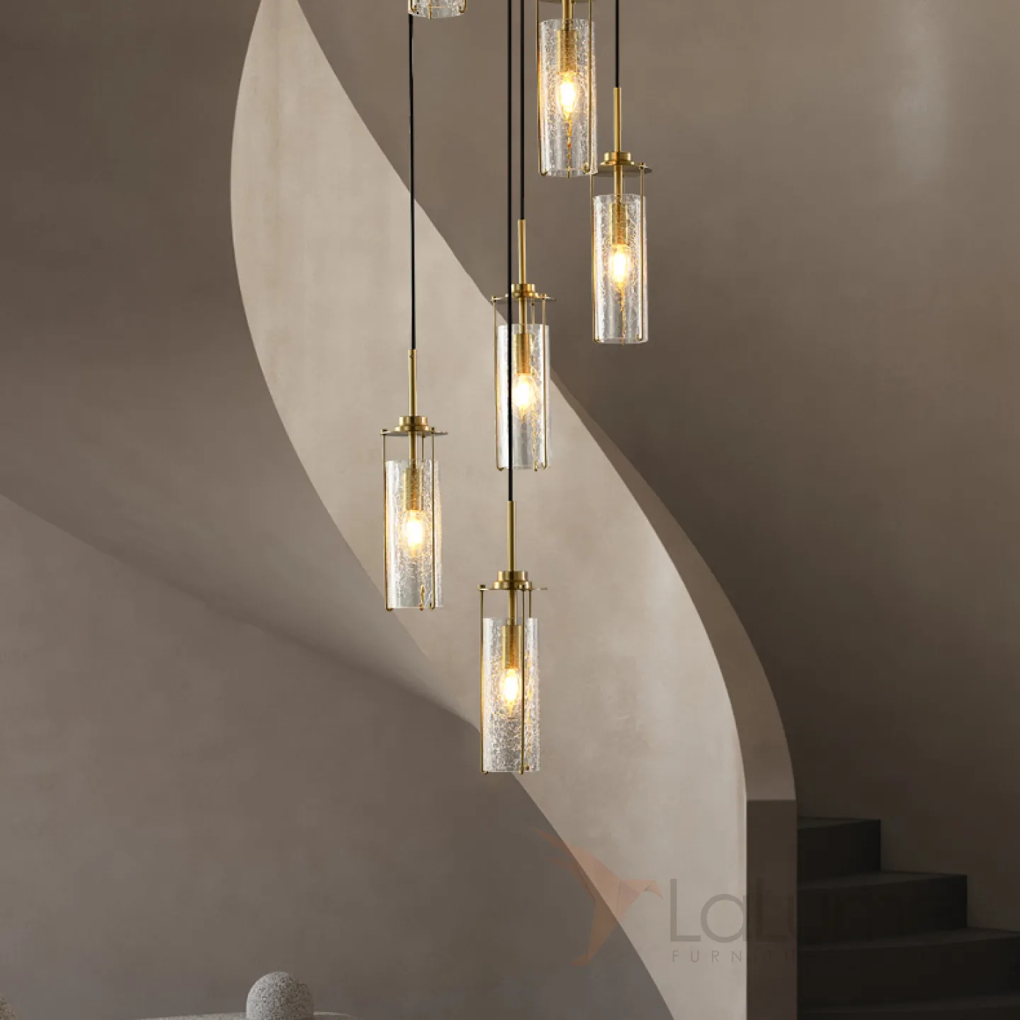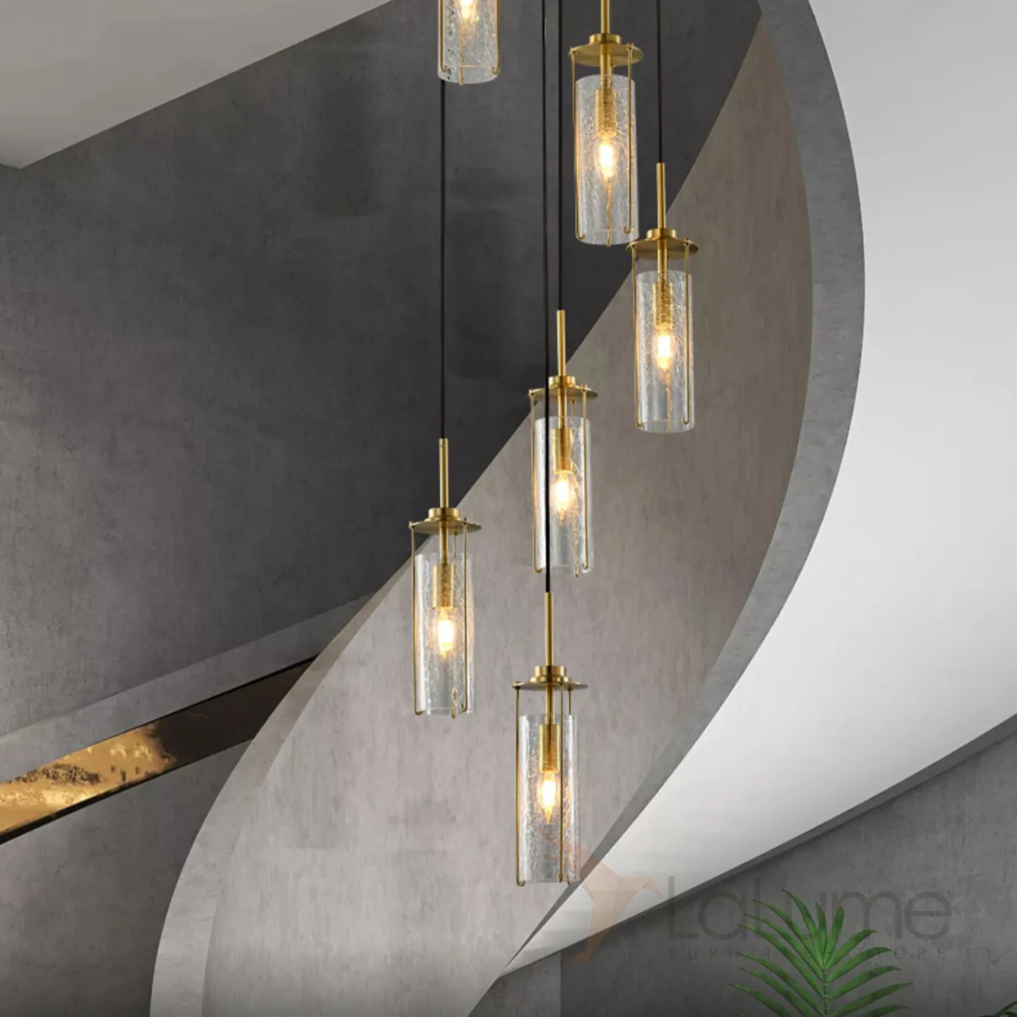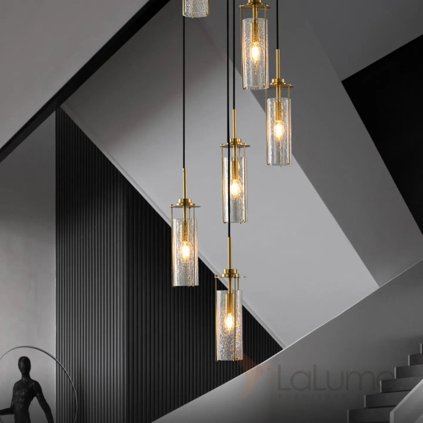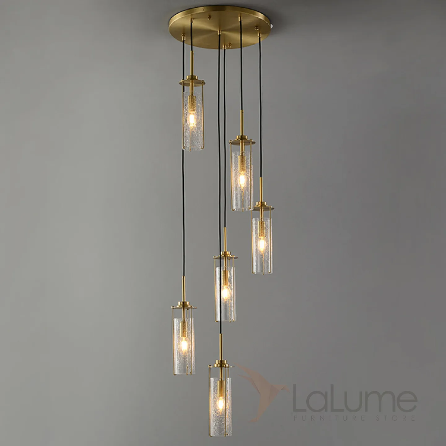 Готовая комбинация подвесных светильников с цилиндрическими плафонами из кракелированного стекла в металлических держателях GABRIELLA MORE