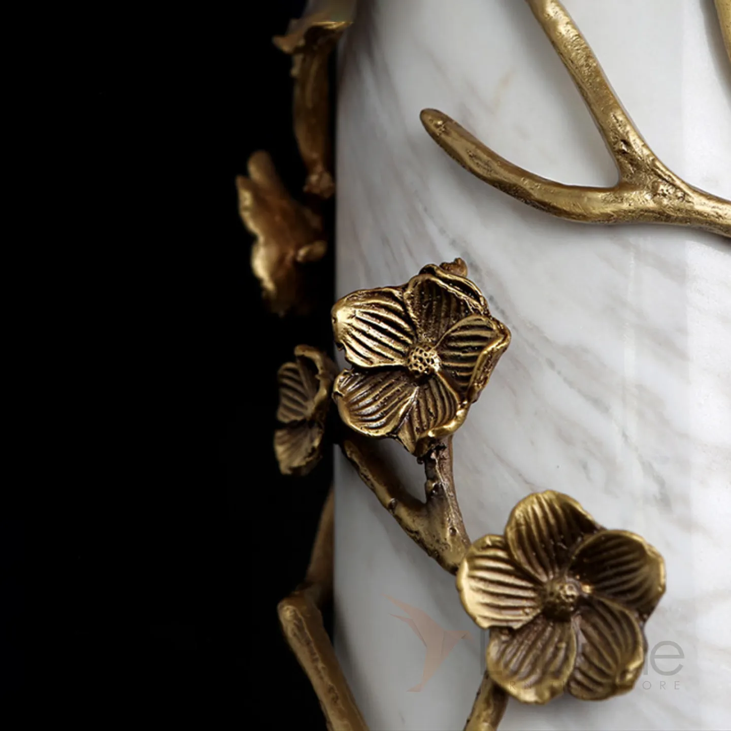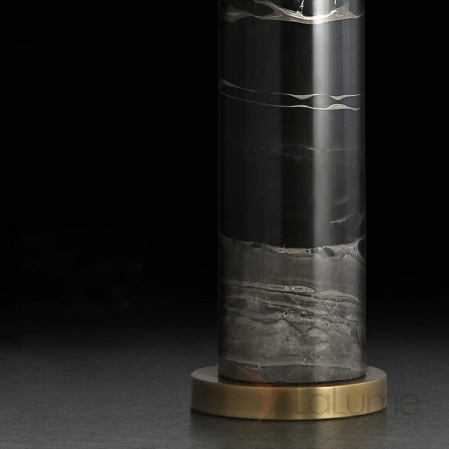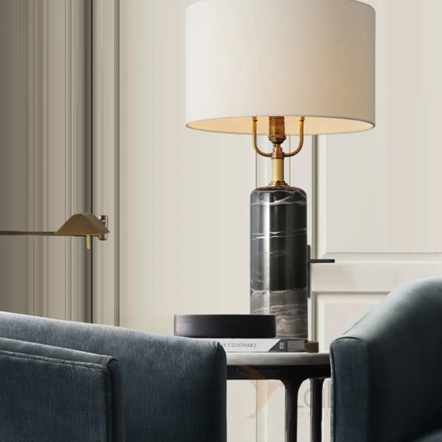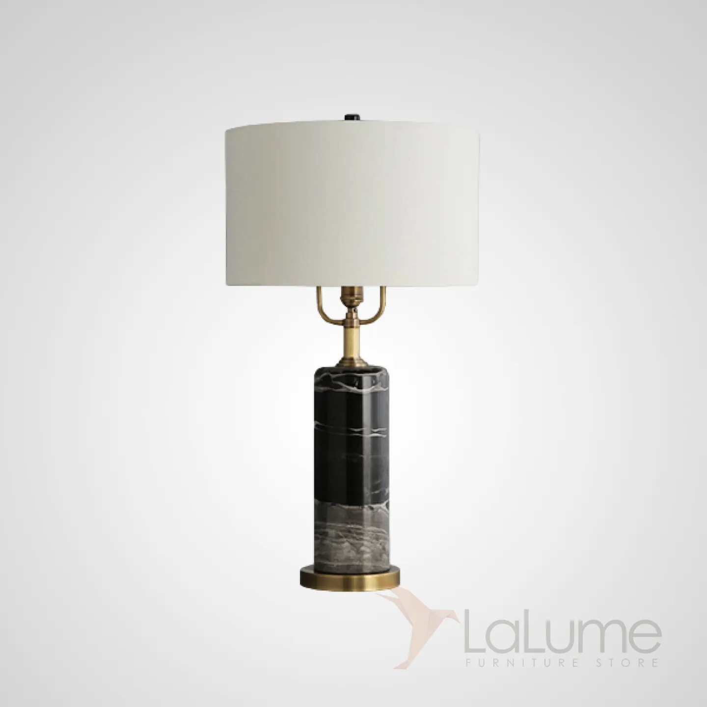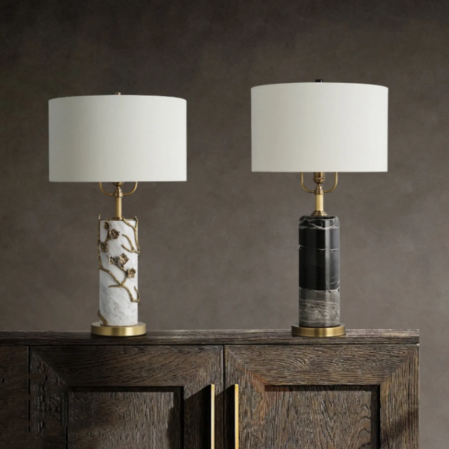 Серия настольных светильников с белым текстильным абажуром и цилиндрическим основанием из светлого и темного мрамора ALISHA A