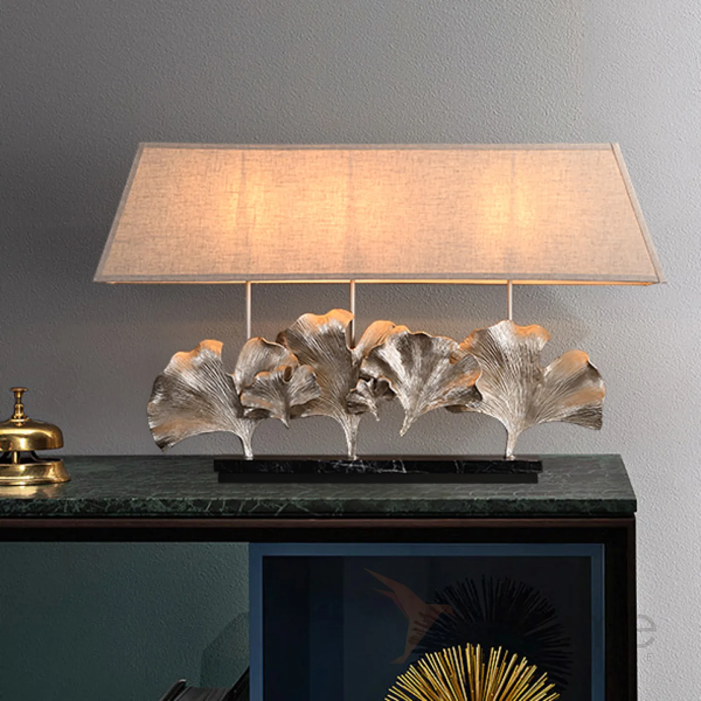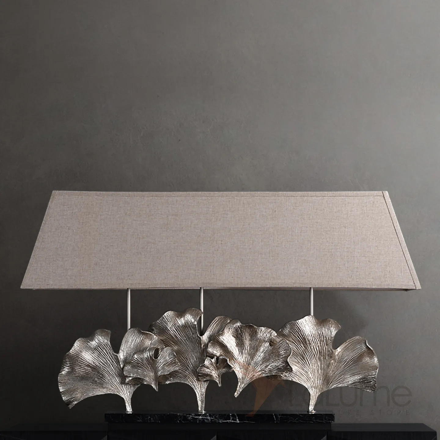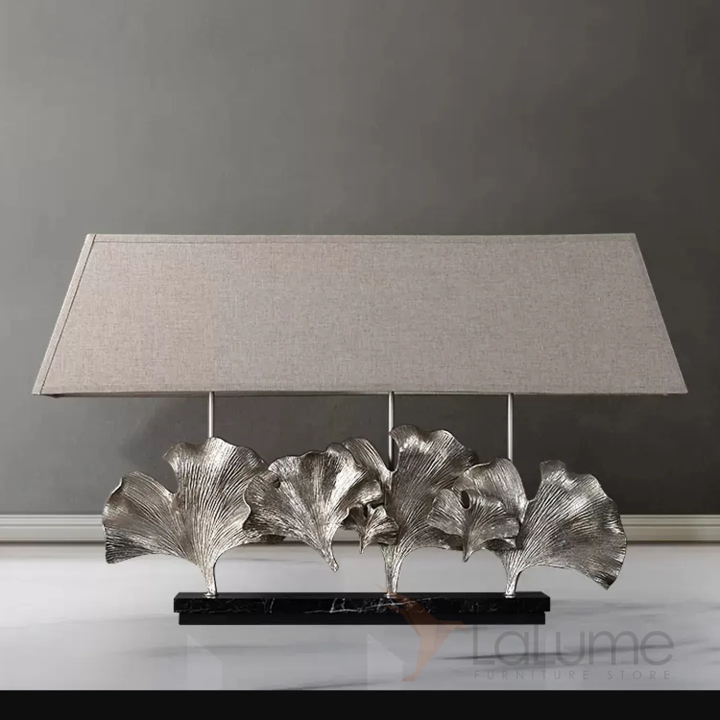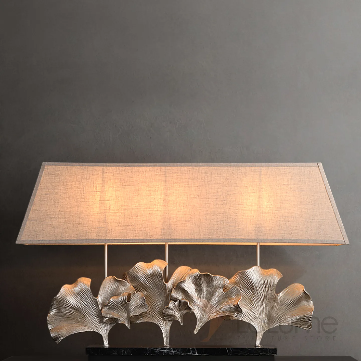 Серия настольных ламп с трапециевидным текстильным абажуром и декором в виде хромированных листьев гинкго на мраморном основании PHILOMENA L75