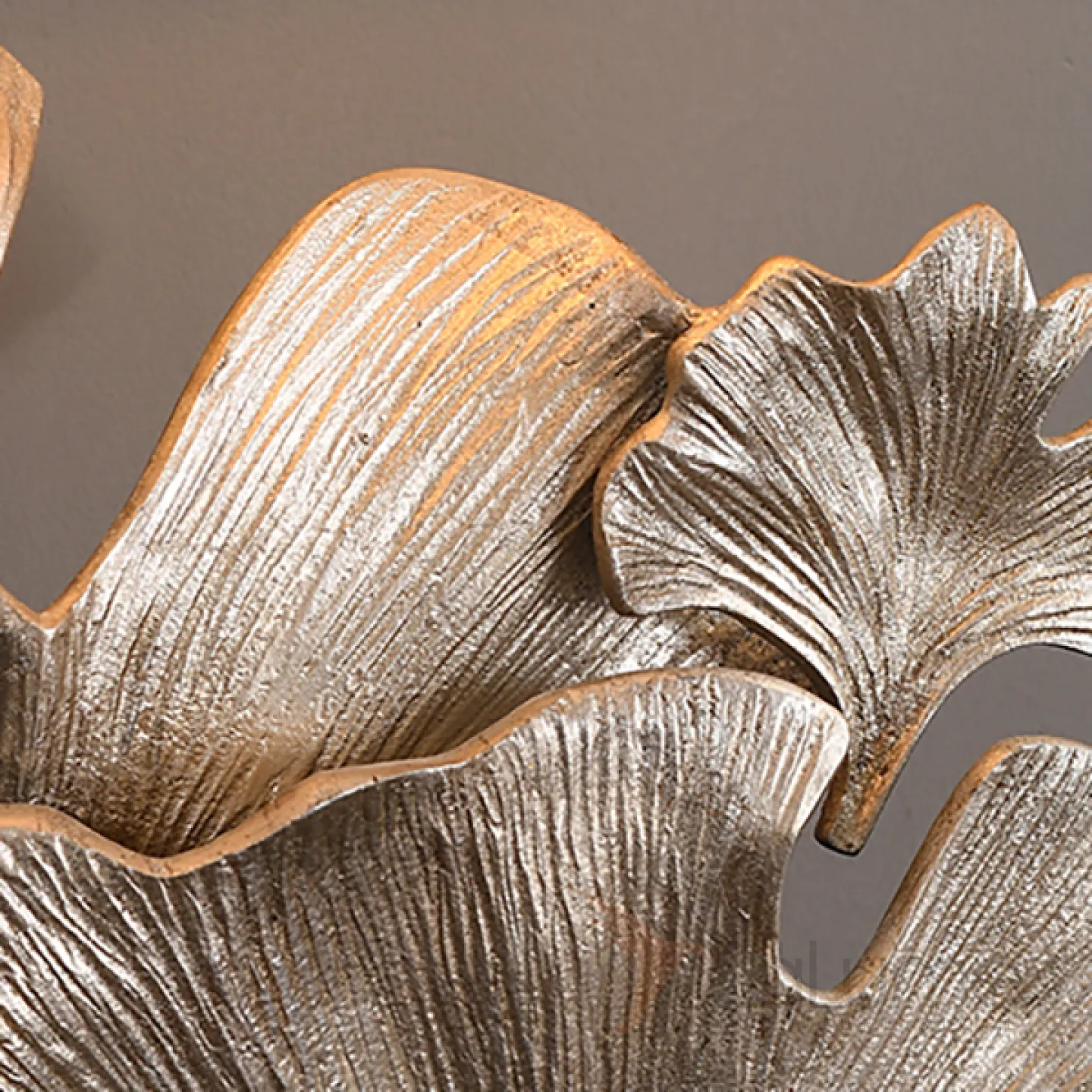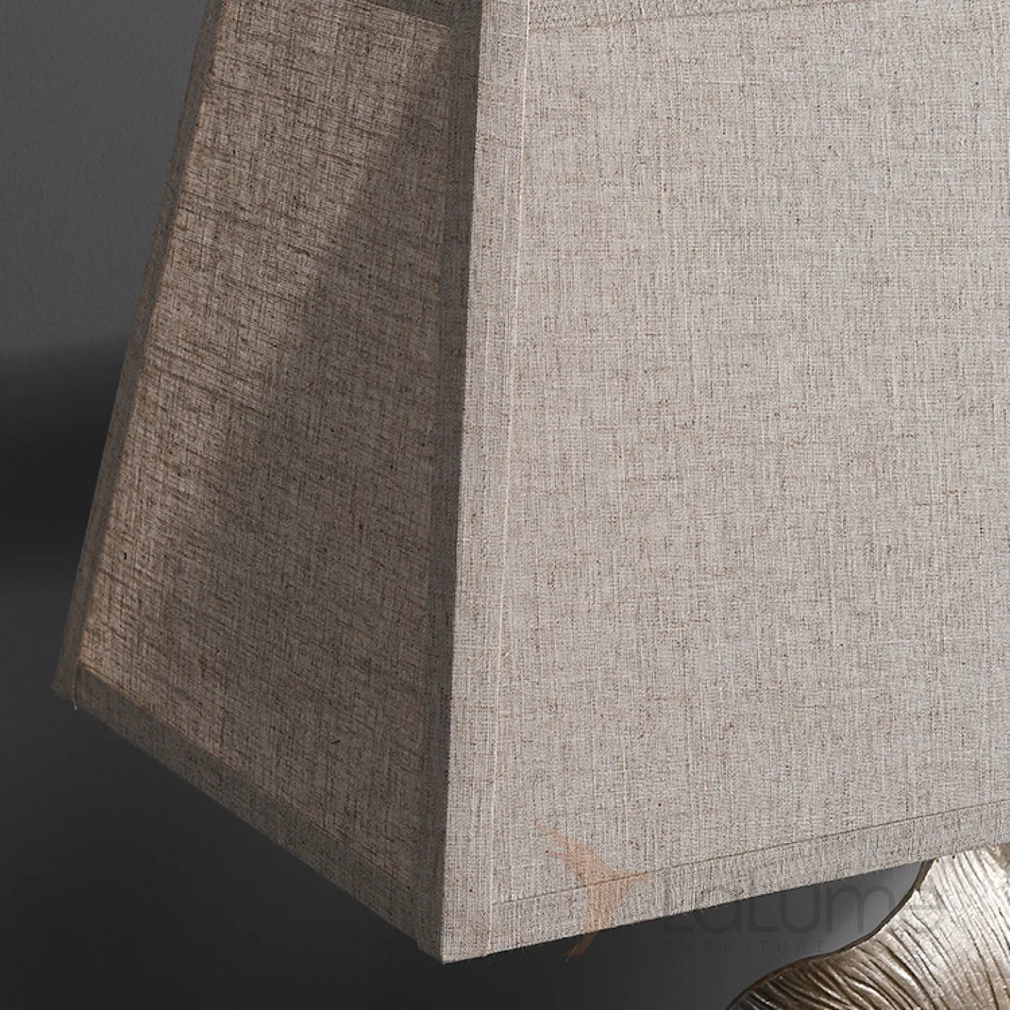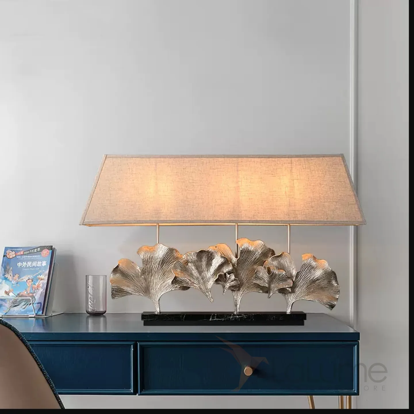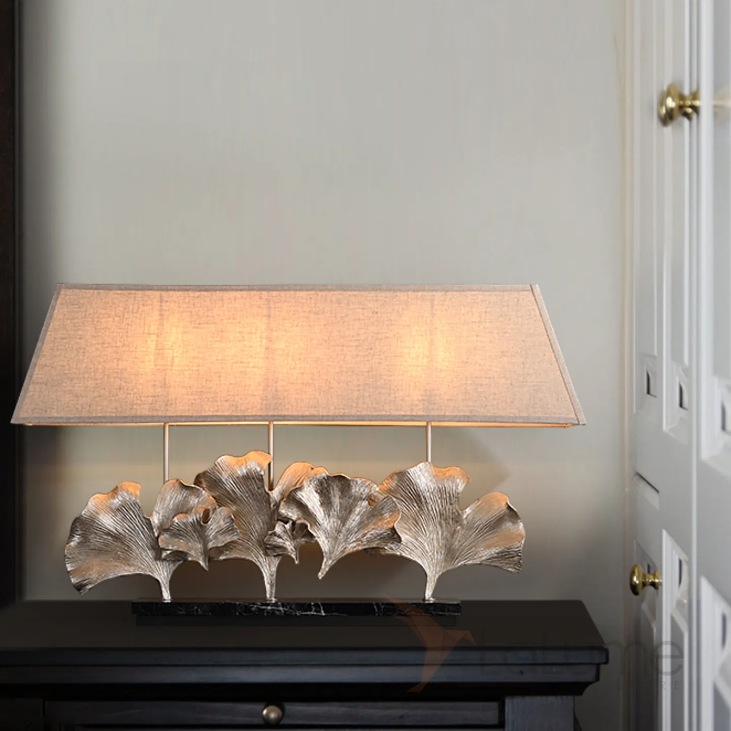 Серия настольных ламп с трапециевидным текстильным абажуром и декором в виде хромированных листьев гинкго на мраморном основании PHILOMENA L75