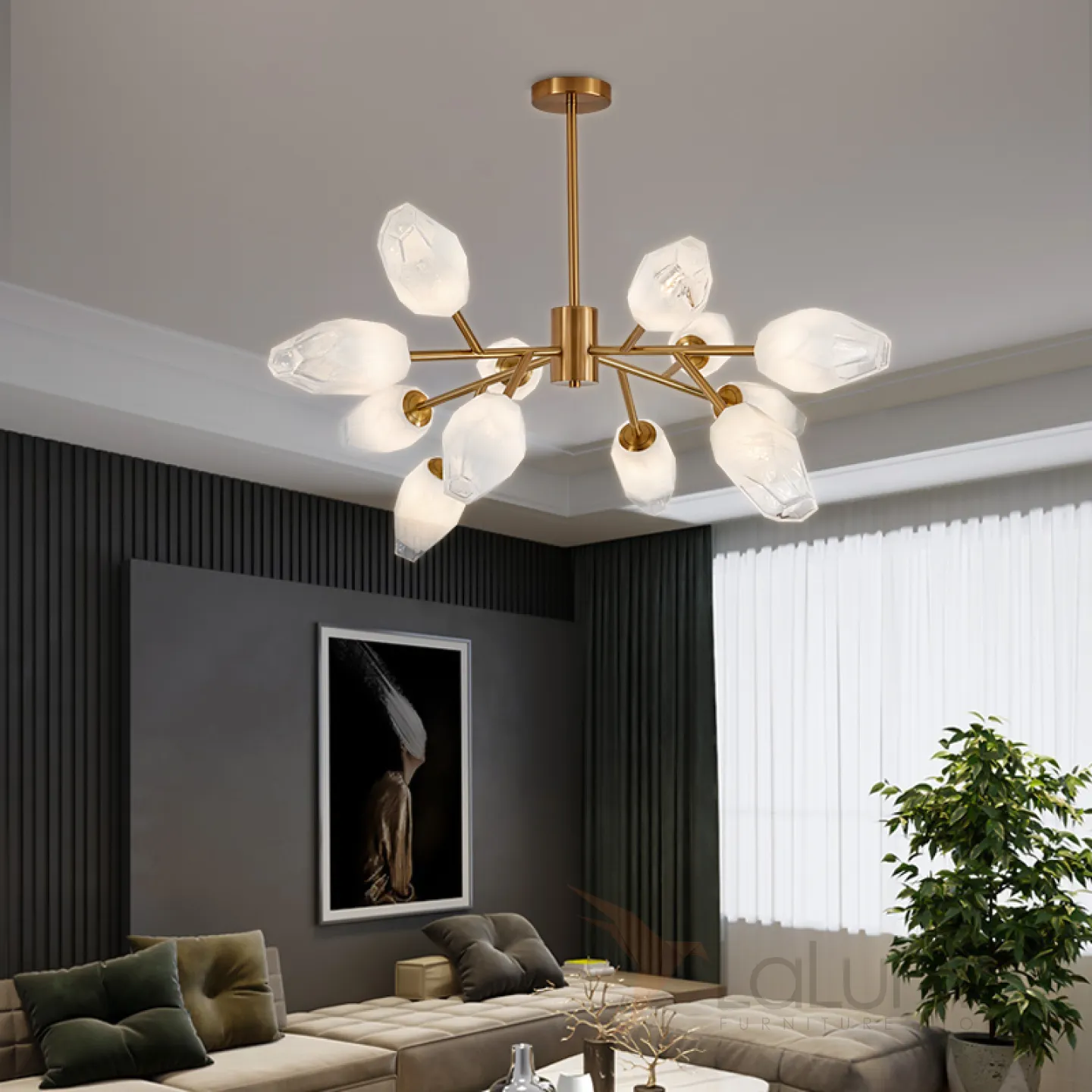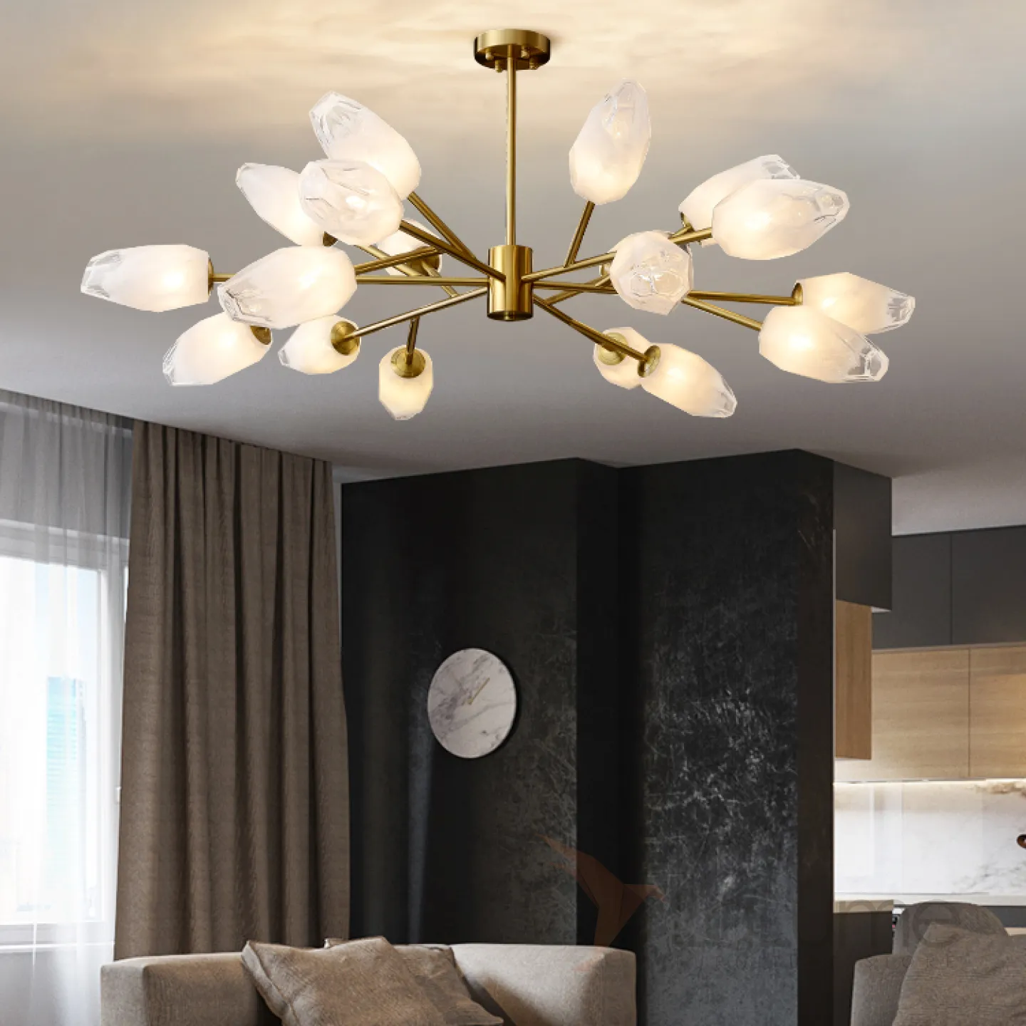 Люстра со стеклянными плафонами в форме полупрозрачных неограненных кристаллов на ветвистом каркасе SELESTE