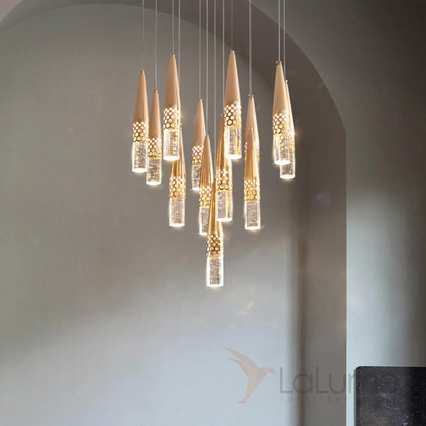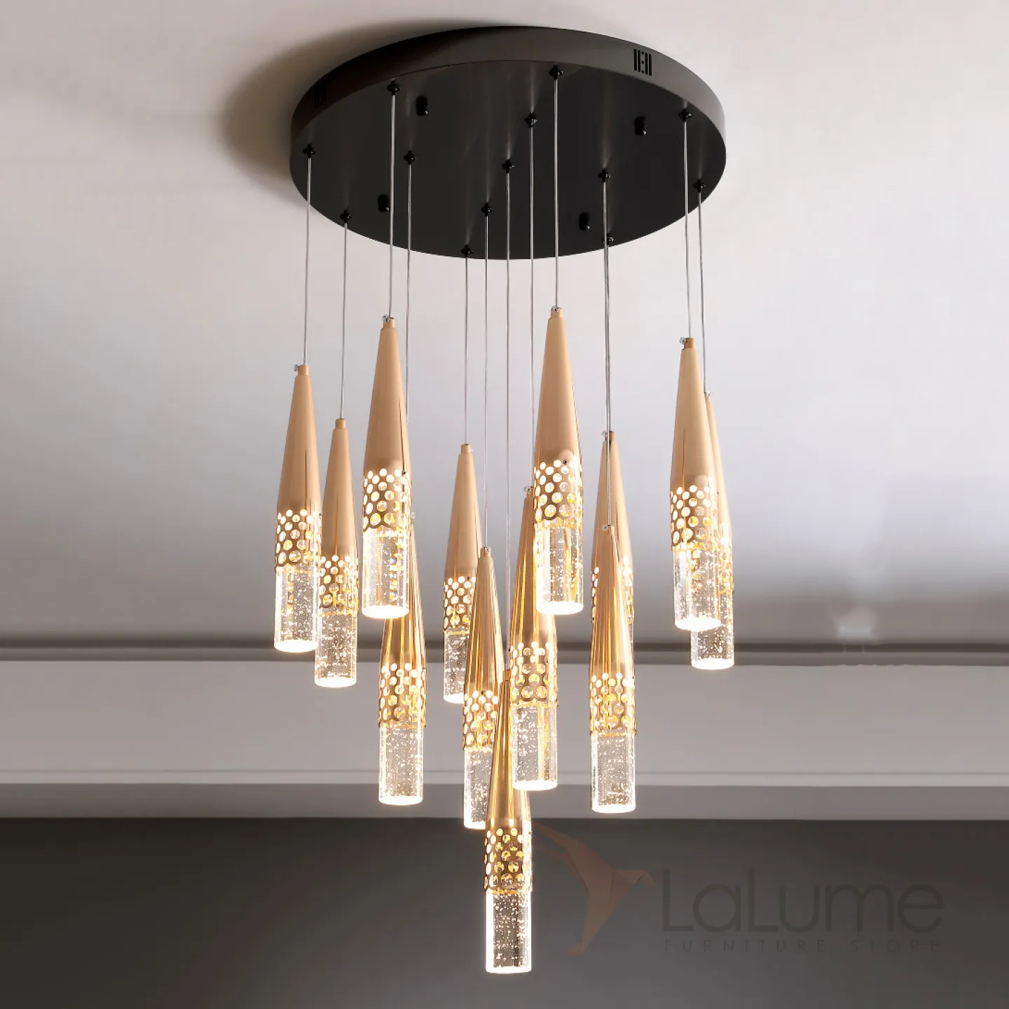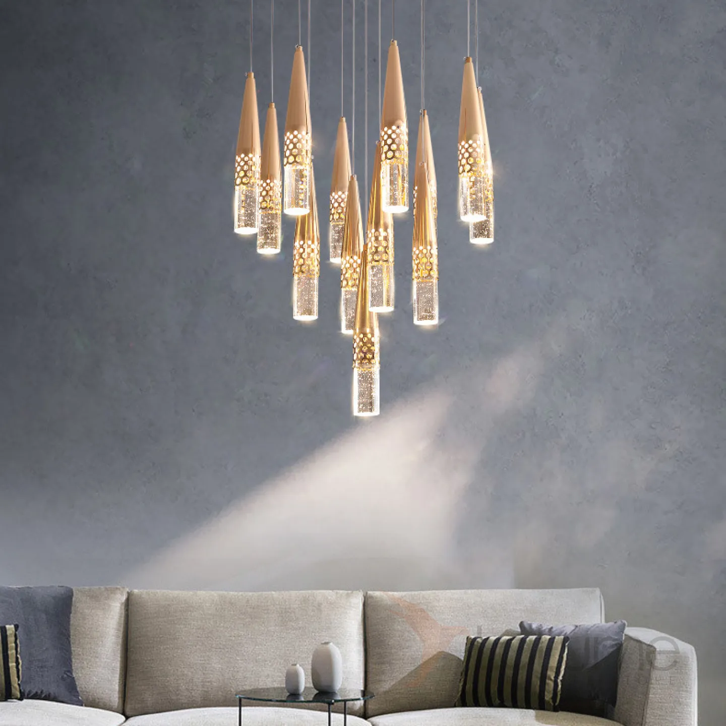Готовая комбинация подвесных светодиодных светильников с хрустальными рассеивателями в коническом корпусе с перфорацией ICARUS MORE