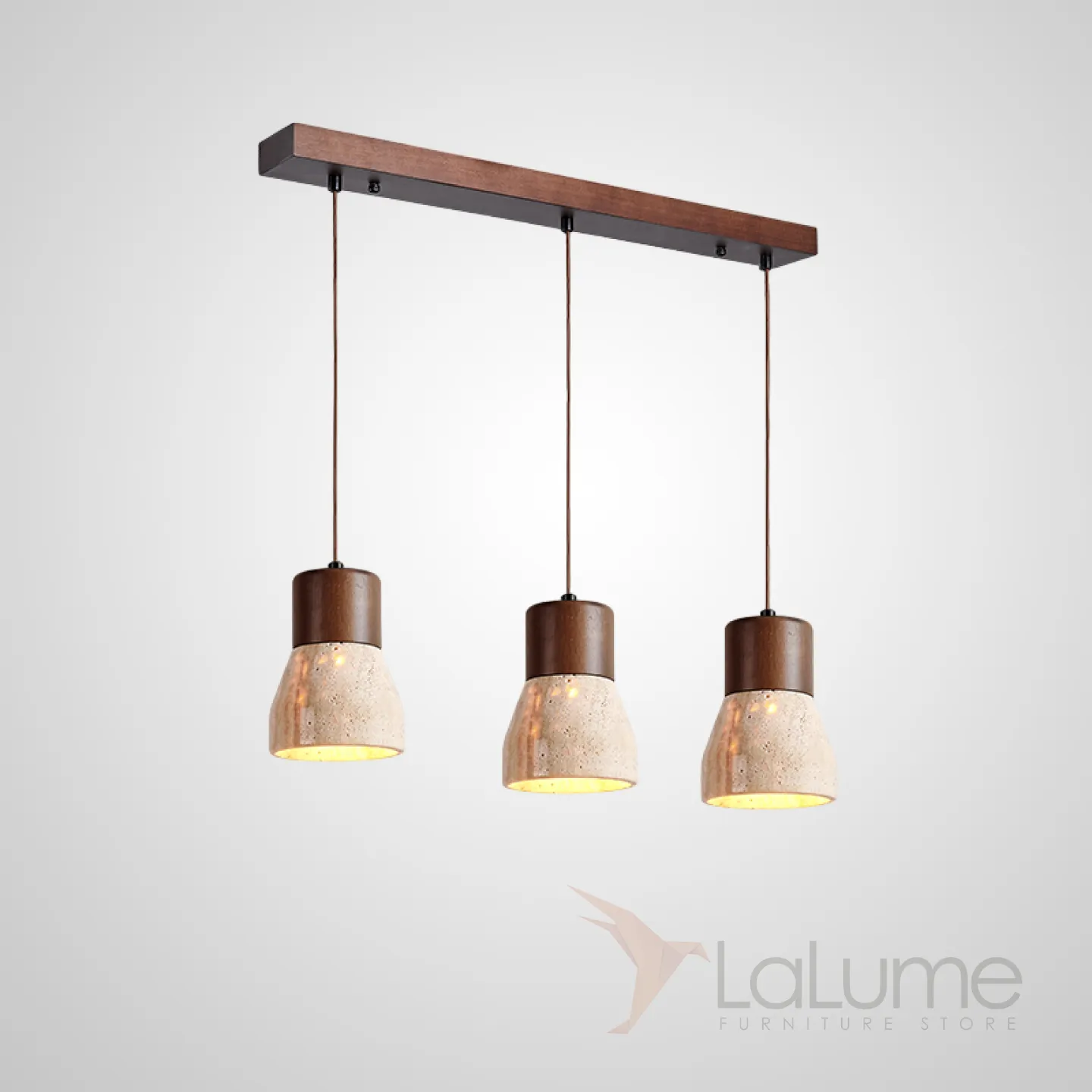 Готовая комбинация подвесных светильников с геометрическими плафонами из камня травертина с деревянной отделкой MELIUS TRIO A Dark brown Планка