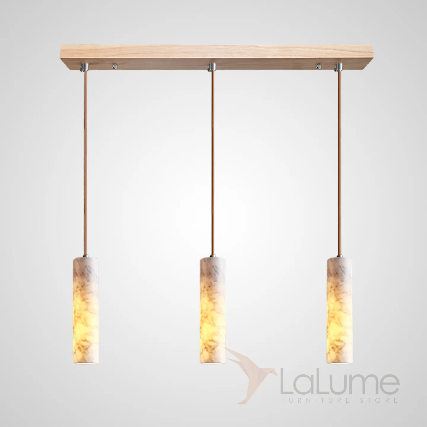 Готовая комбинация подвесных светильников с цилиндрическим корпусом из белого мрамора и деревянным креплением REOR COMBO A L3 Планка