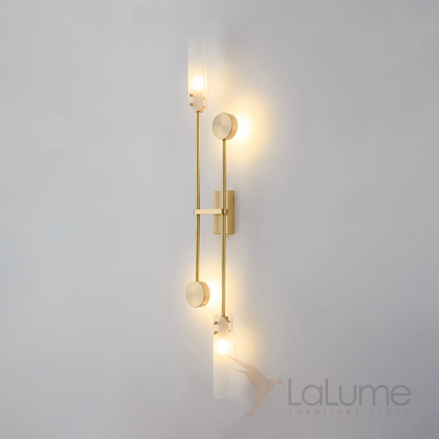 Серия настенных светильников со стеклянными плафонами и круглыми спотами на двух вертикальных штангах ANDREAS Brass White