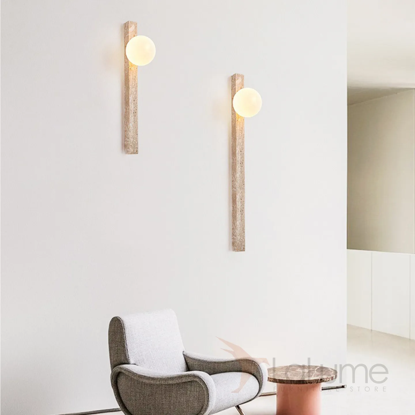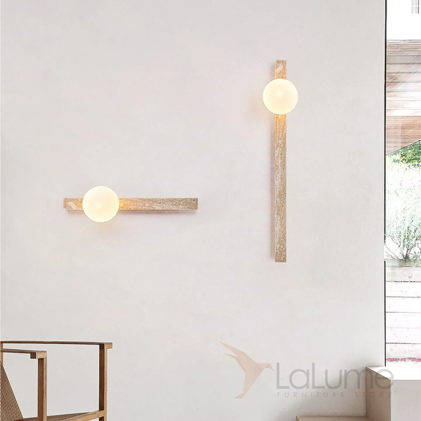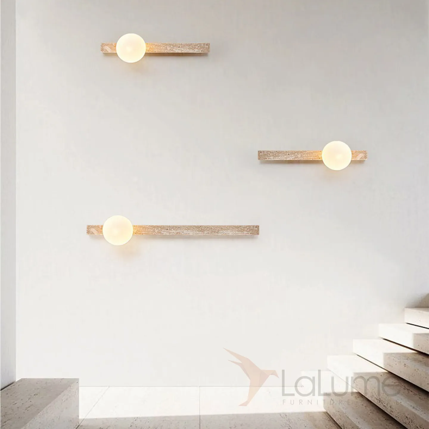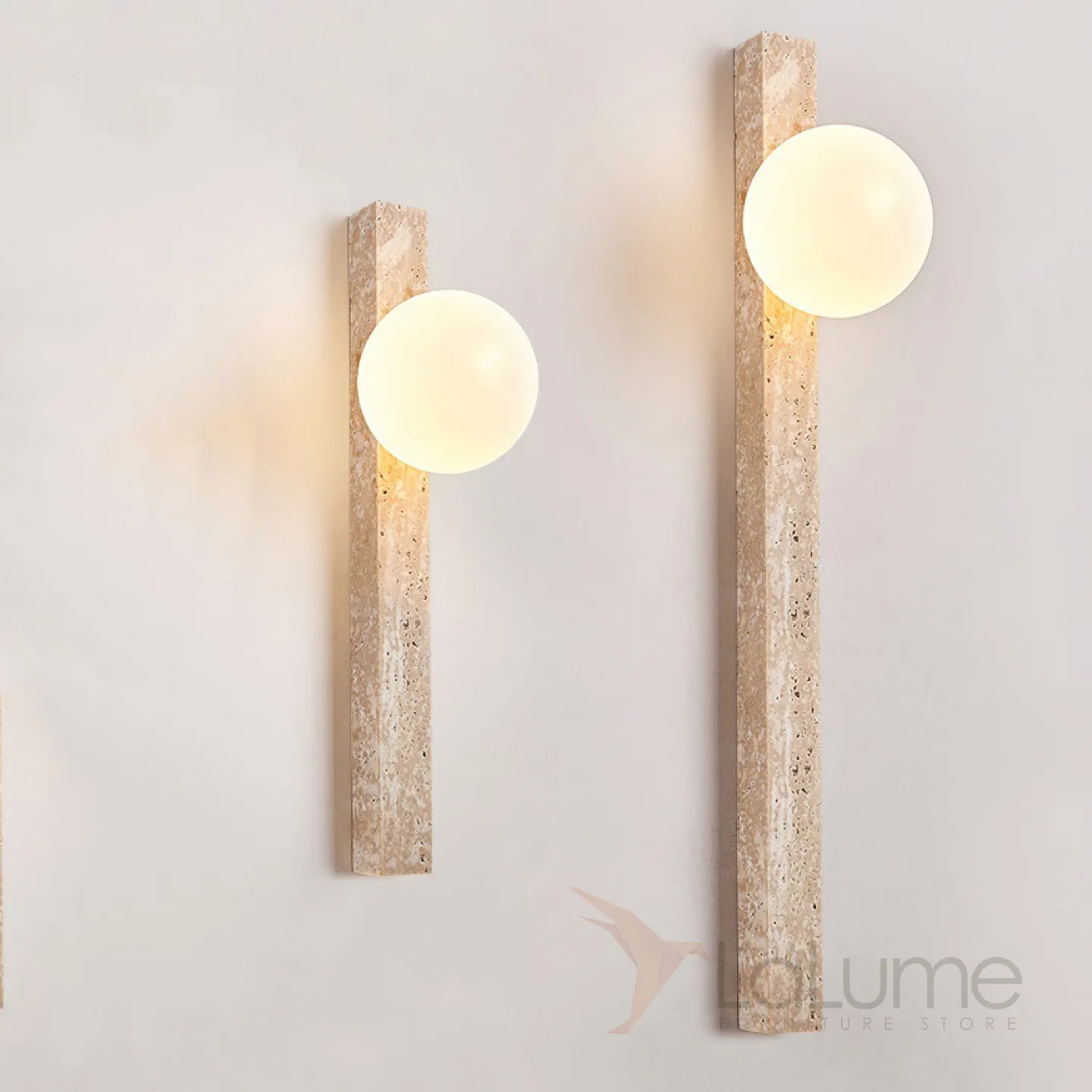 Серия настенных светильников с вытянутым прямоугольным корпусом из камня и шарообразным плафоном OBBE A L120