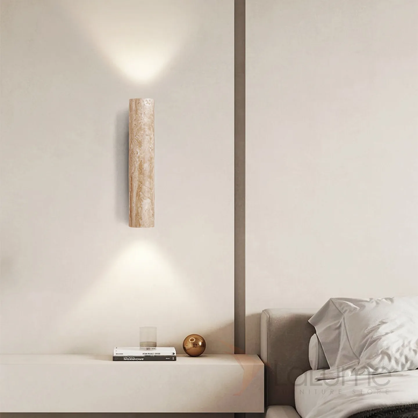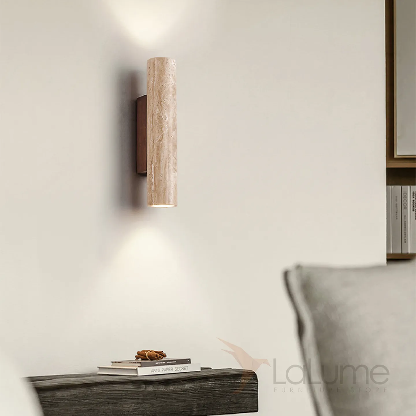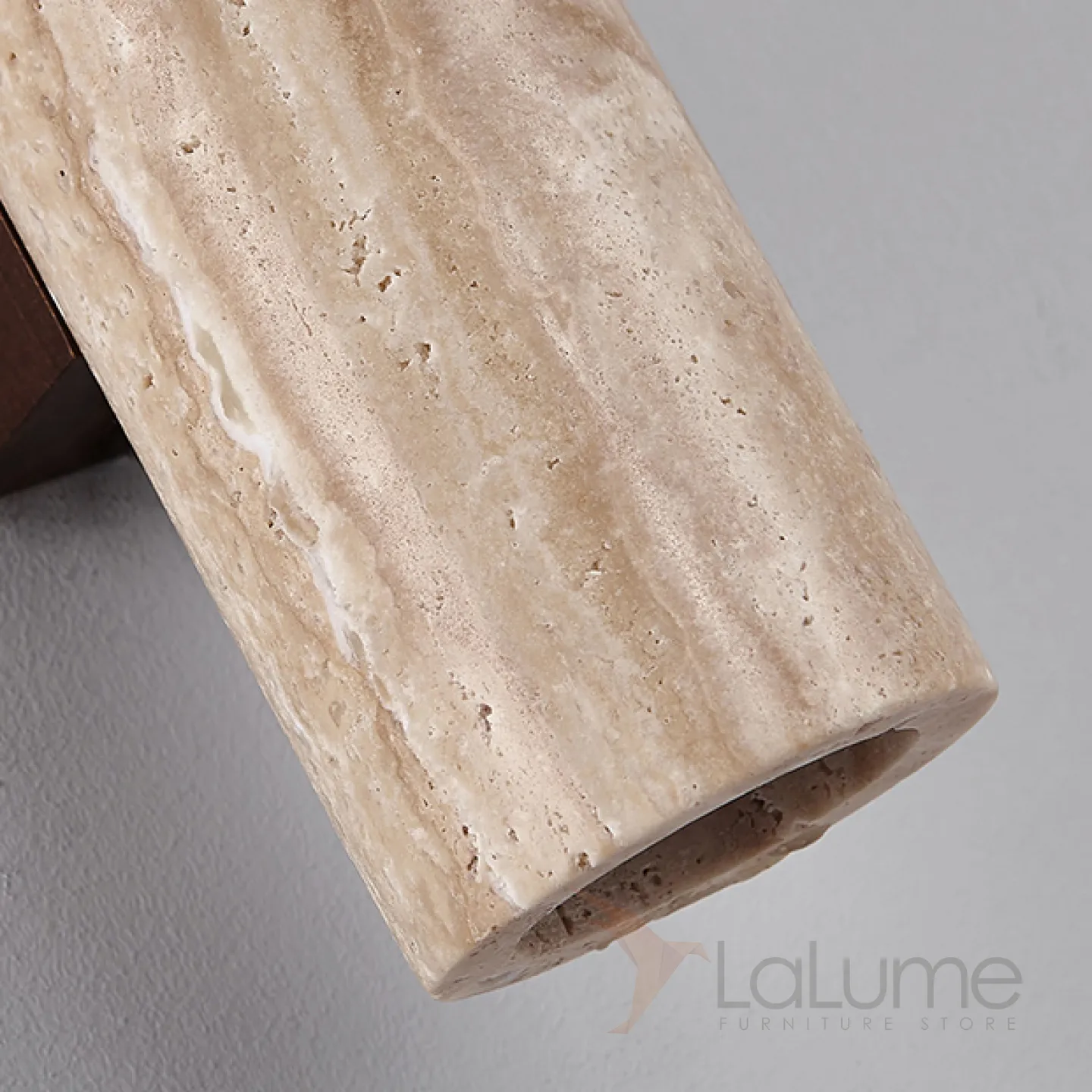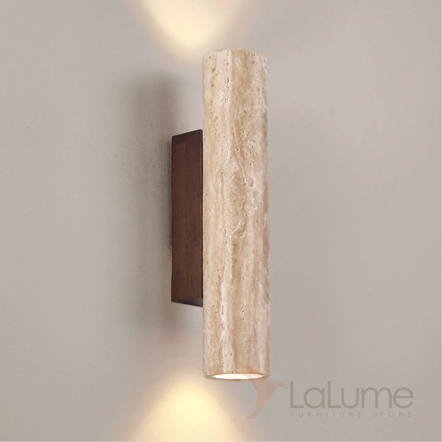 Бра с цилиндрическим корпусом из камня травертина на прямоугольном креплении из темного дерева LUBBE