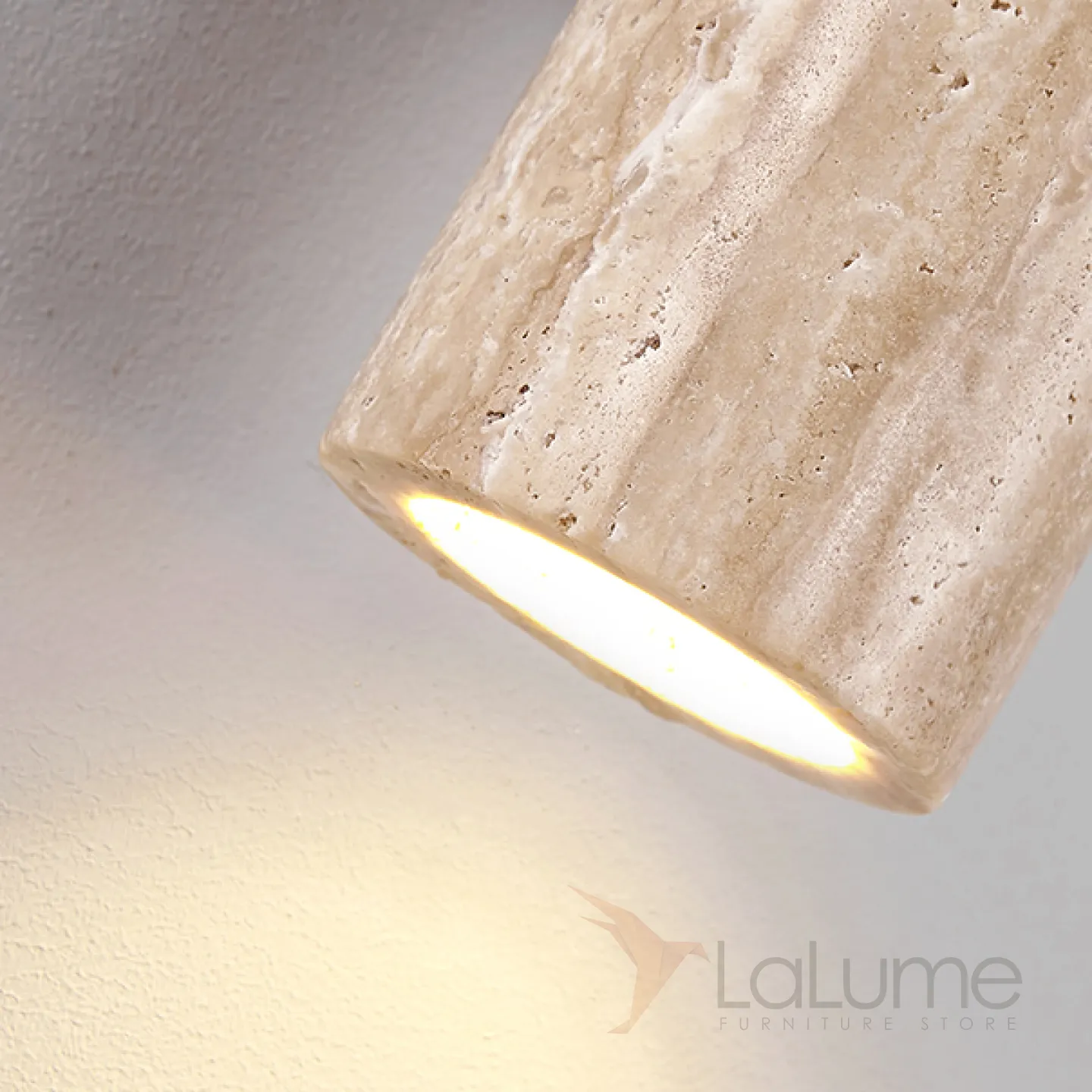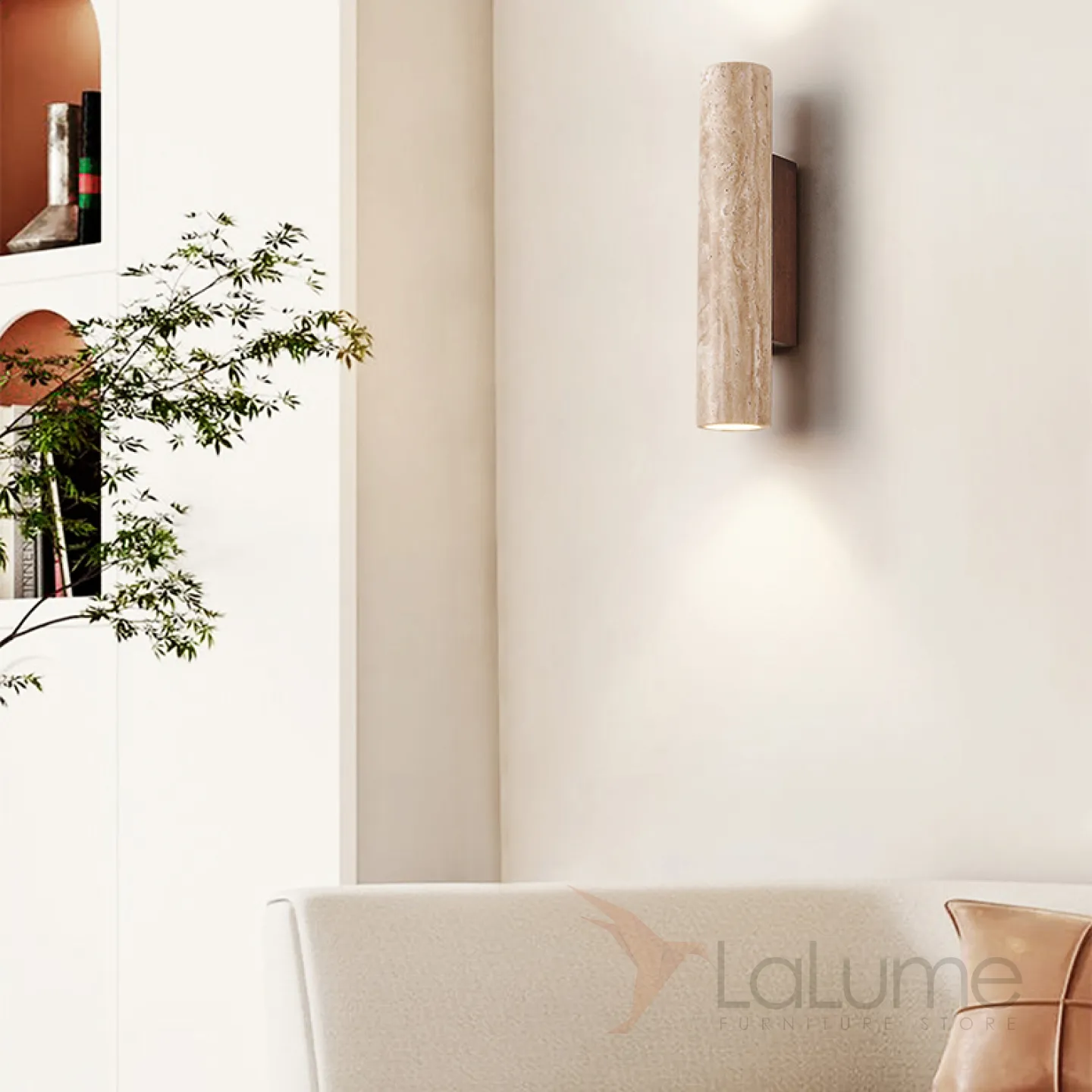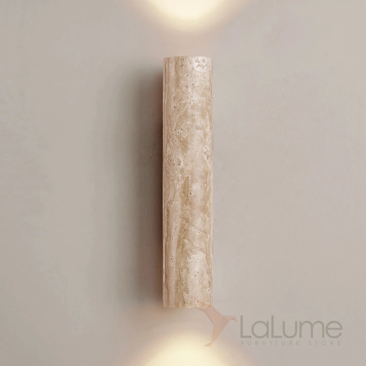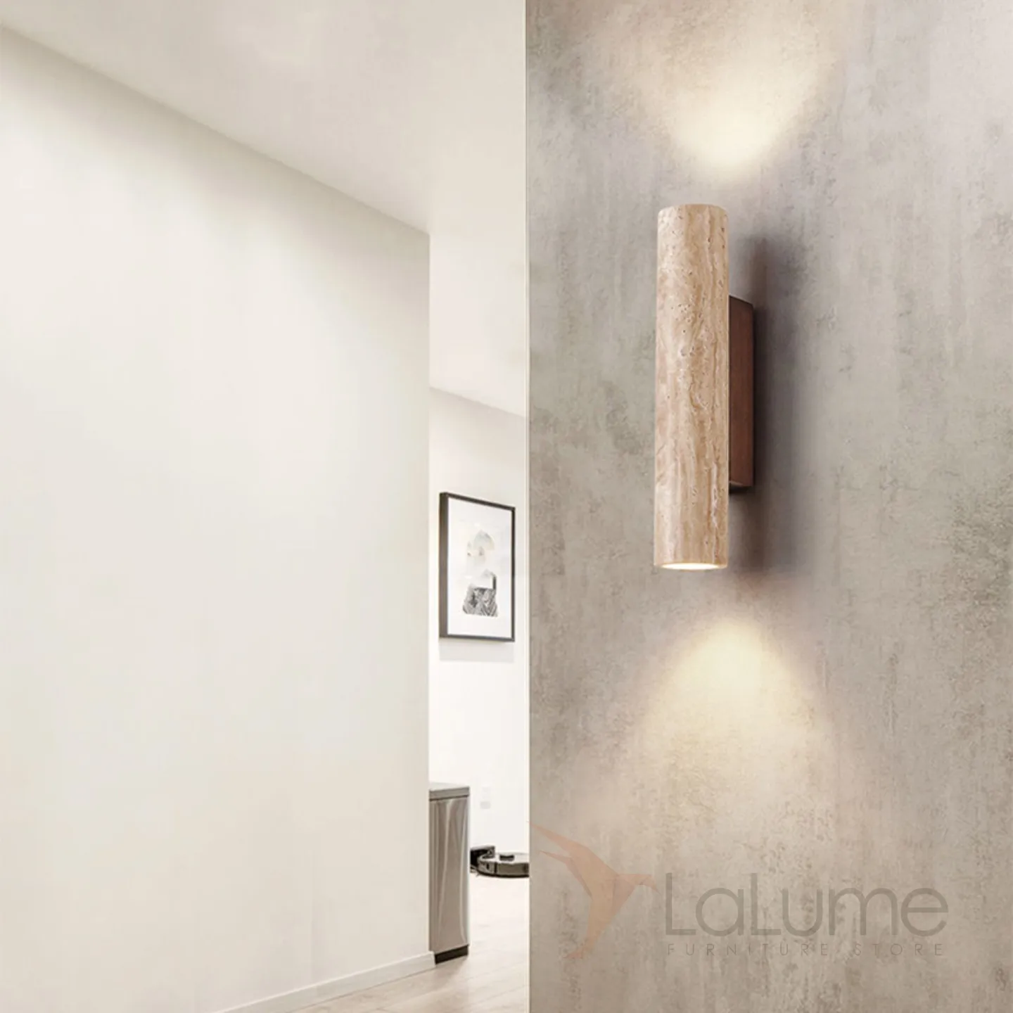 Бра с цилиндрическим корпусом из камня травертина на прямоугольном креплении из темного дерева LUBBE