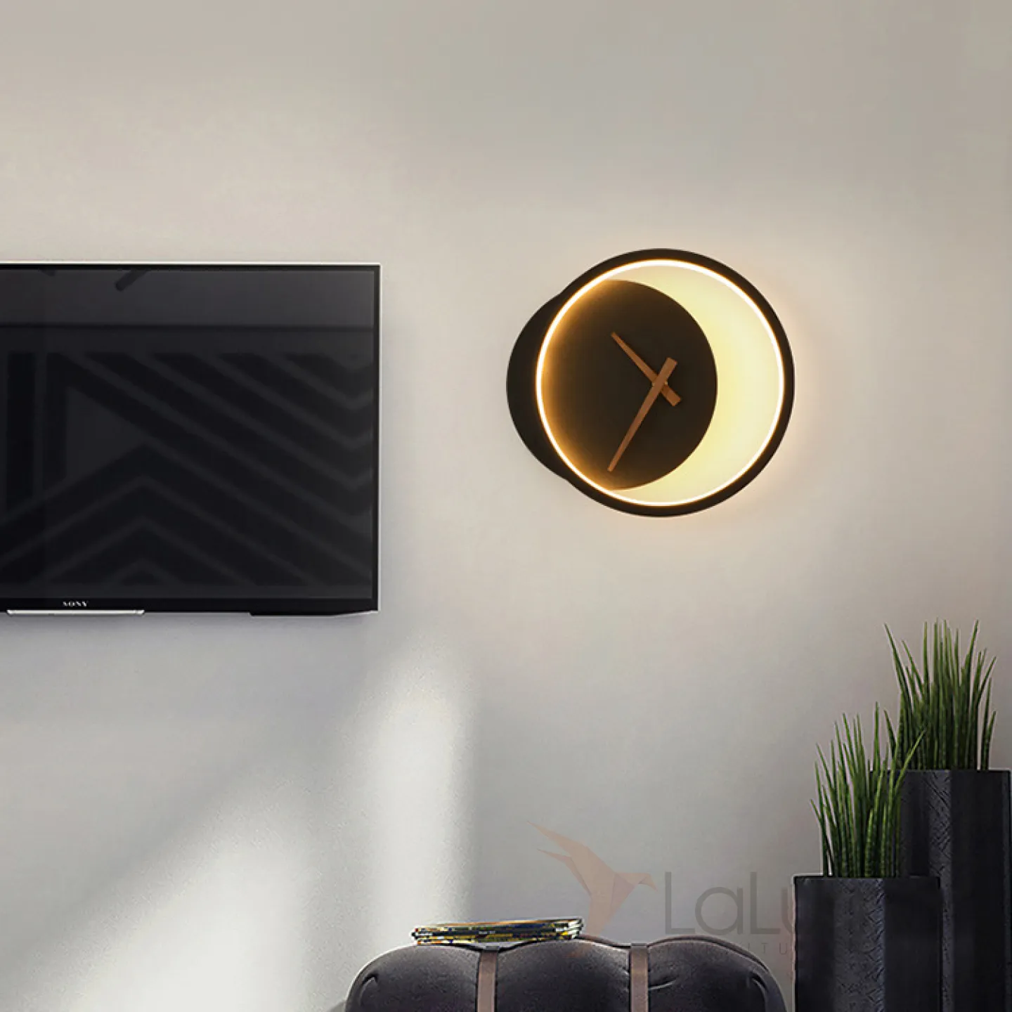Серия настенных светодиодных светильников в виде комбинации светового кольца и диска с часовым механизмом CLOCK Black 3000К