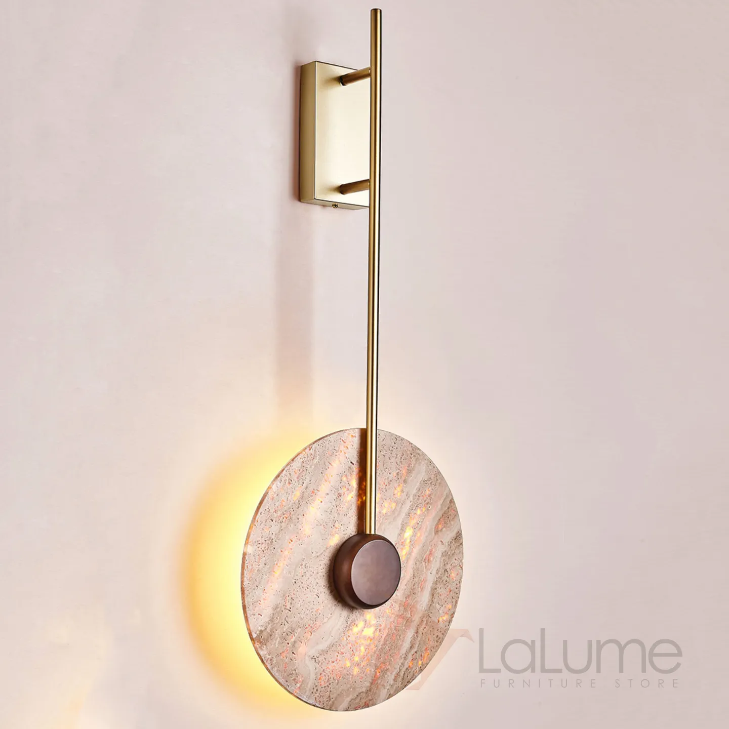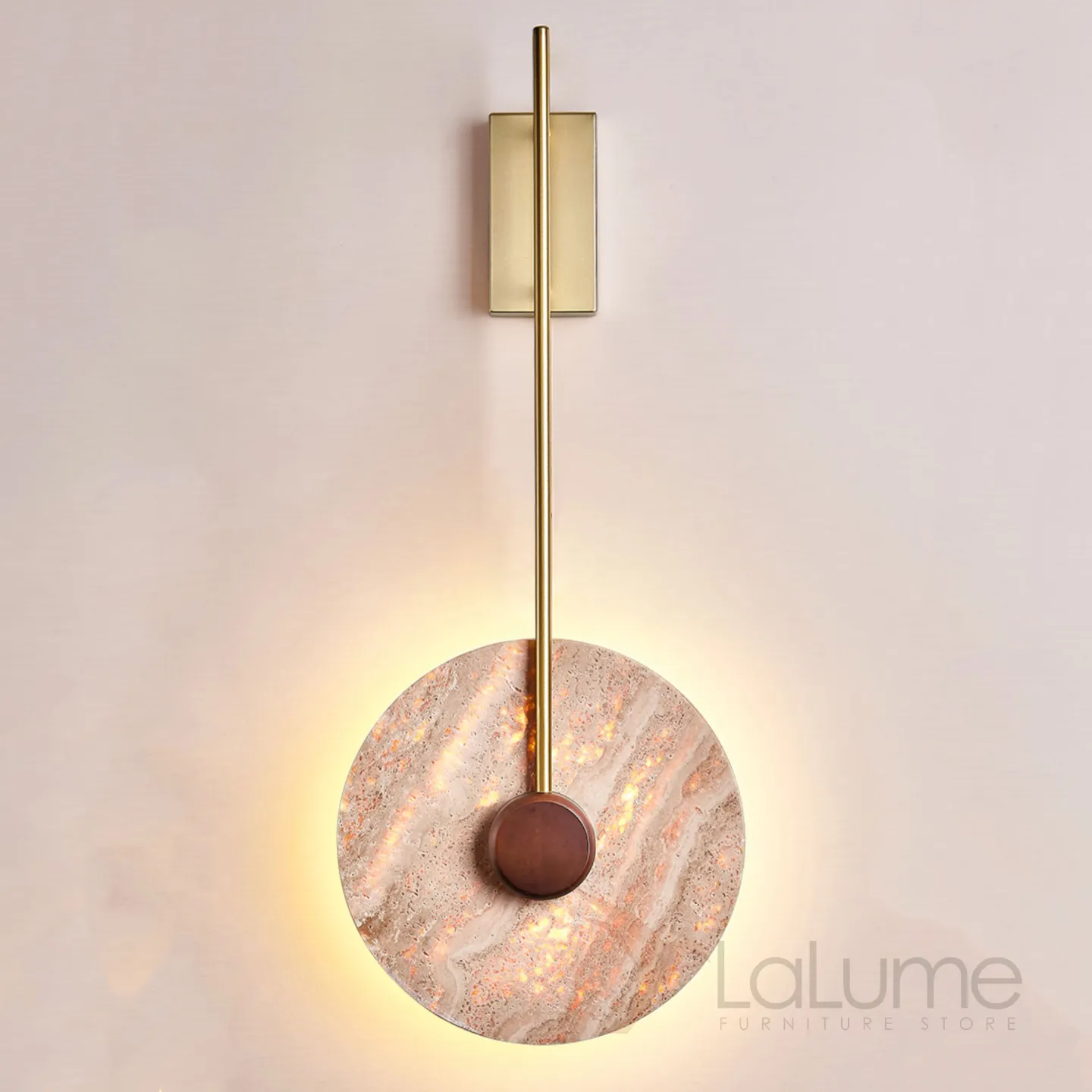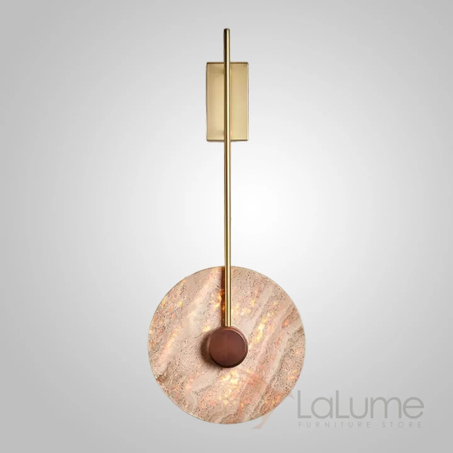 Настенный светодиодный светильник с плоским дисковидным рассеивателем с каменной текстурой и деревянным центром JOAR D30 Brass