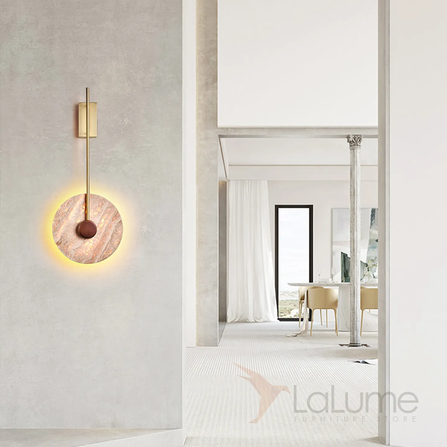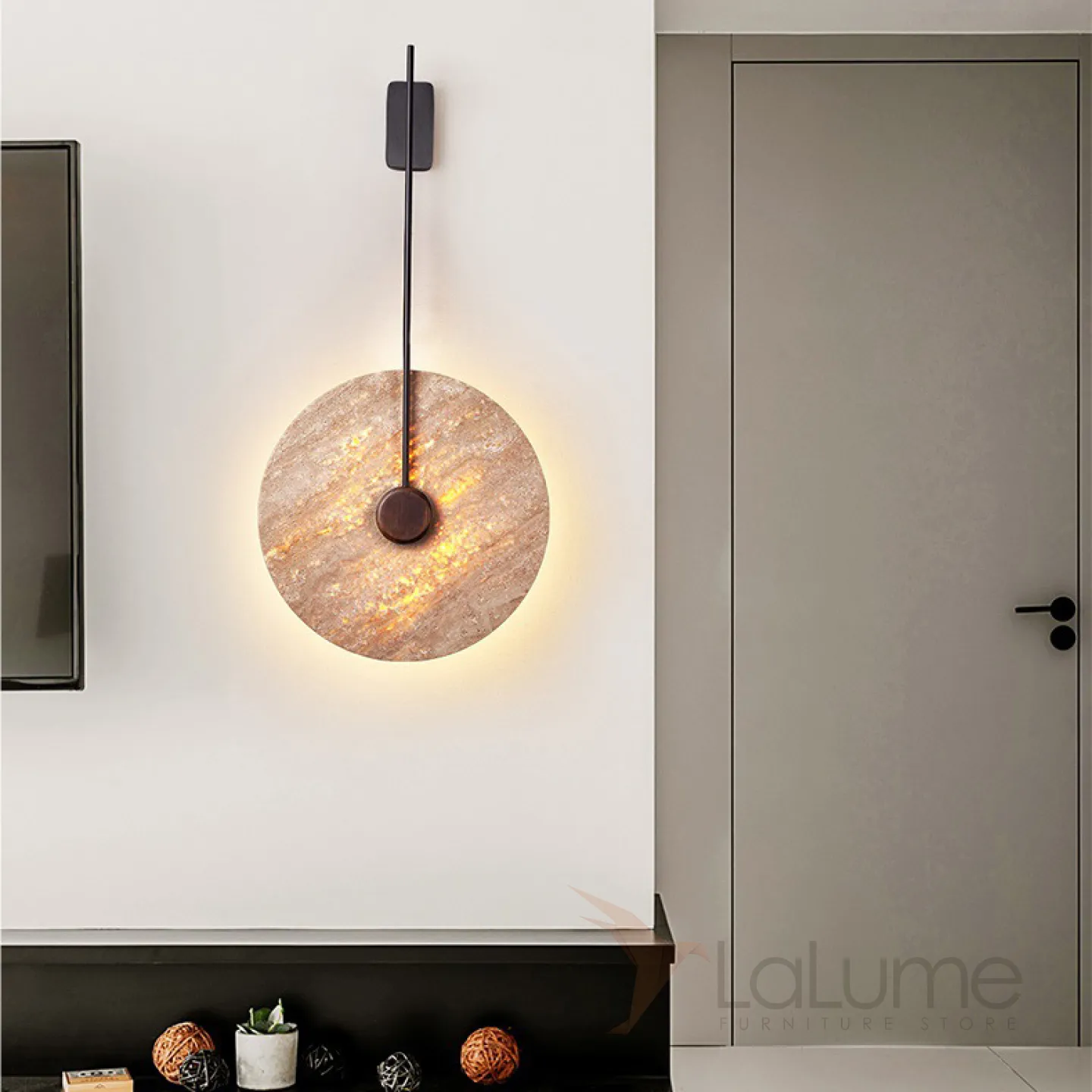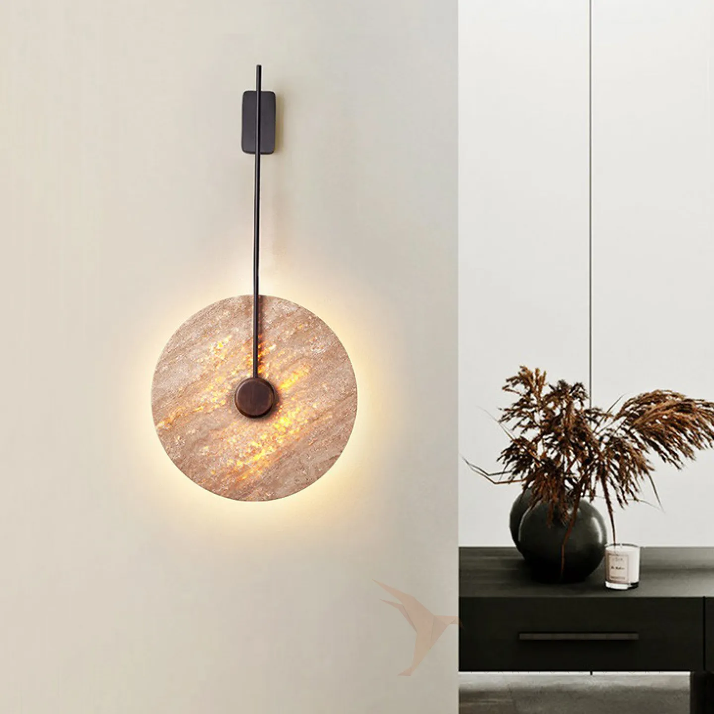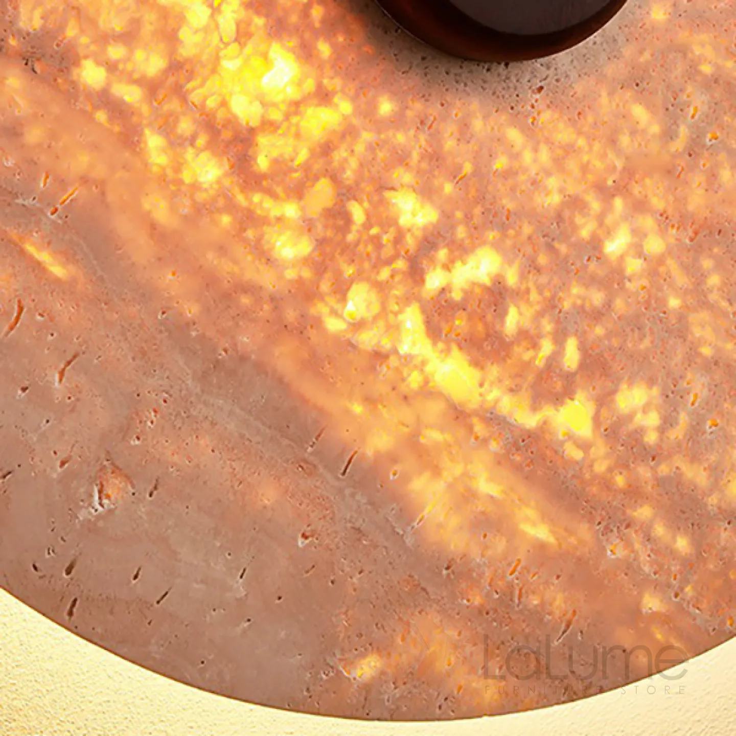 Настенный светодиодный светильник с плоским дисковидным рассеивателем с каменной текстурой и деревянным центром JOAR D30 Brass