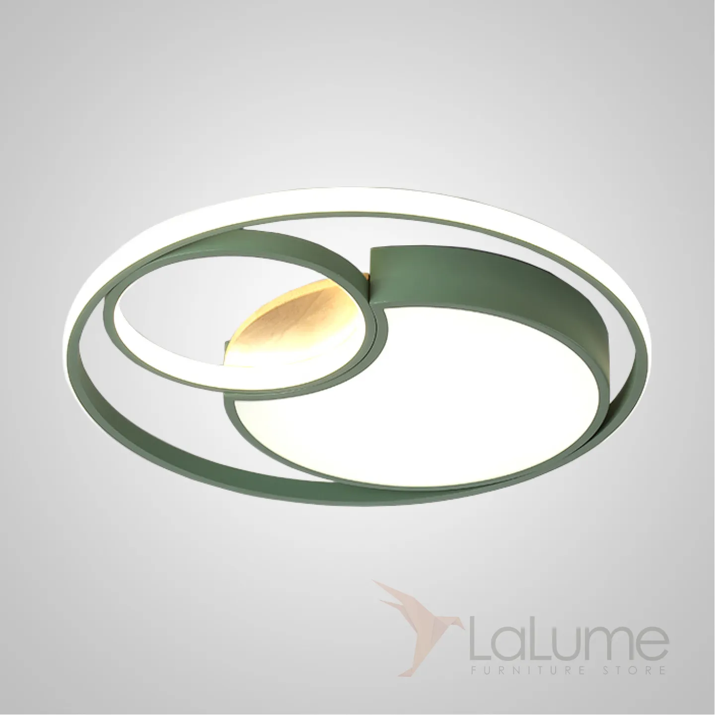 Серия потолочных светодиодных светильников в виде светящихся дисков с декором из светлого дерева LAUST D40 Green