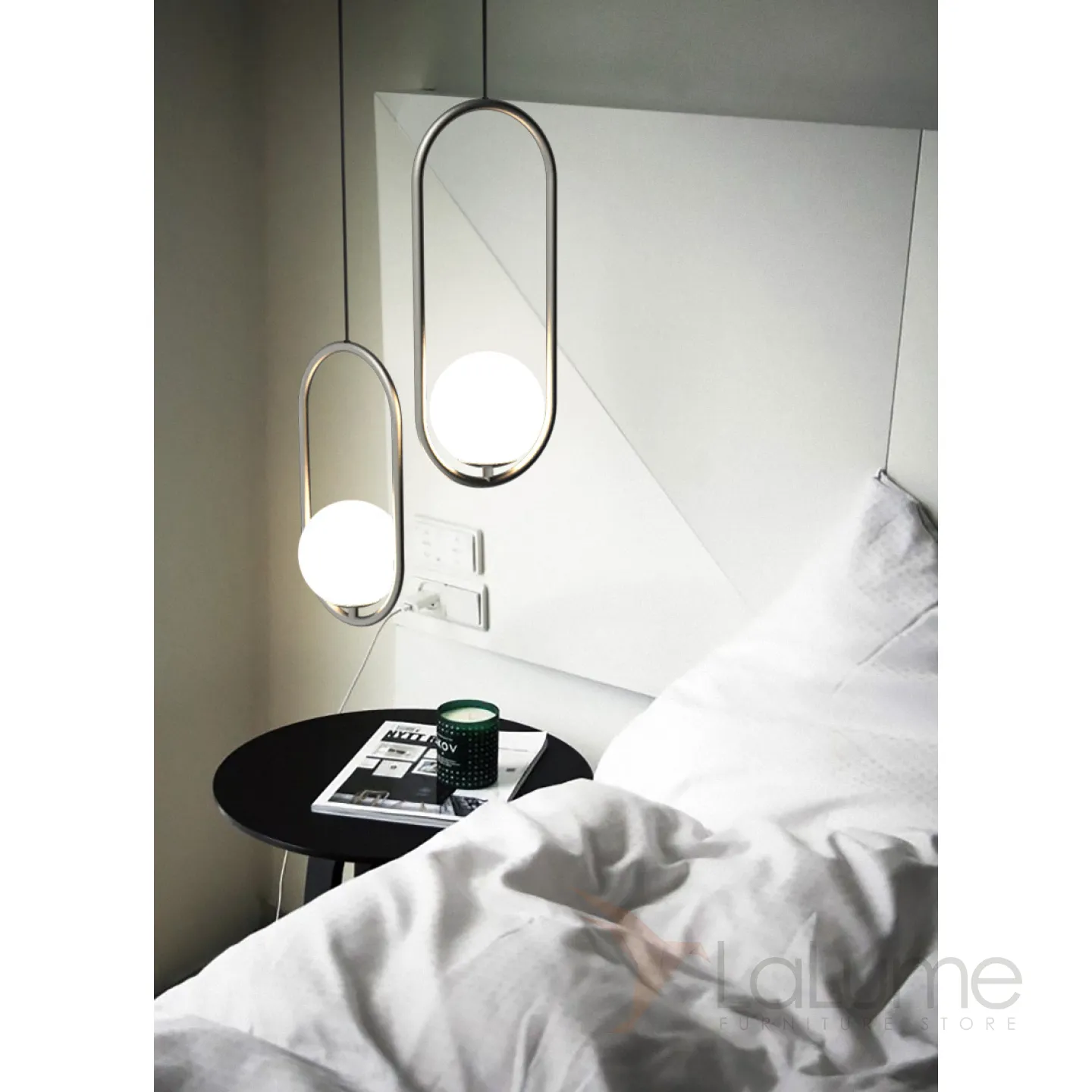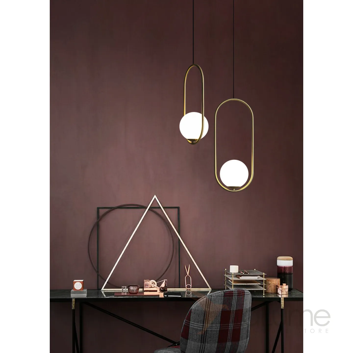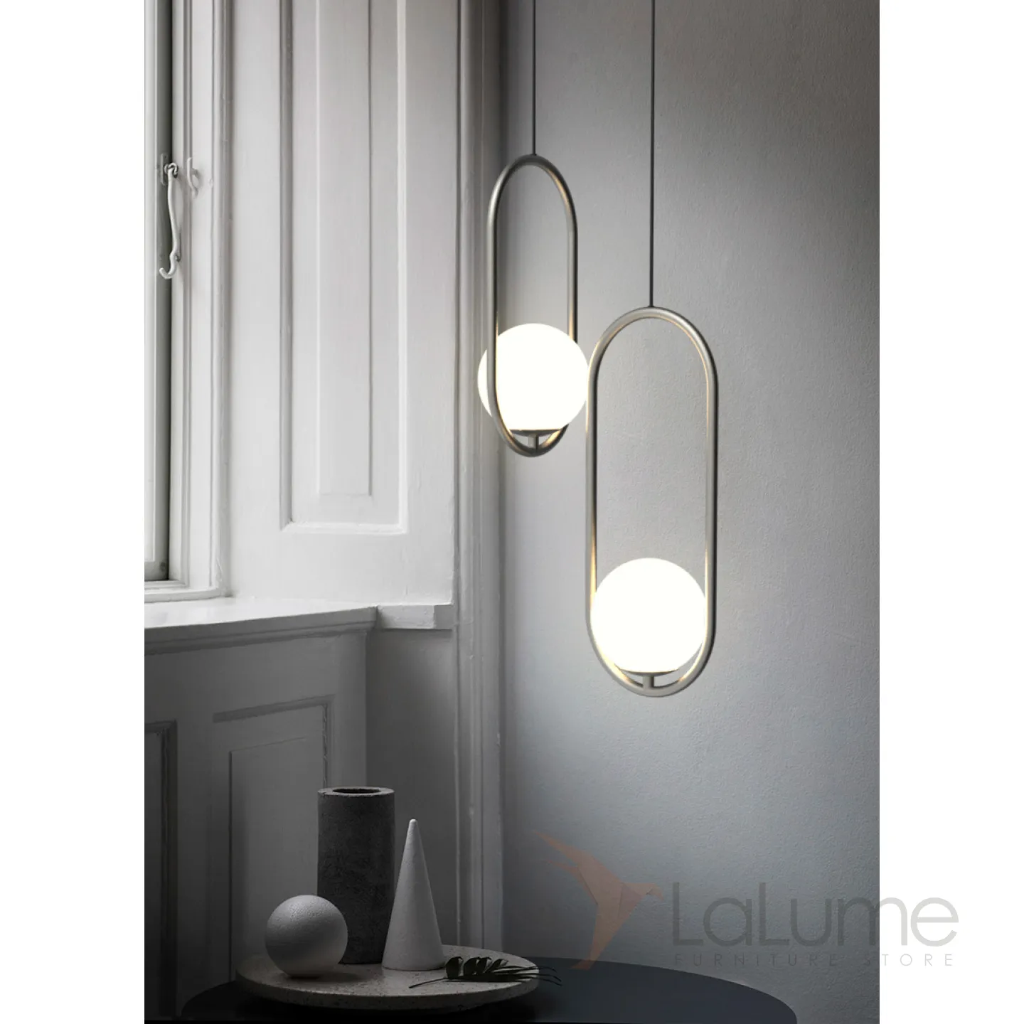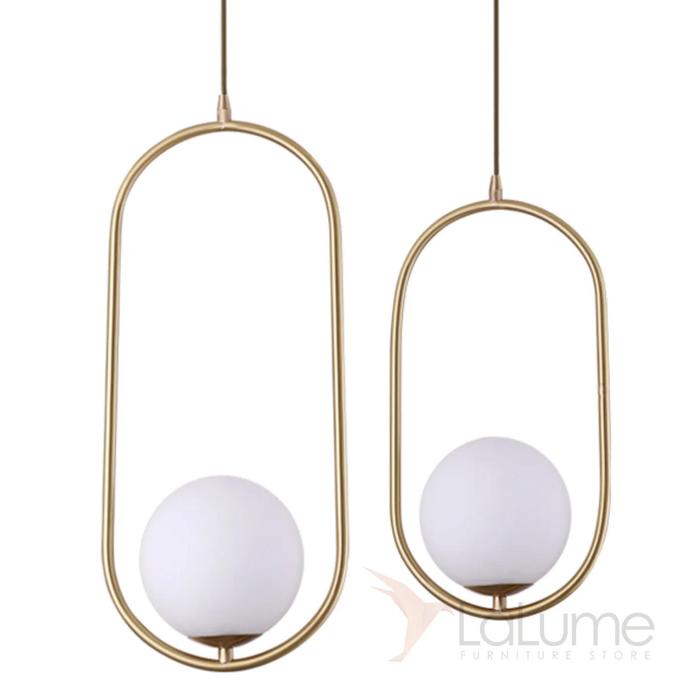 Подвесной светильник с кольцевым дизайнерским каркасом и стеклянным абажуром в форме шара.
