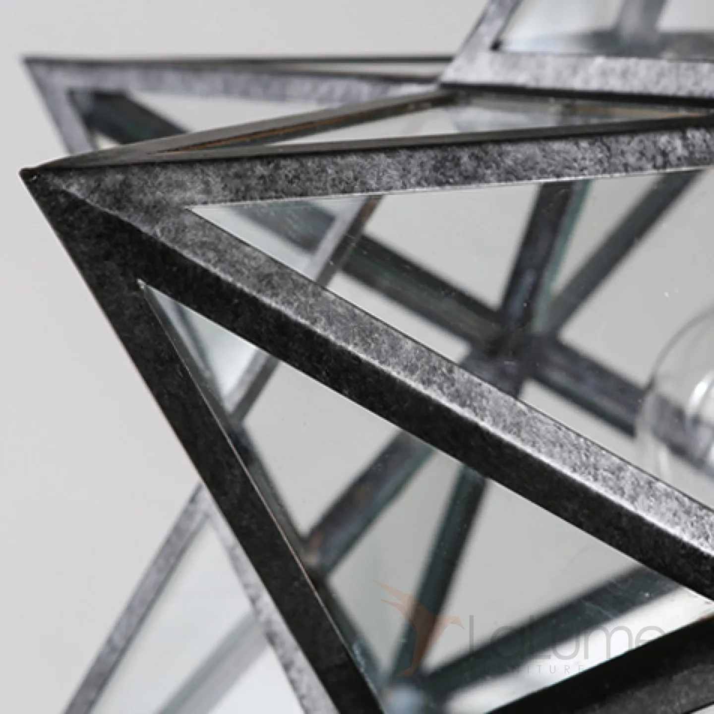 Крупный подвесной светильник на цепном подвесе в духе американского индастриала. Несмотря на свою жесткую геометрическую форму, в интерьере выглядит достаточно уютно, создавая интересную игру светотеней на потолке и стенах.