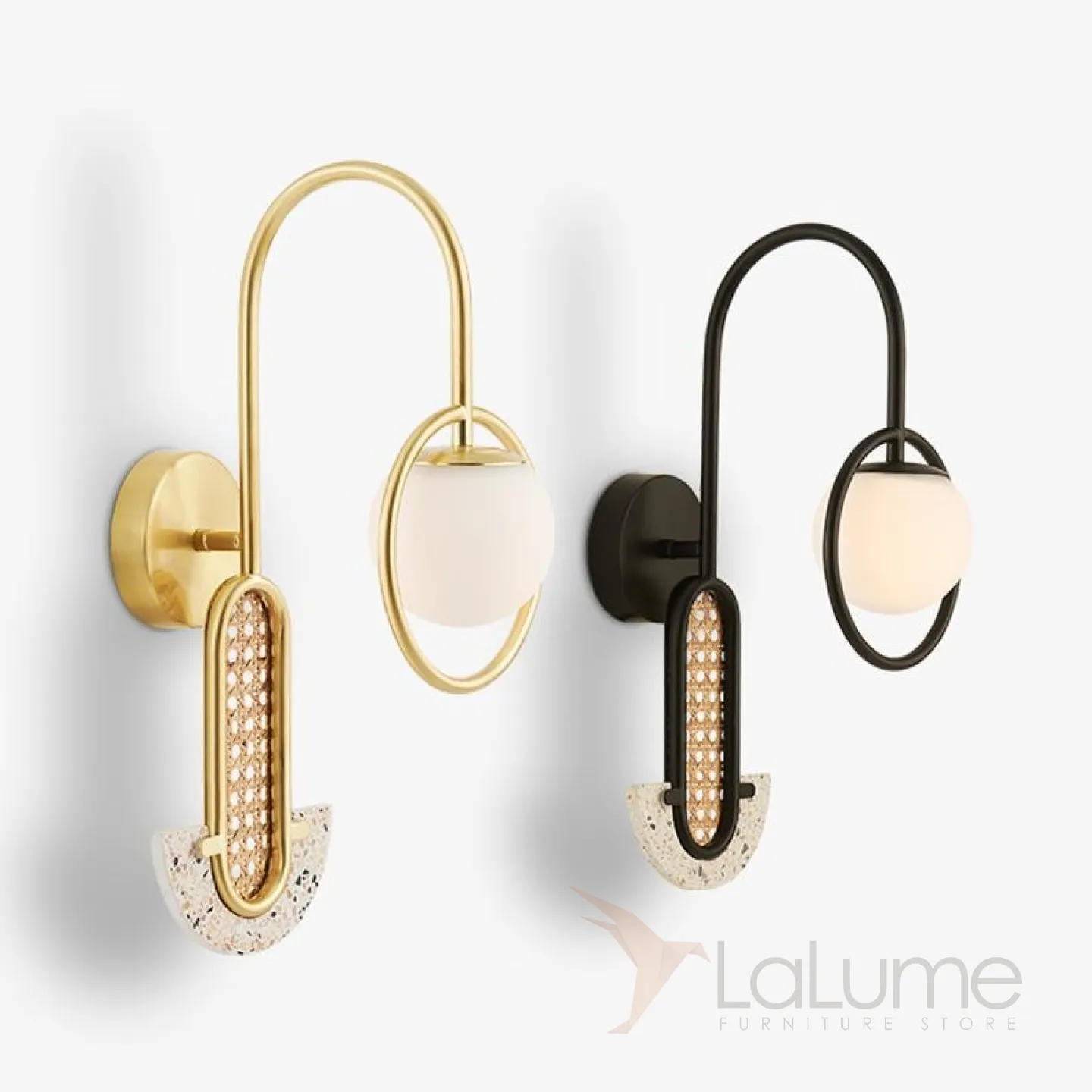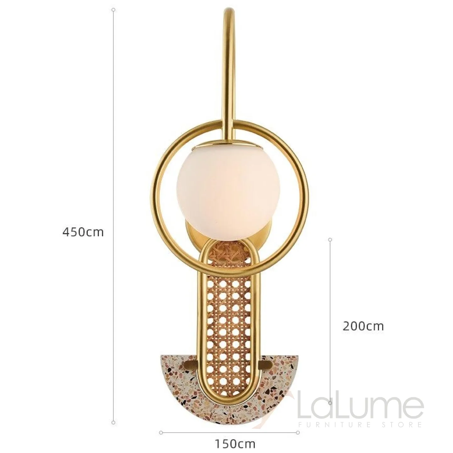 Бра с матовым шарообразным плафоном в кольцевом каркасе, ротанговой вставкой и декоративным элементом терраццо SAAR WALL