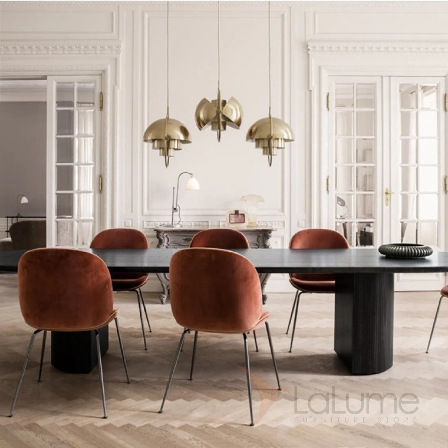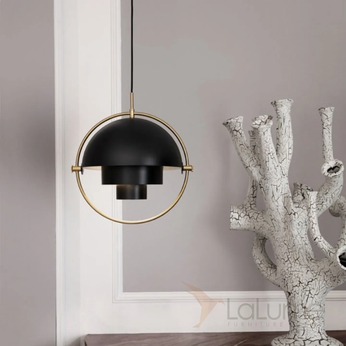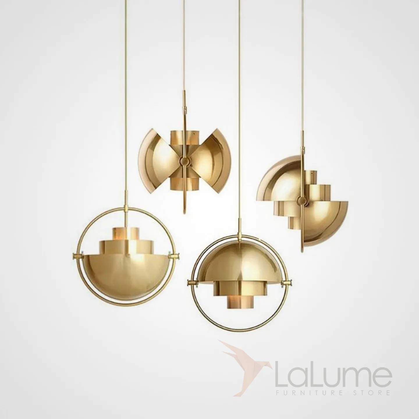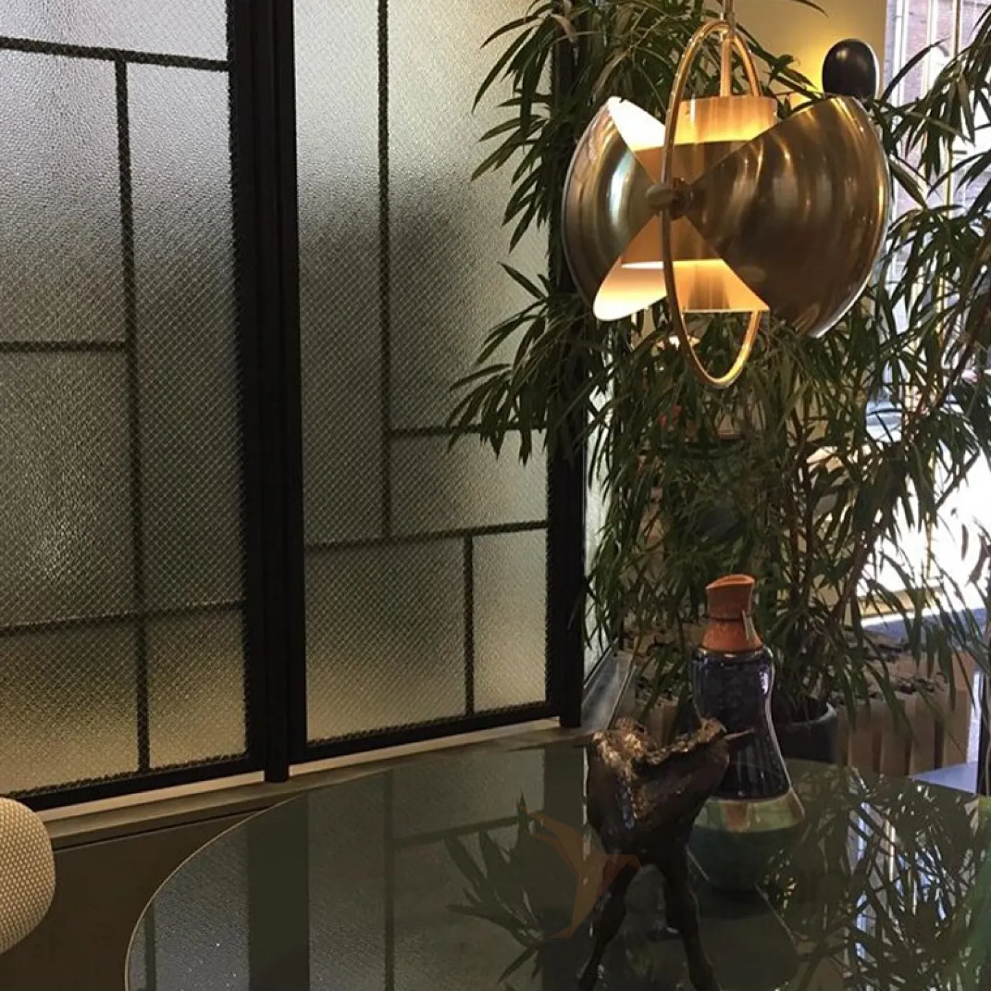 Дизайнерский светильник латунного цвета с интересным комбинированным абажуром.