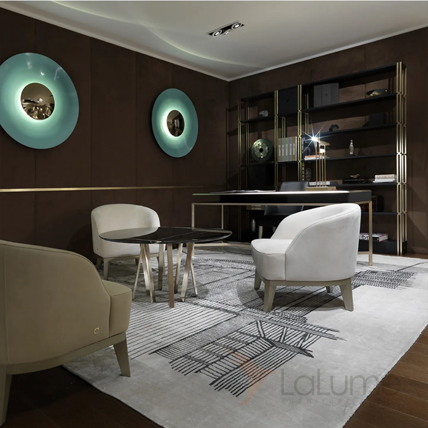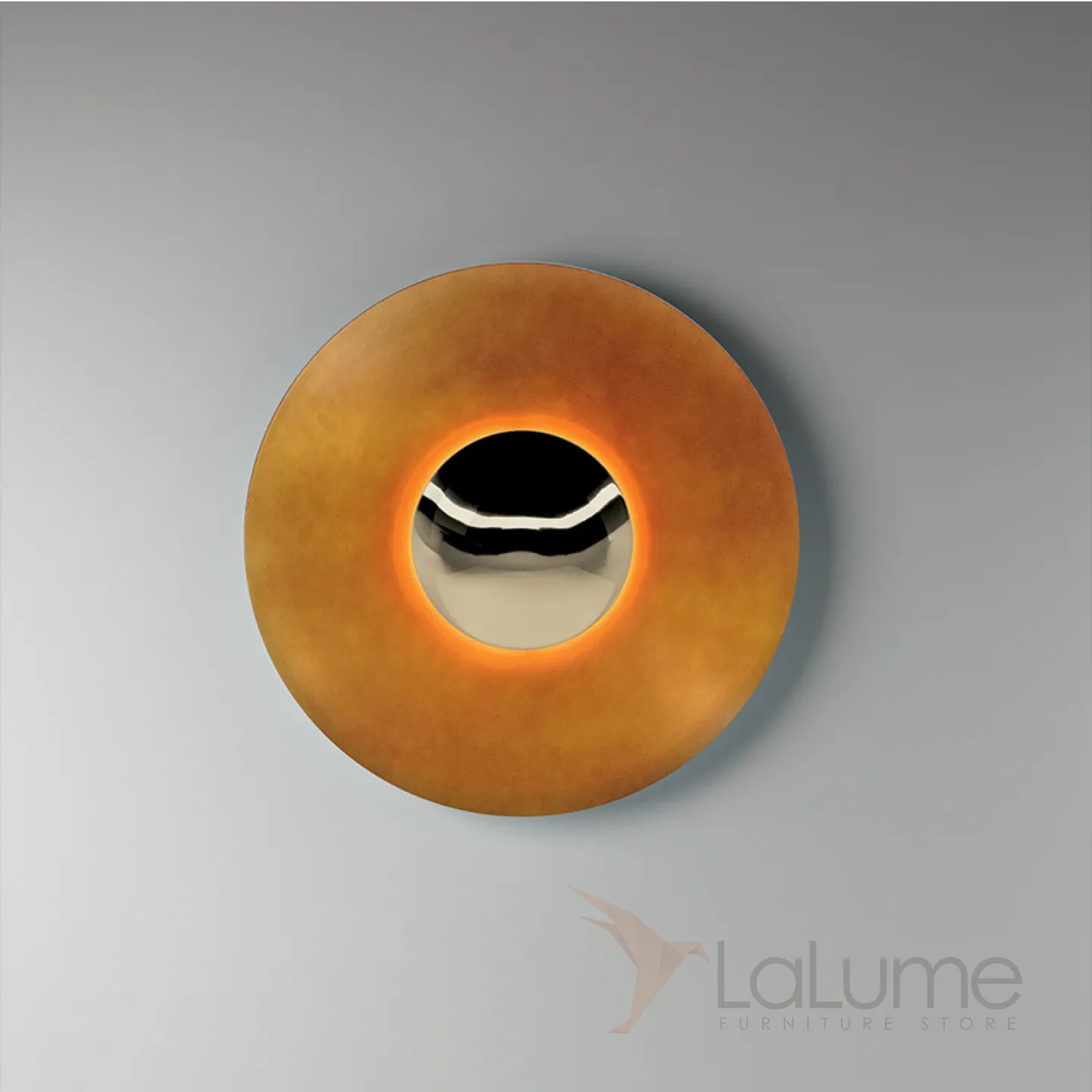 Бра CIRCLE вдохновлен мягкими линиями 40-х годов. Представляет собой большой, слегка вогнутый диск из кованого вручную металла и покрытого краской разных цветов. В центре расположена полусфера из металла с блестящей золотой отделкой, словно капля.