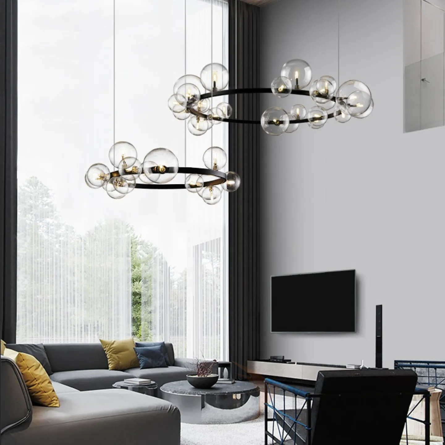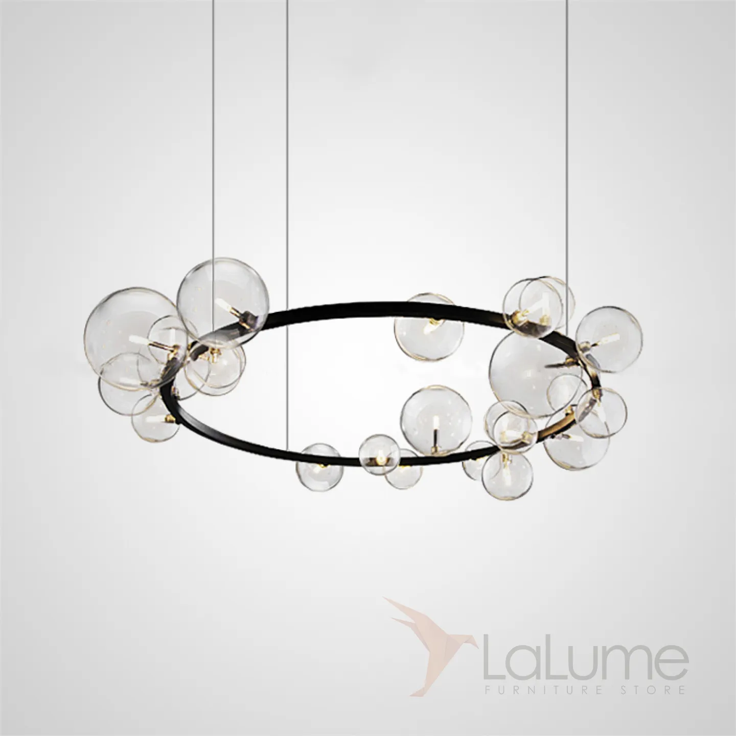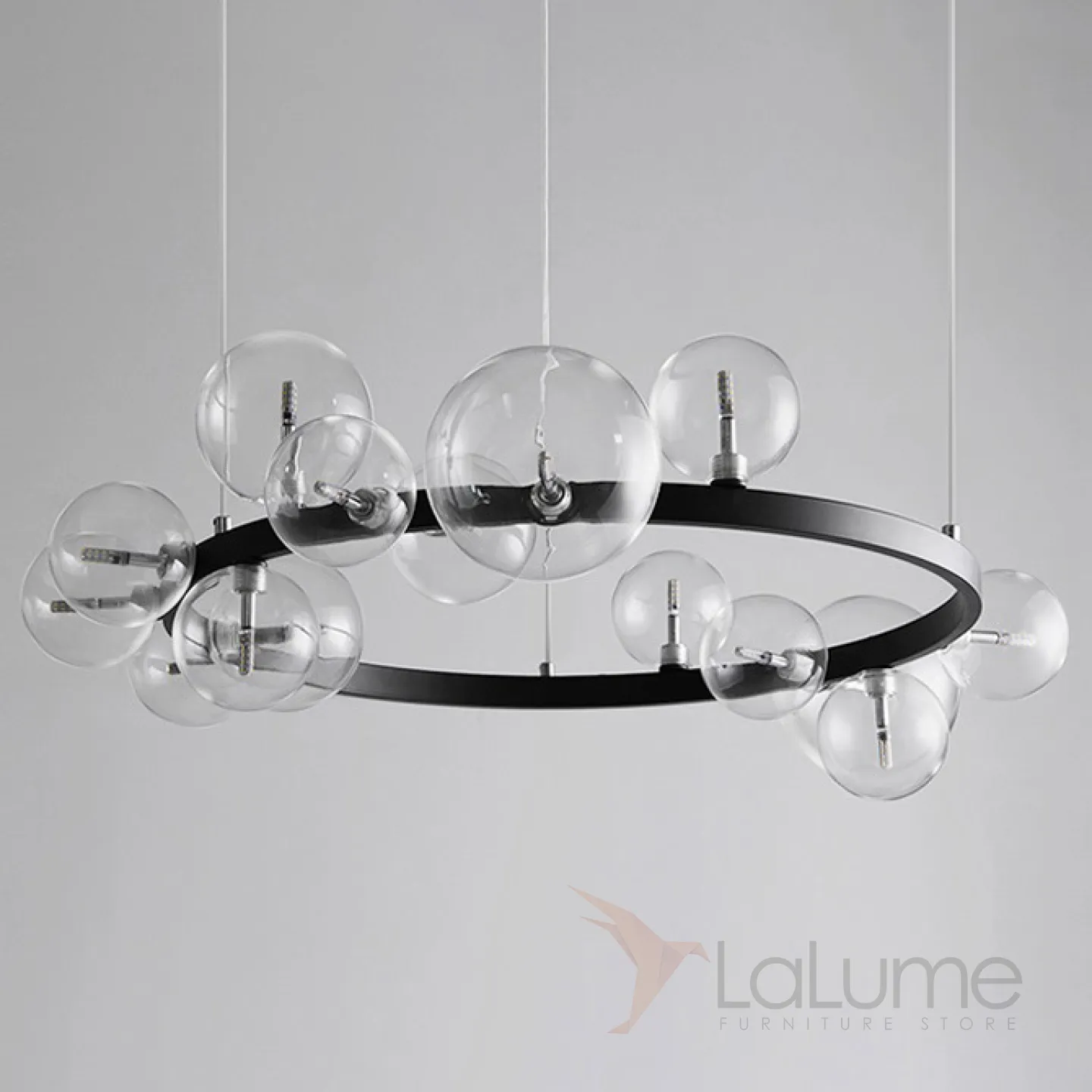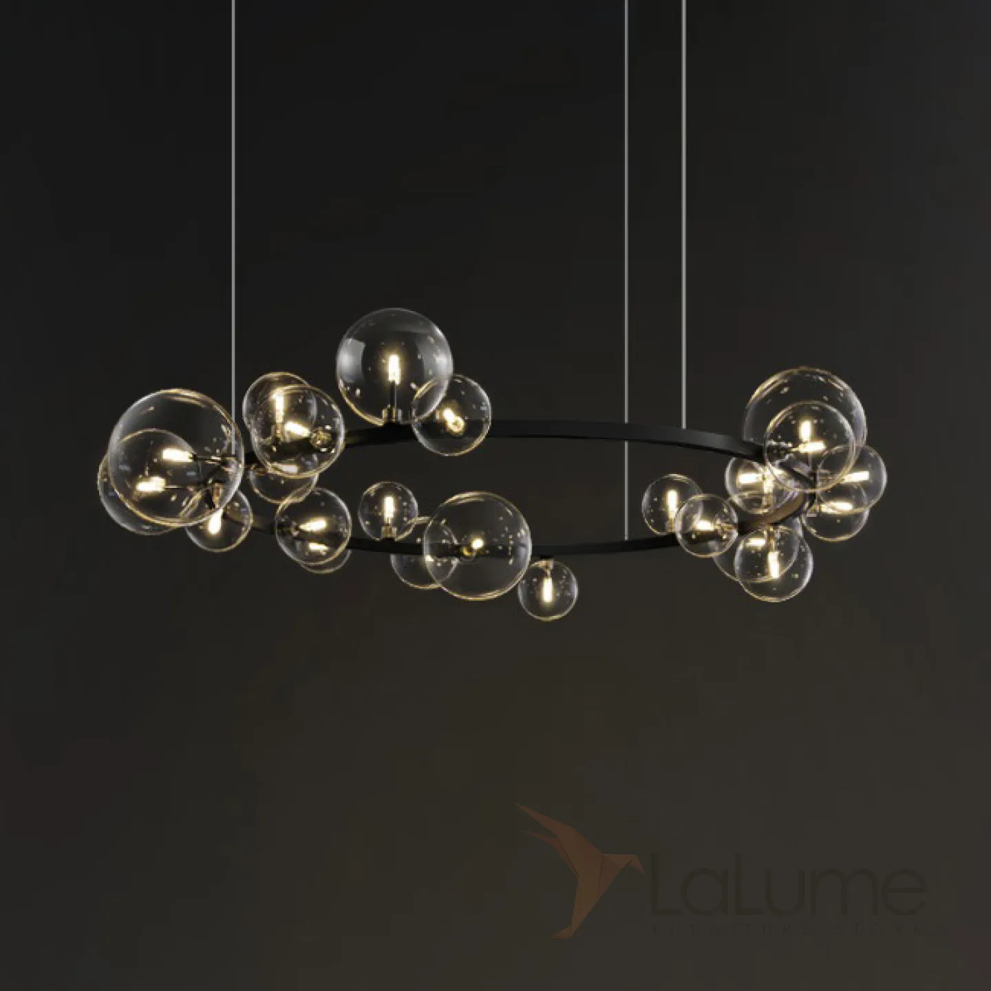 Дизайнерская кольцевая люстра с асимметрично расположенными стеклянными плафонами разного диаметра IONA