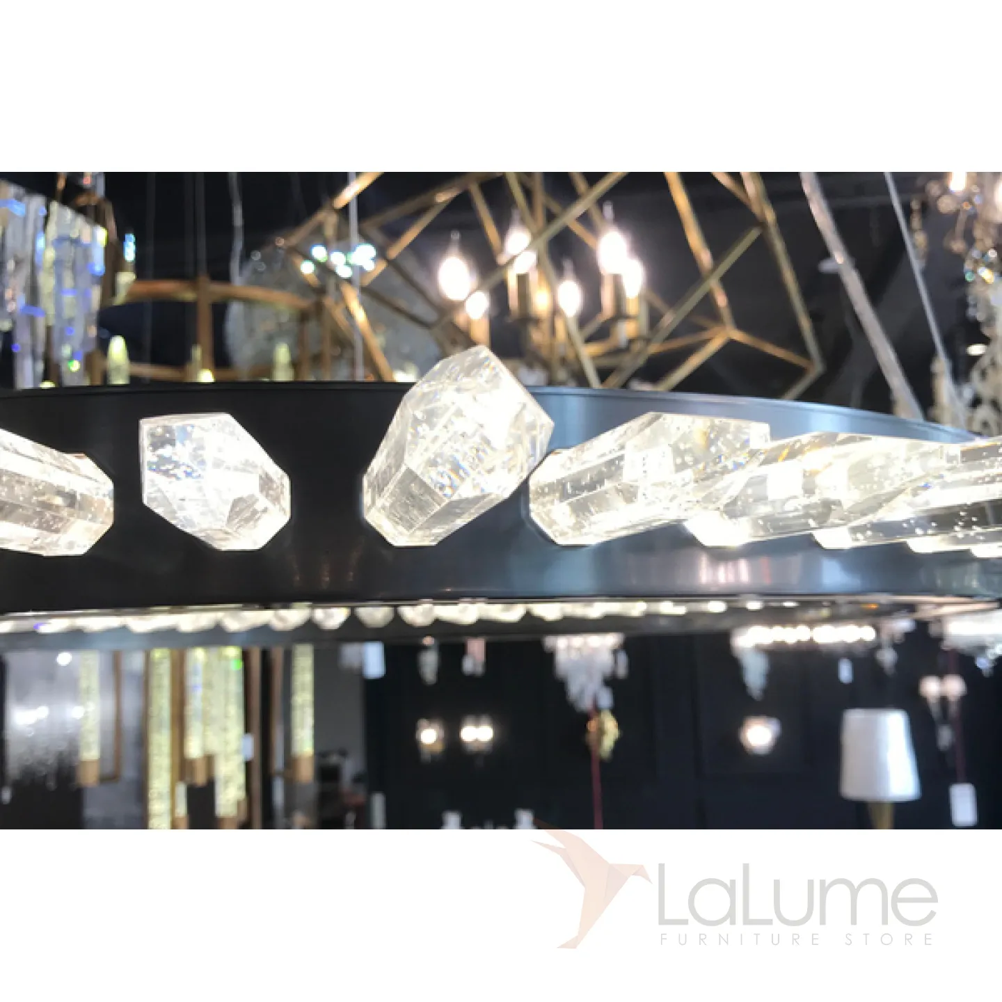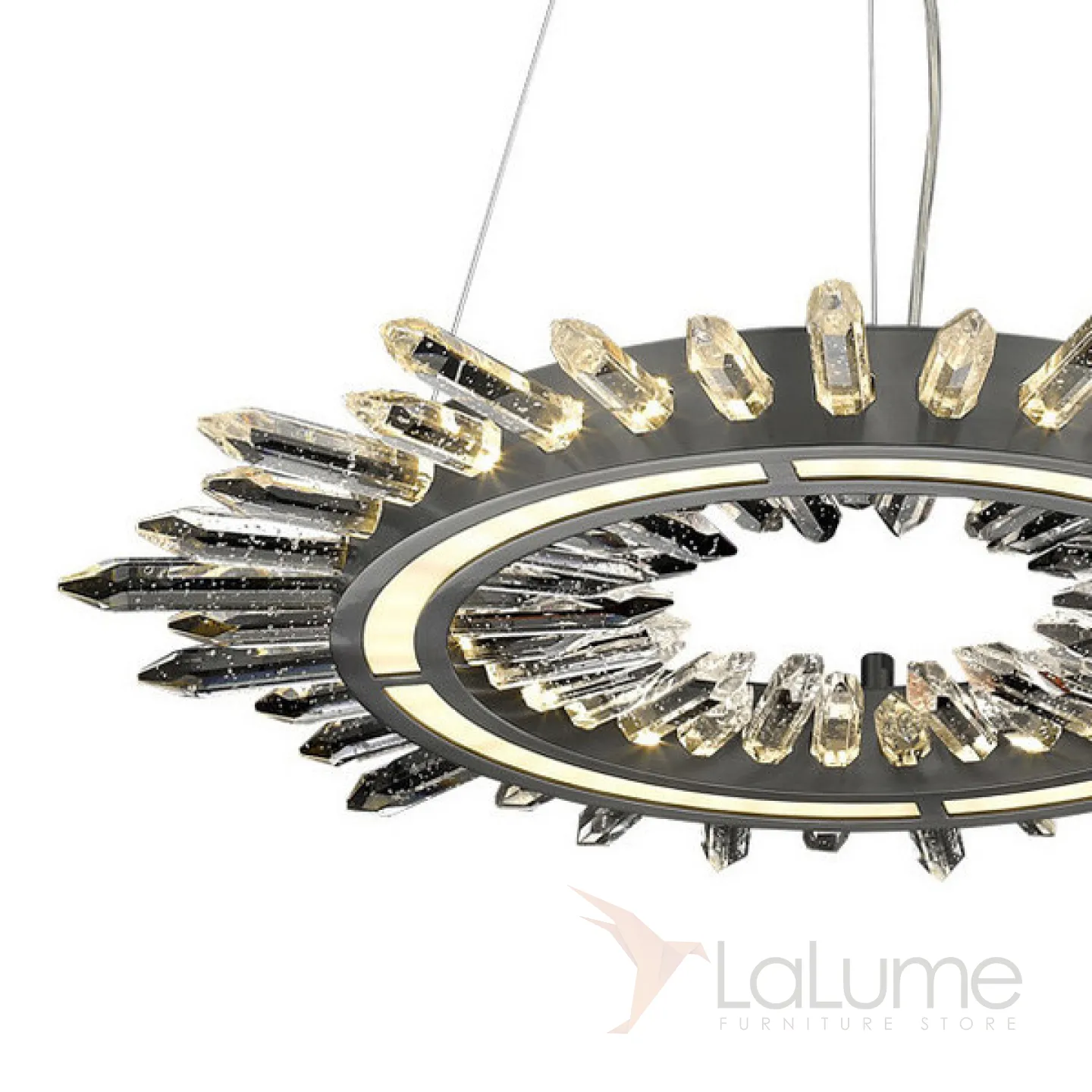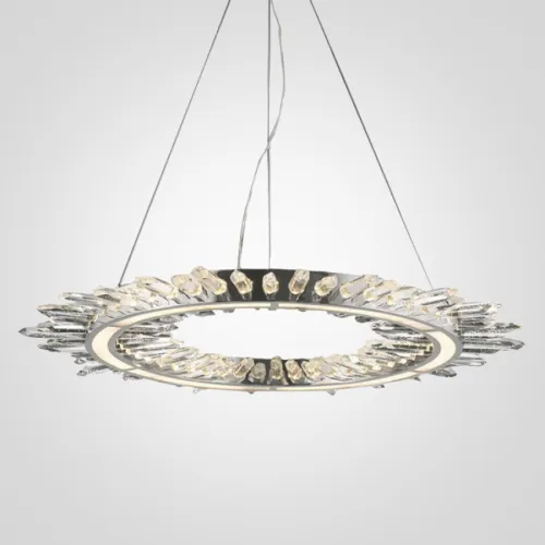 Люстра в виде кольца со стеклянными элементами, напоминающими кристаллы горного хрусталя. Основание черного цвета.