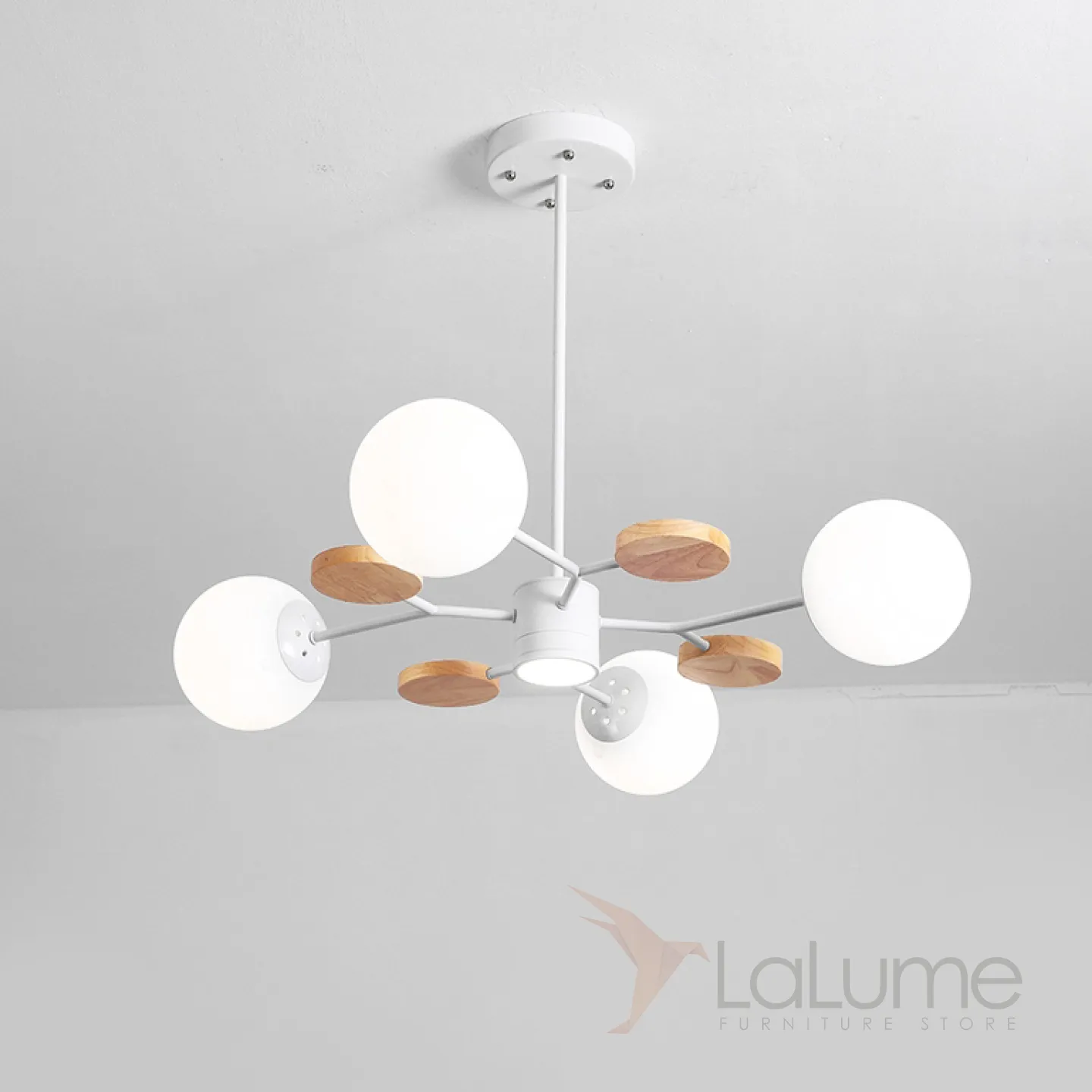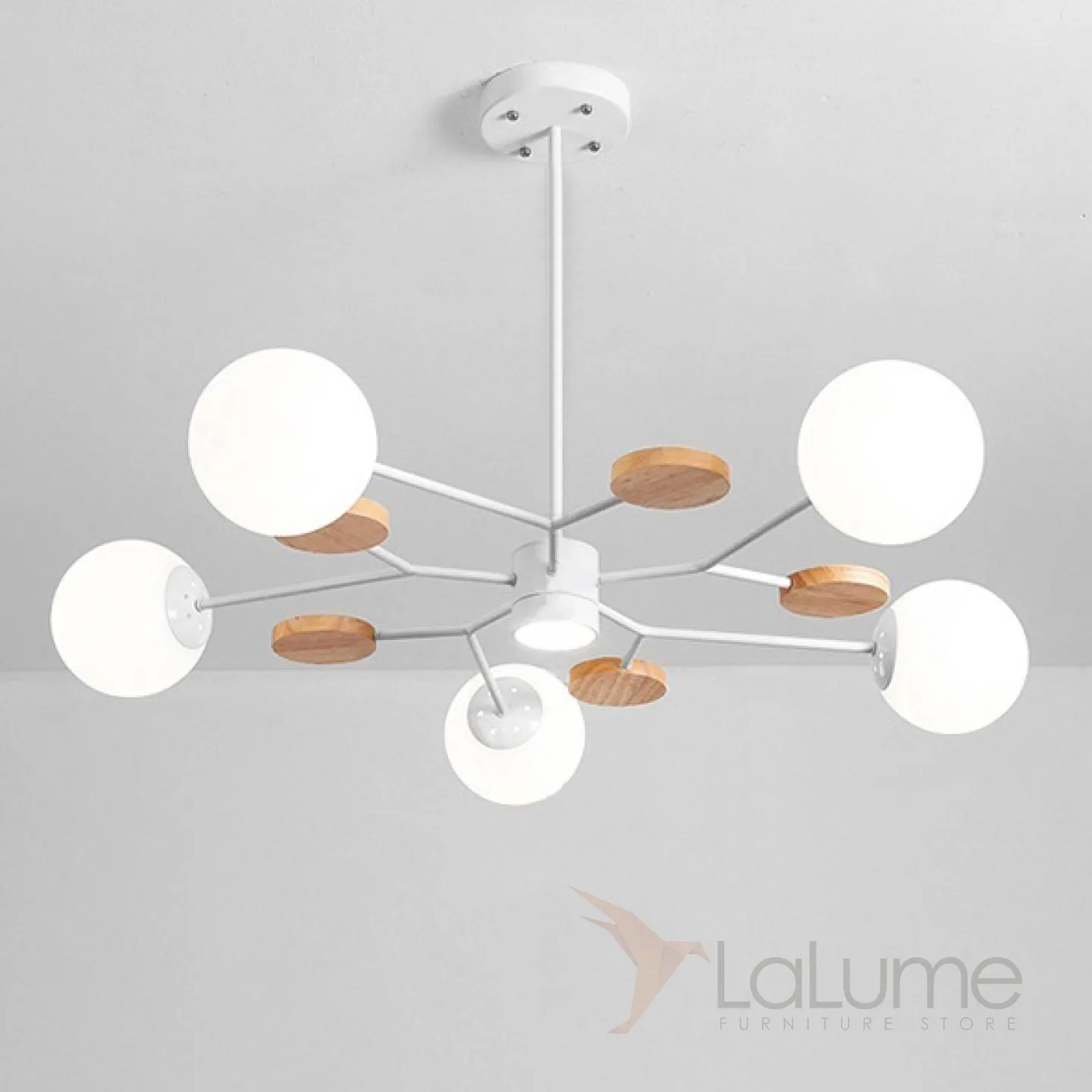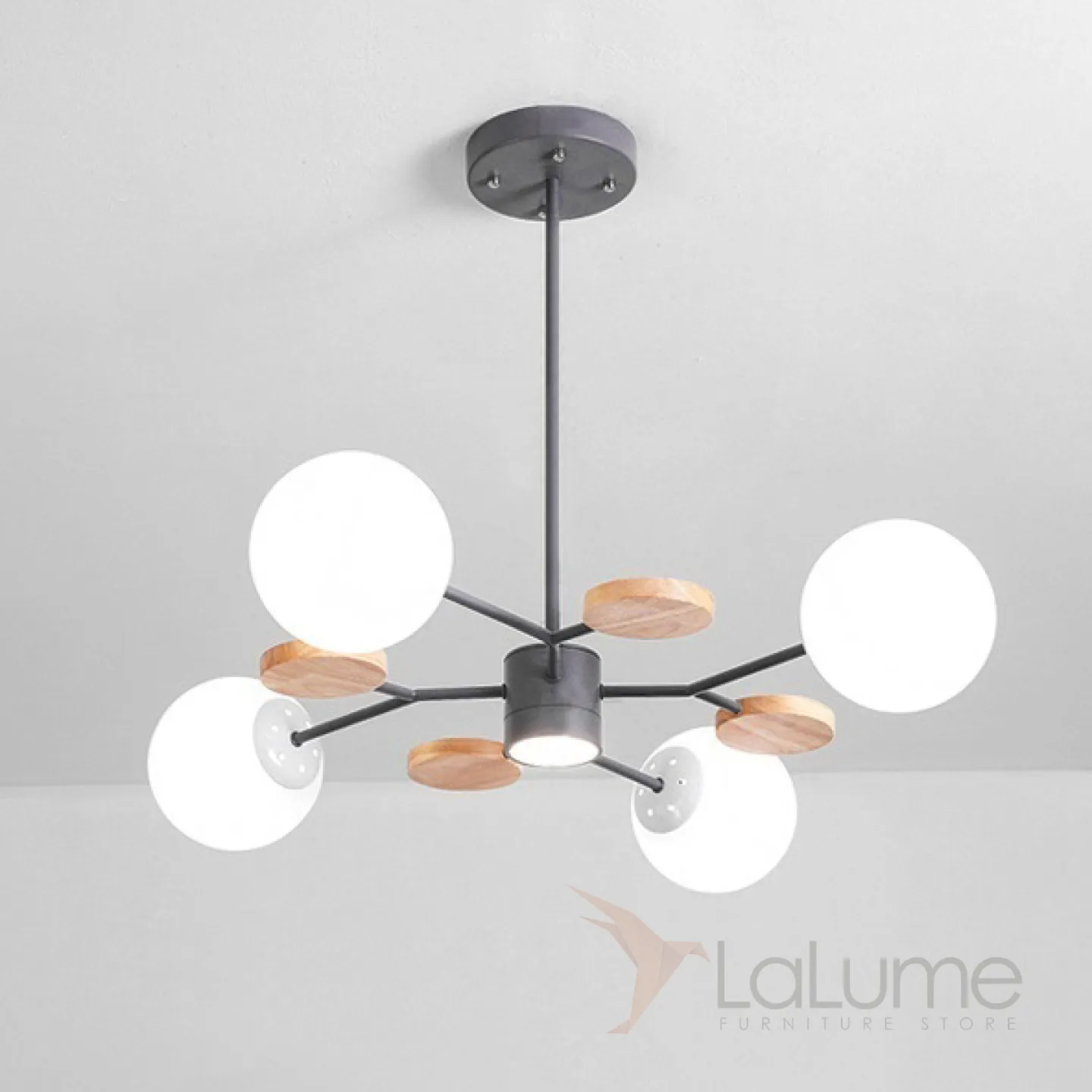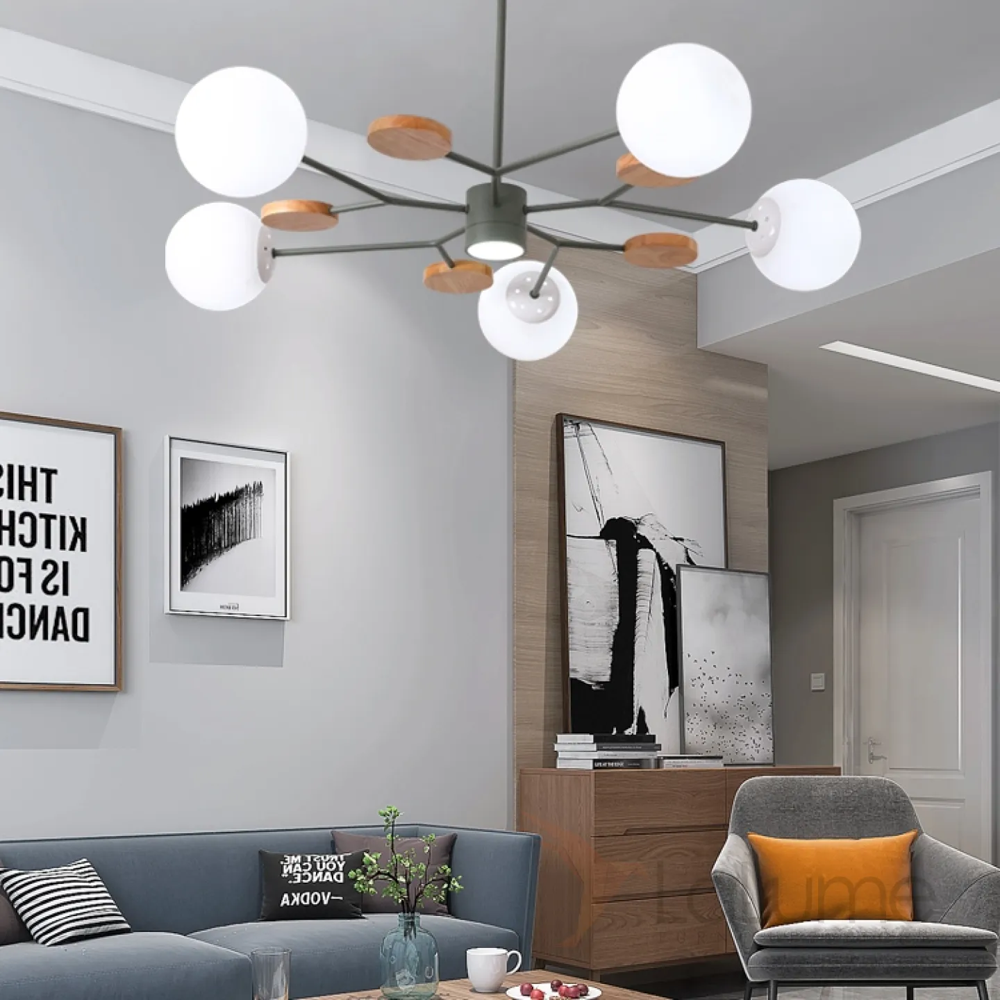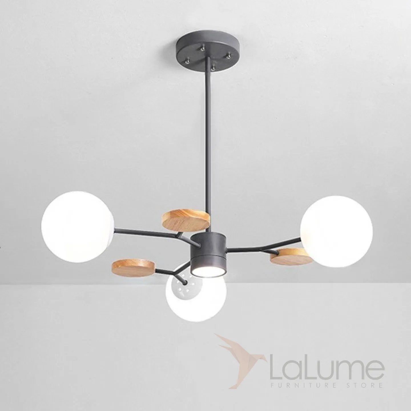 Линейка люстр в скандинавском стиле с шарообразными плафонами на металлической штанге и с деревянным декором MEADE ORB