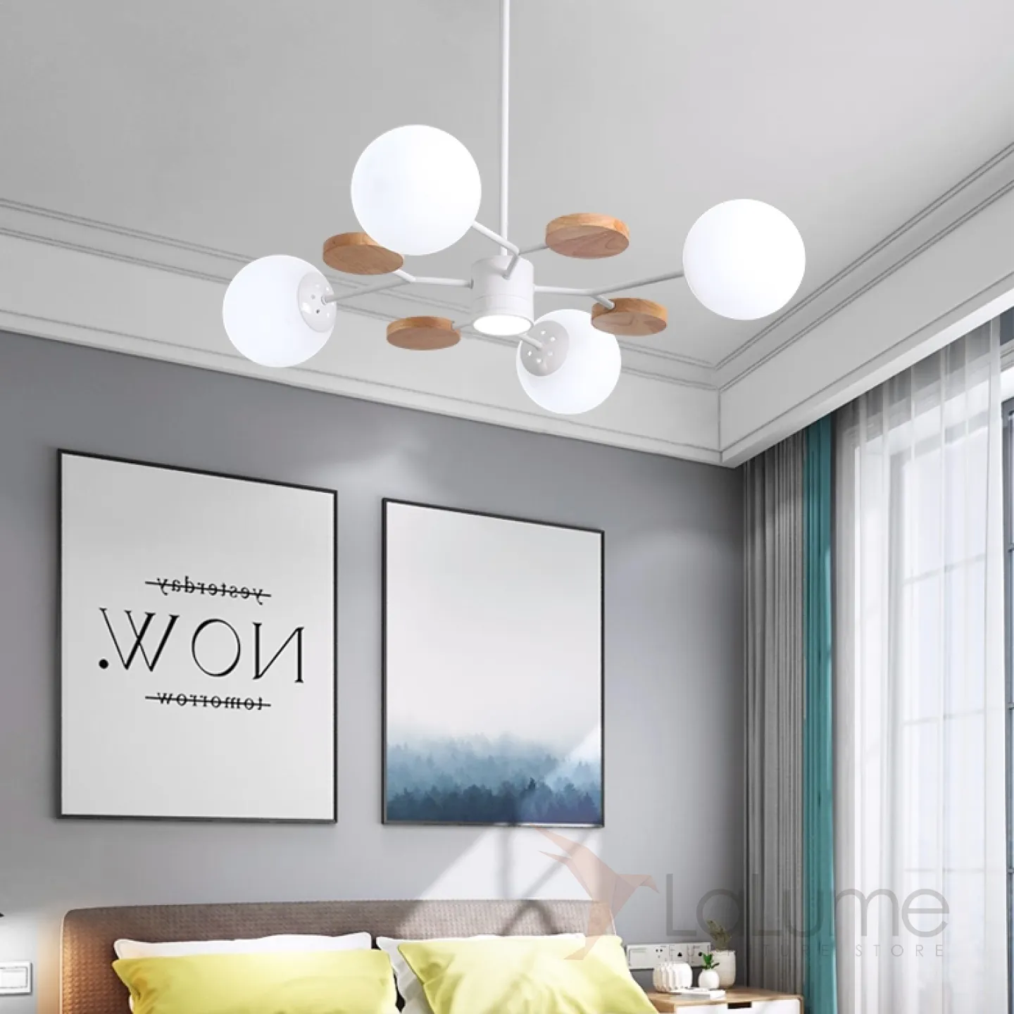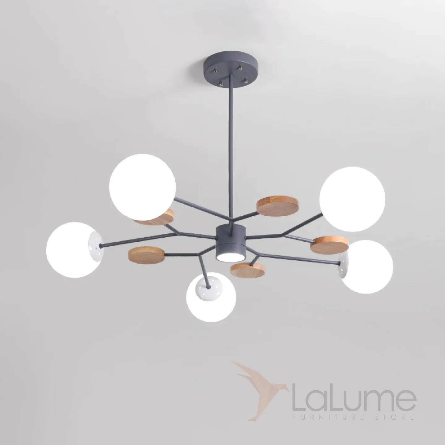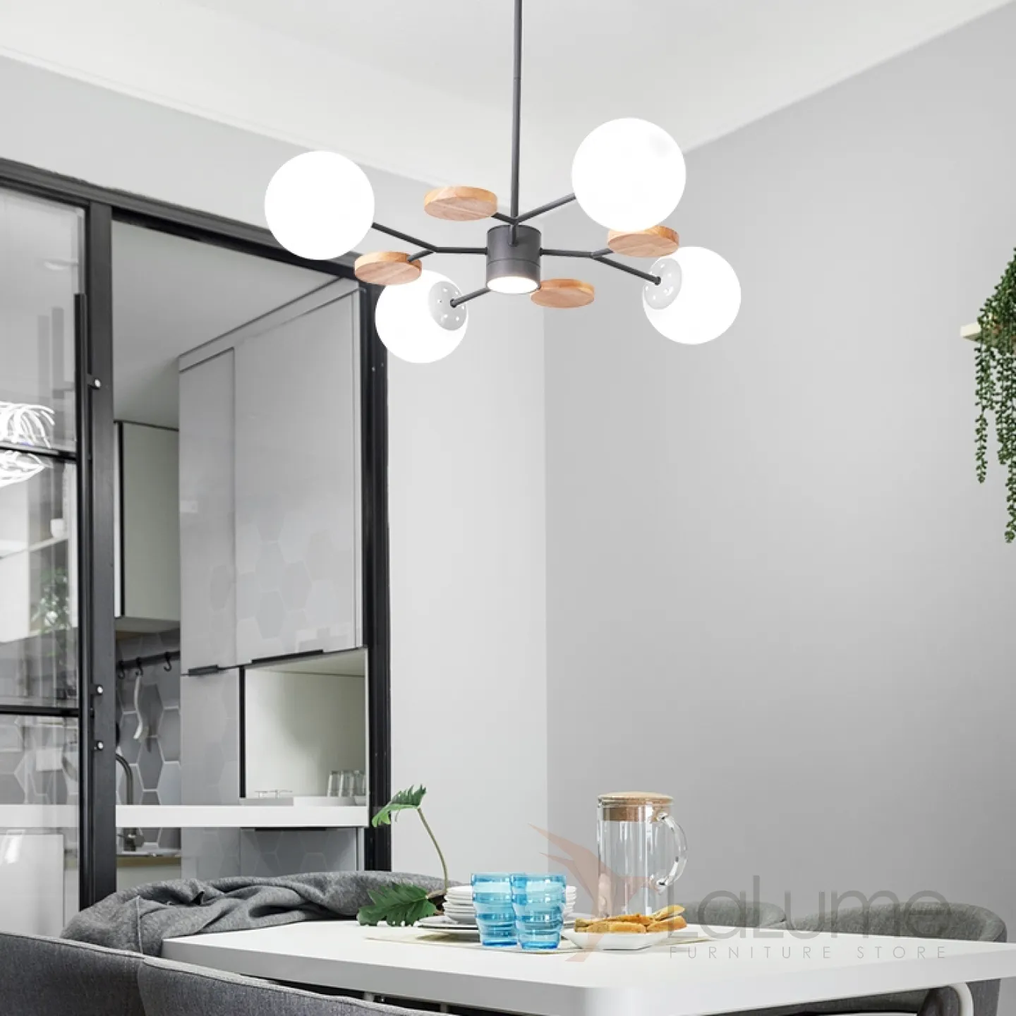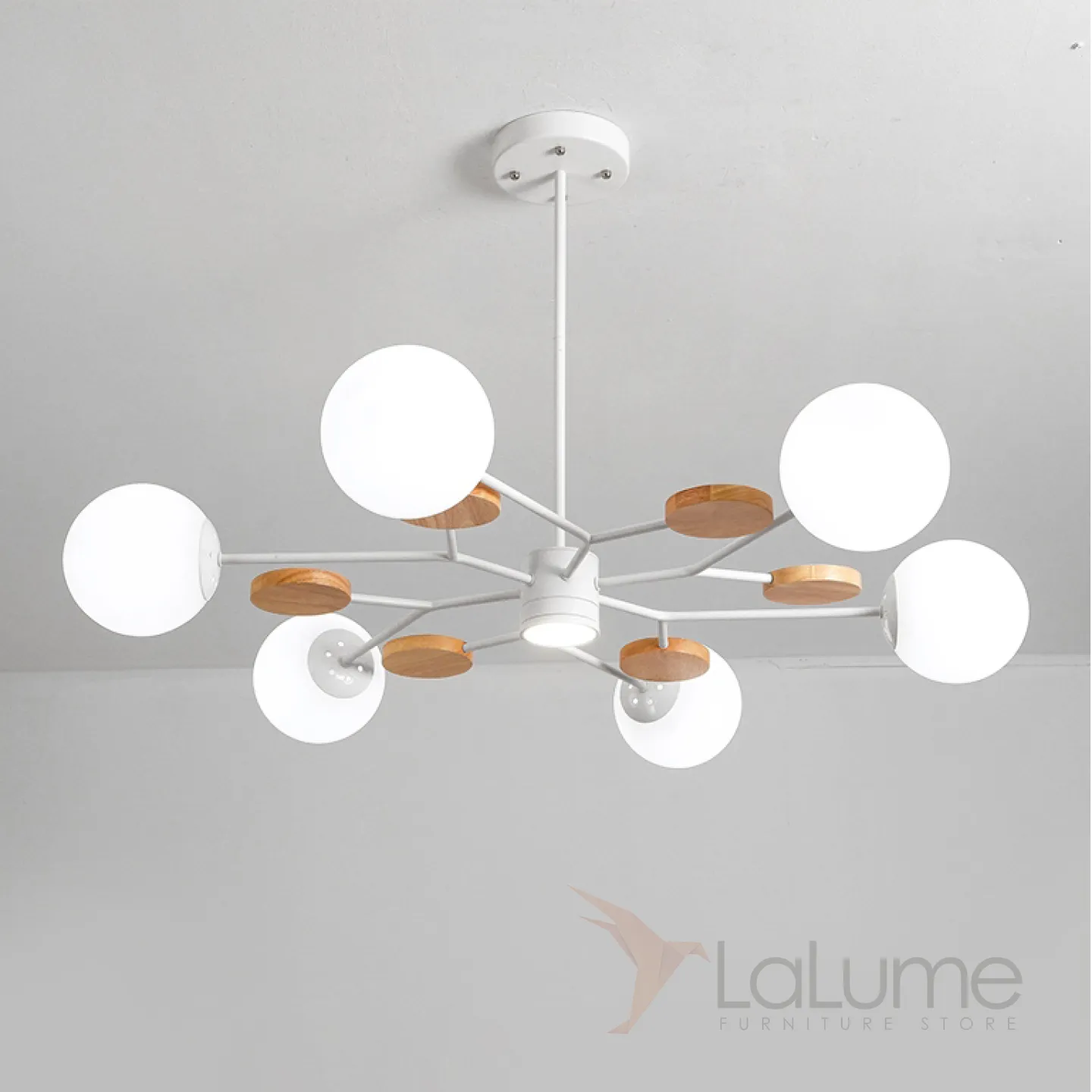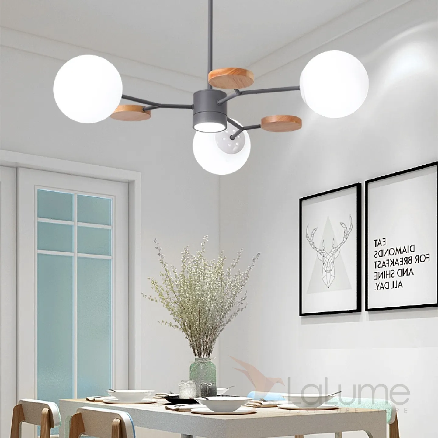 Линейка люстр в скандинавском стиле с шарообразными плафонами на металлической штанге и с деревянным декором MEADE ORB