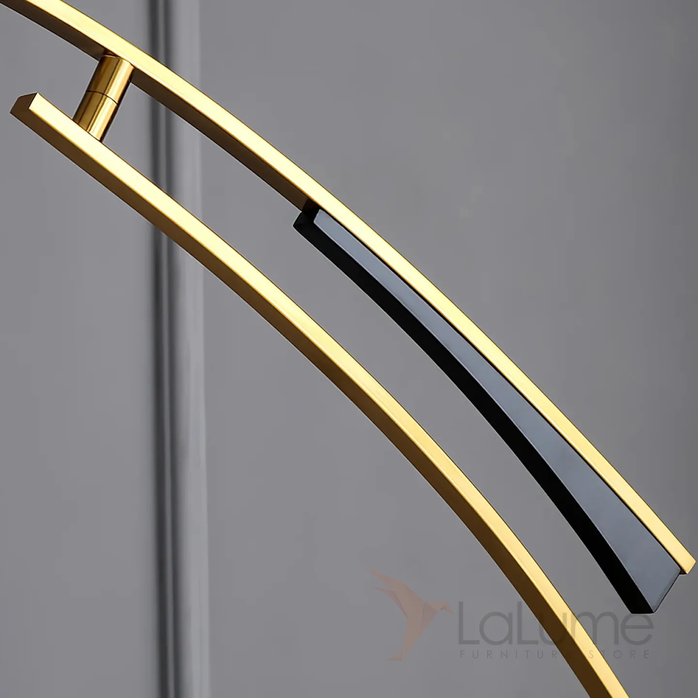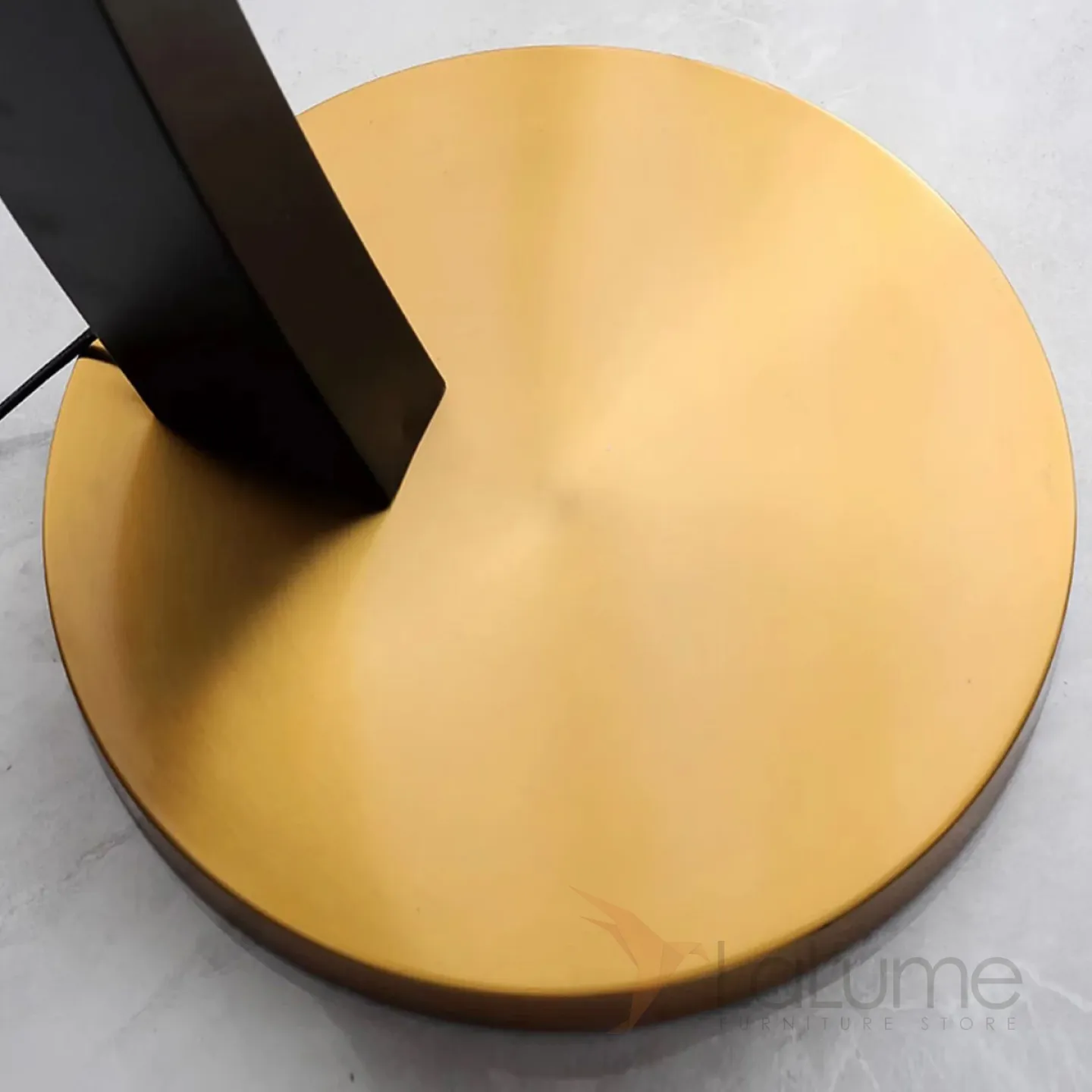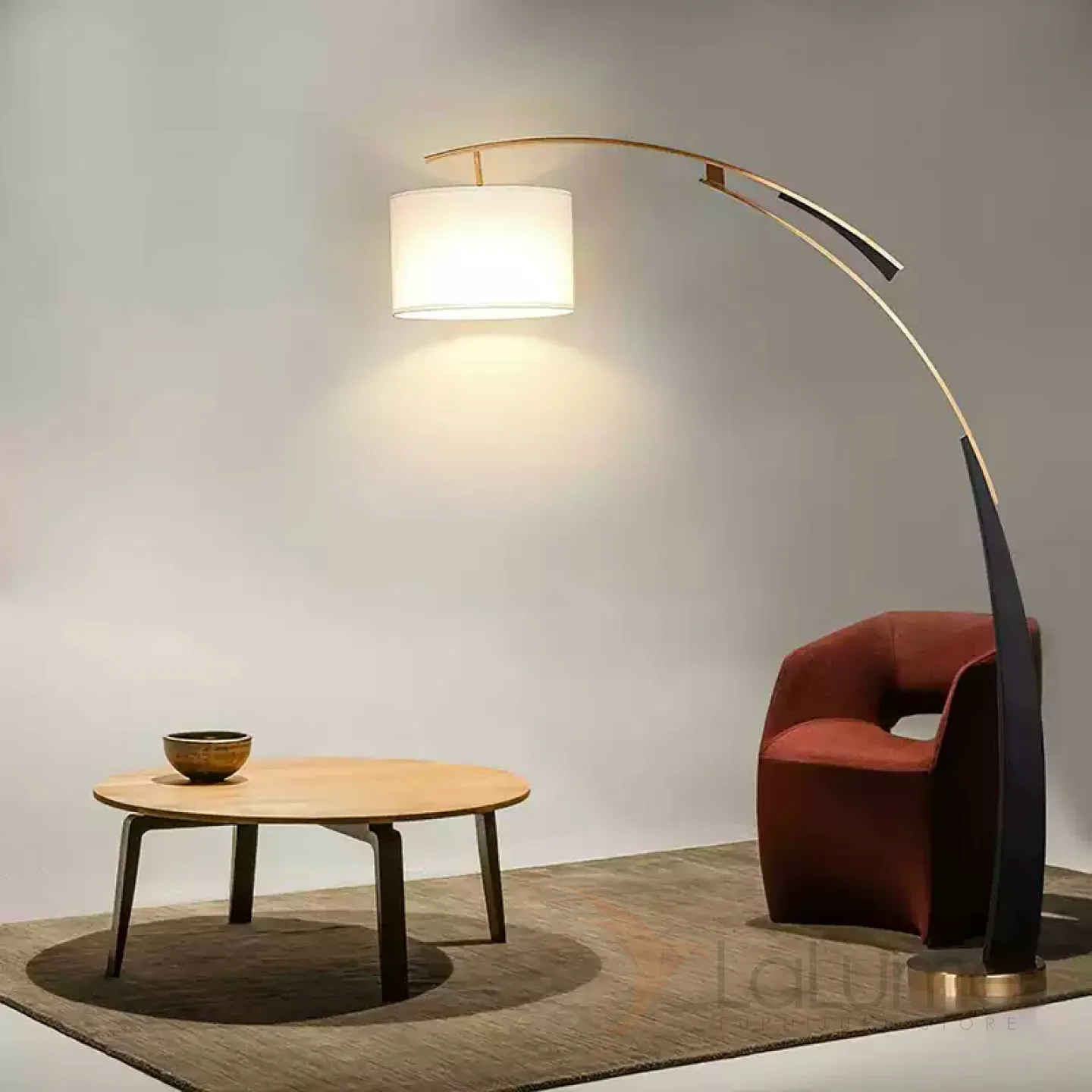 Элегантный напольный светильник с металлической дугообразной подставкой привлекает внимание своей изысканной конструкцией. Абажур из ткани добавляет устройству утончённость и эстетическую привлекательность, гармонично сочетая функциональность и визуальную красоту.