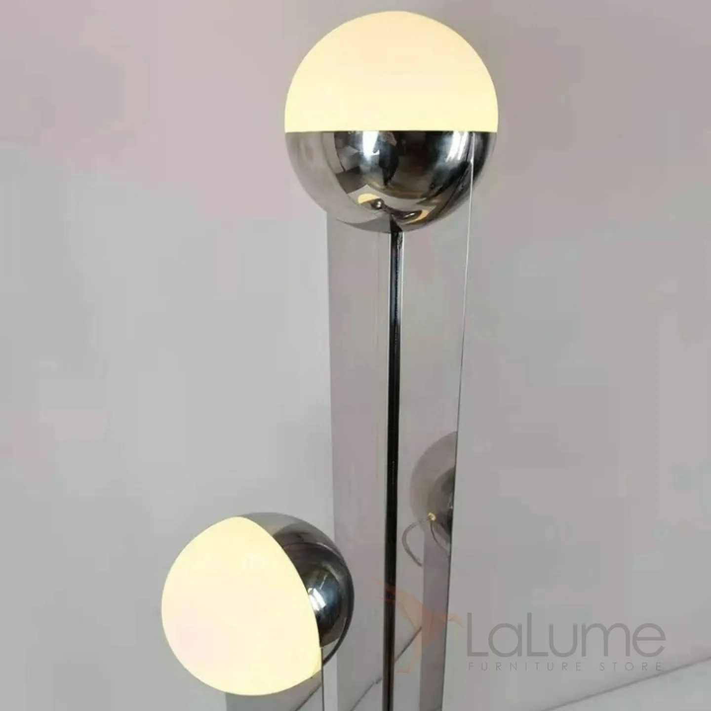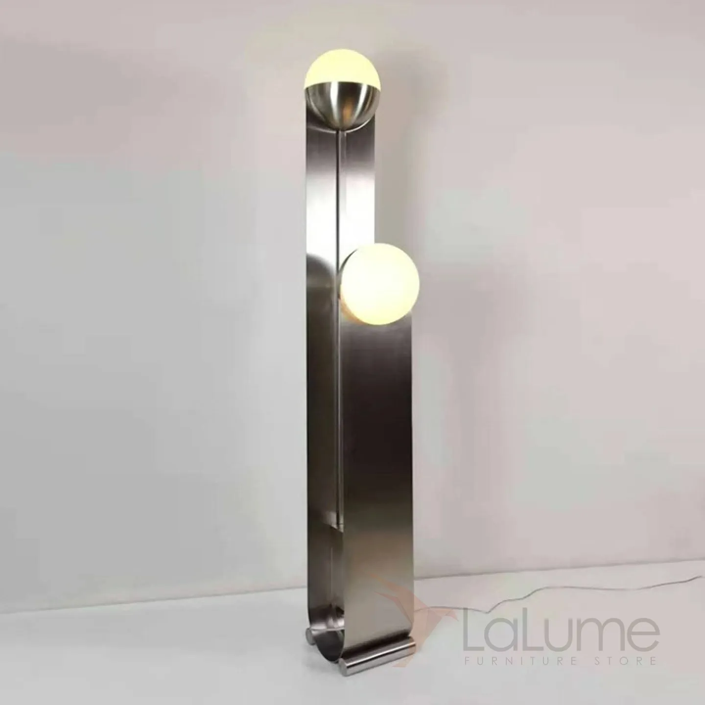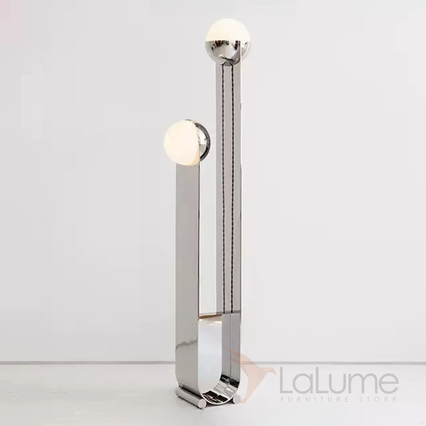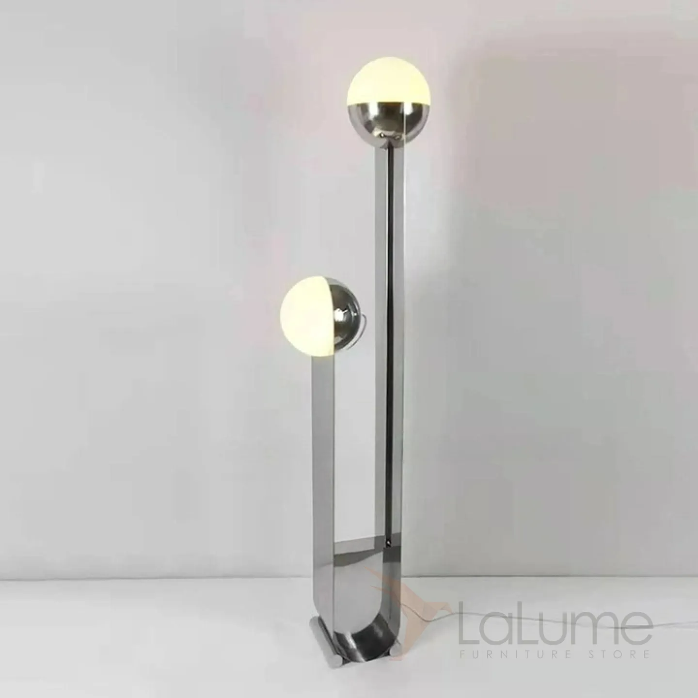 Современный напольный светильник с двумя плафонами на основании из нержавеющей стали.