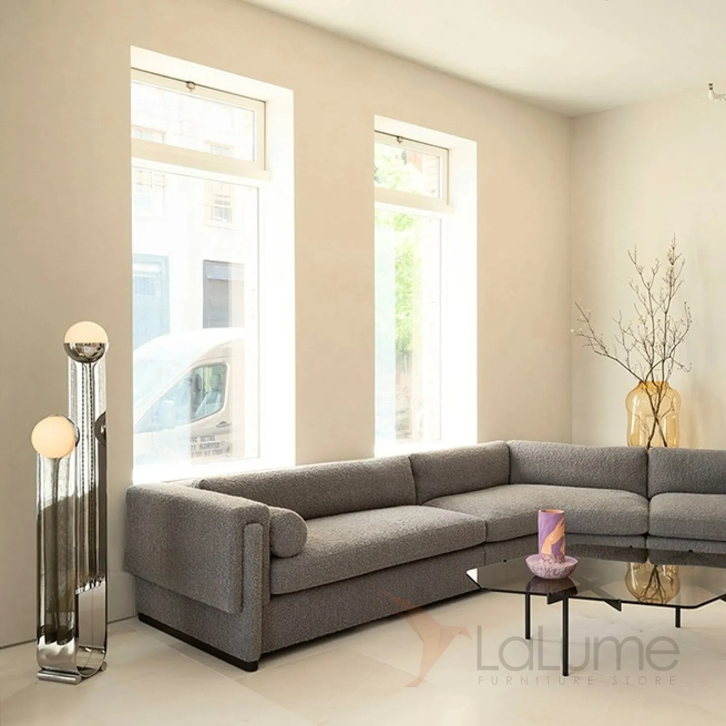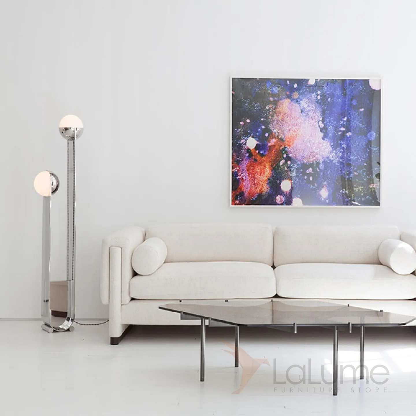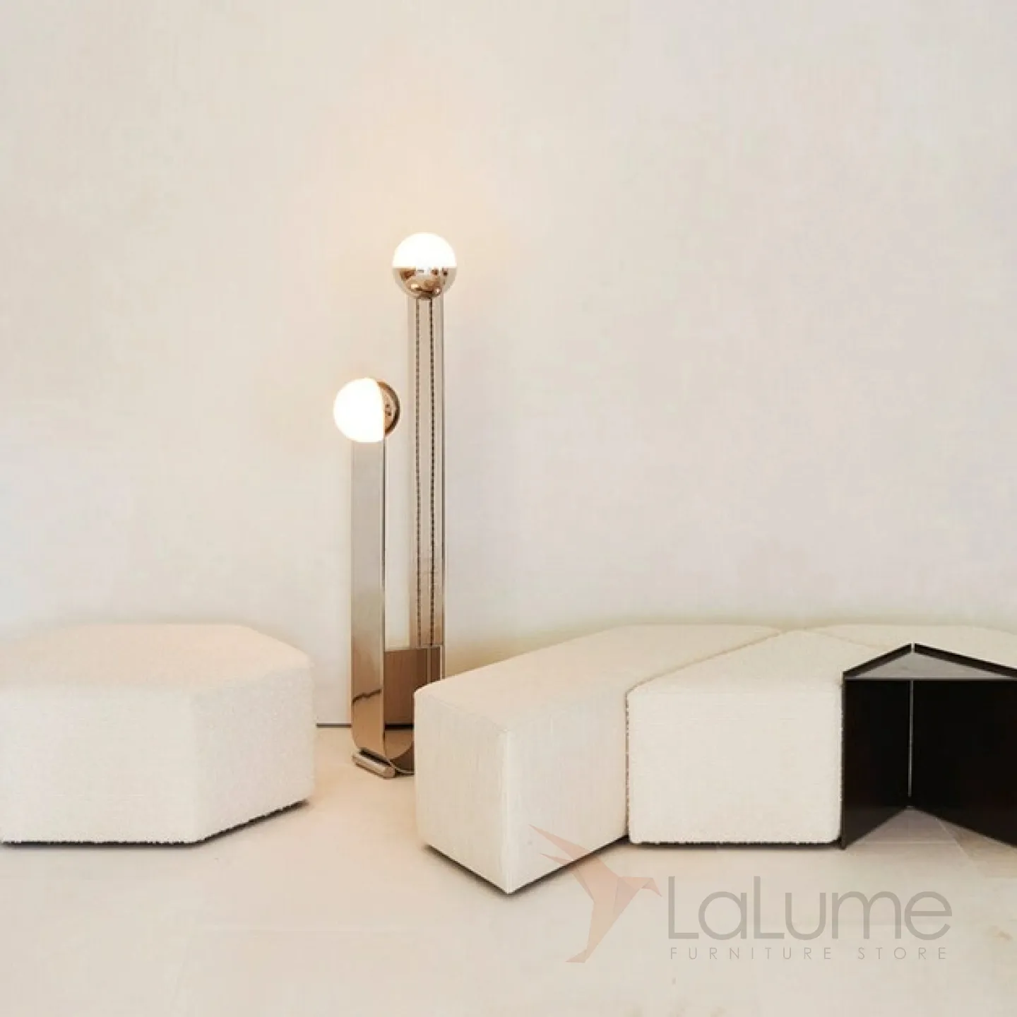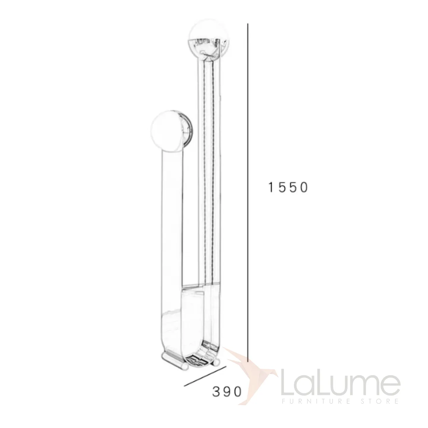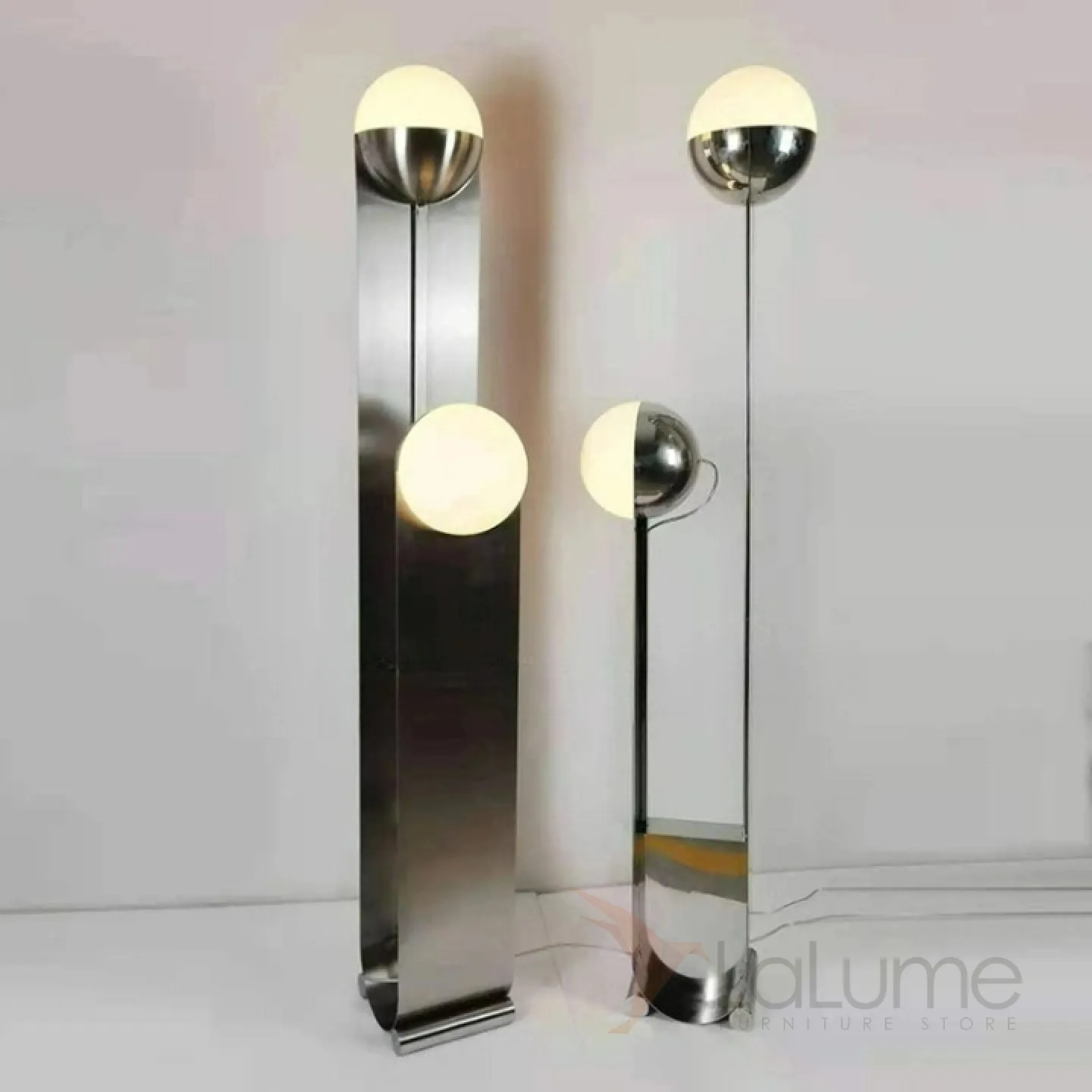 Современный напольный светильник с двумя плафонами на основании из нержавеющей стали.