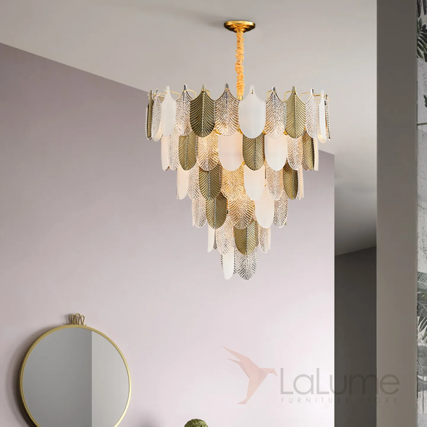 Подвесная люстра со стеклянным декором в виде перьев, расположенным с несколько ярусов LAIMA