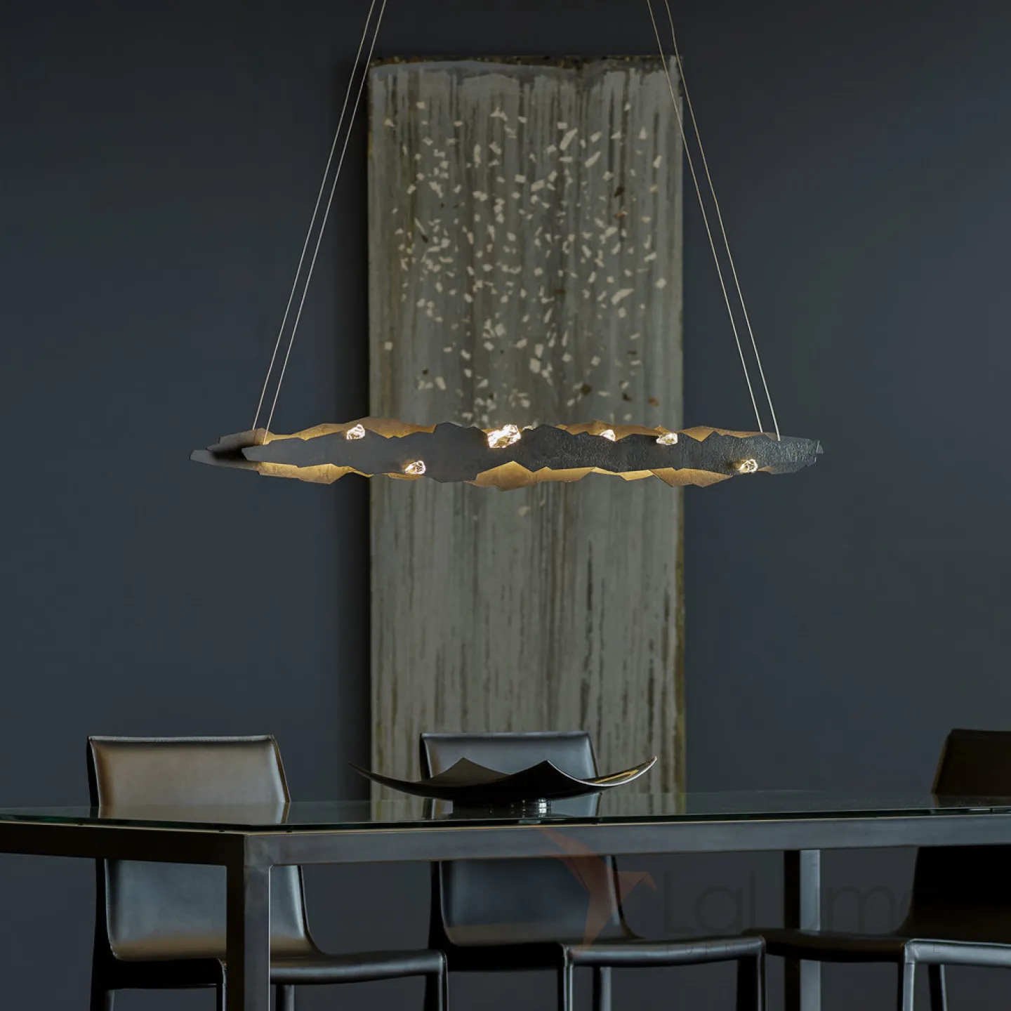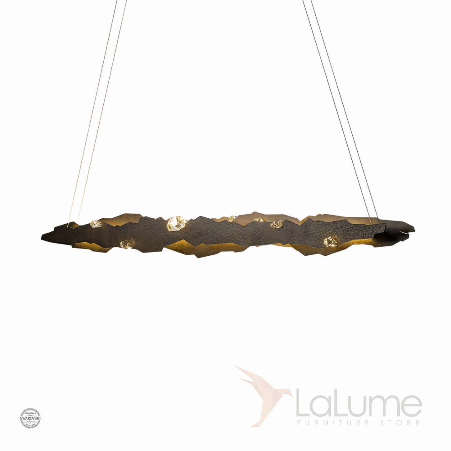 Подвесной реечный светильник с прозрачными кристаллами из стекла в металлическом каркасе неправильной формы с подсветкой RARE