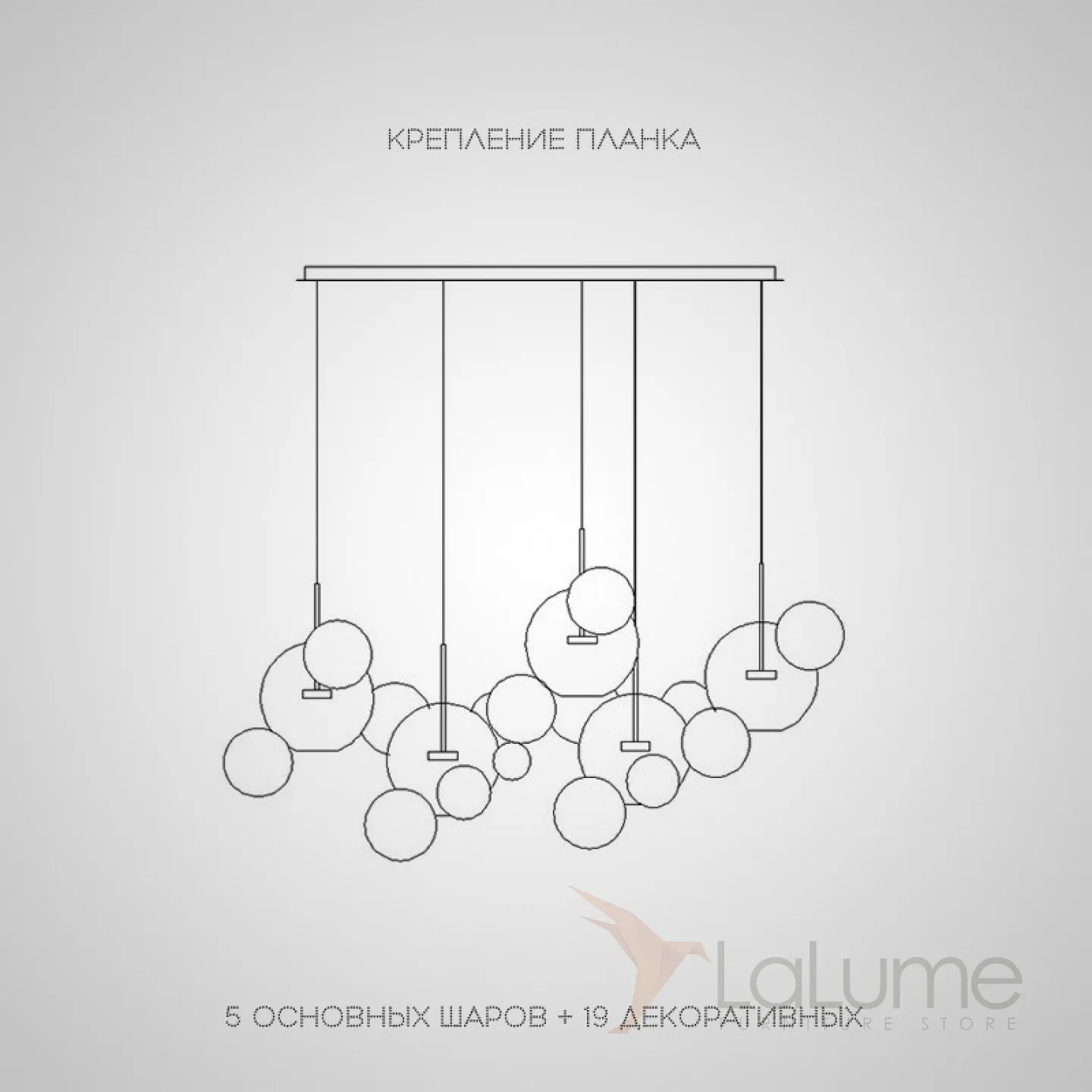Помимо отдельных конфигураций, светильники также могут быть собраны в готовые групповые комбинации на общих потолочных креплениях по 2, 3, 5 или 7 штук с различным количеством декоративных шаров на каждом светильнике.