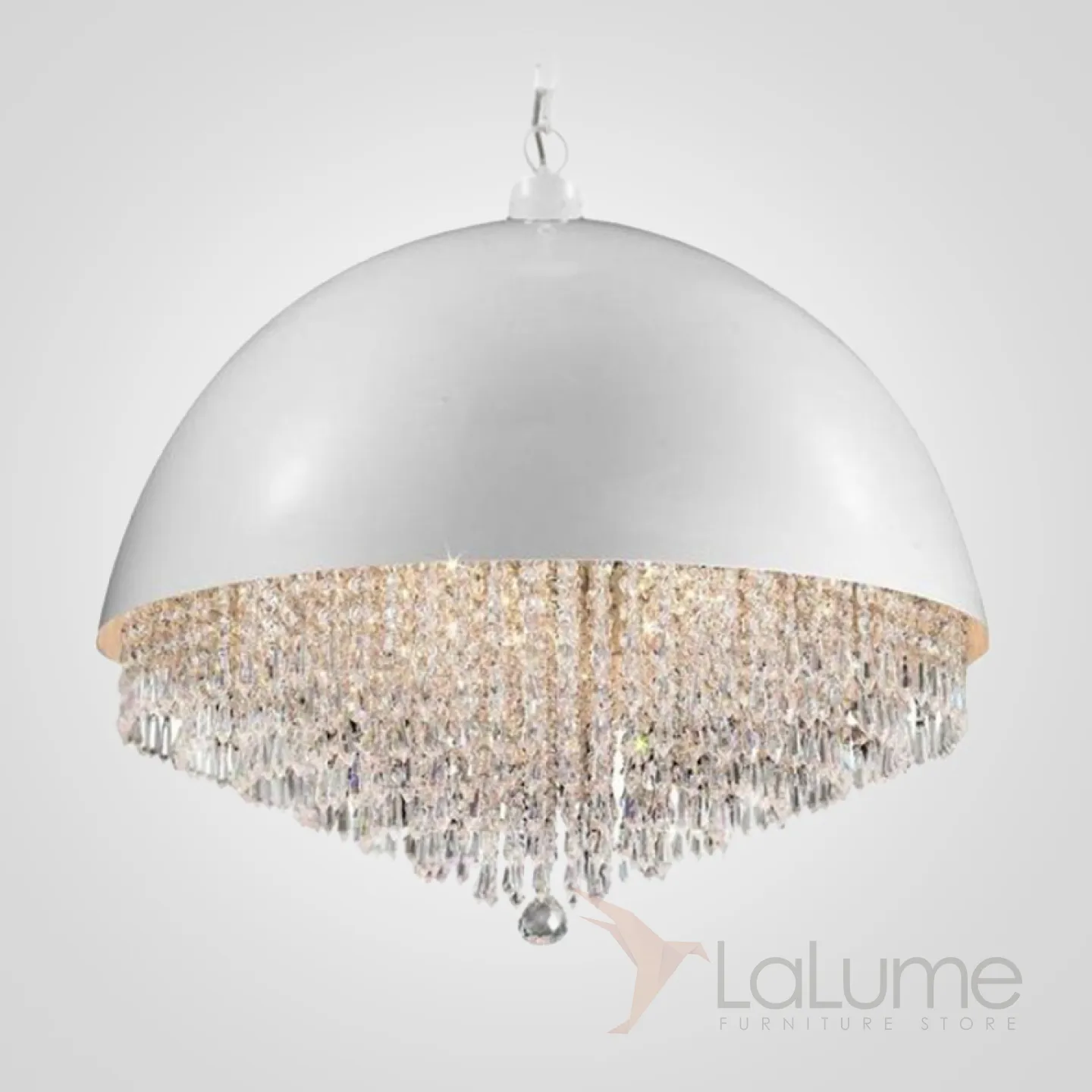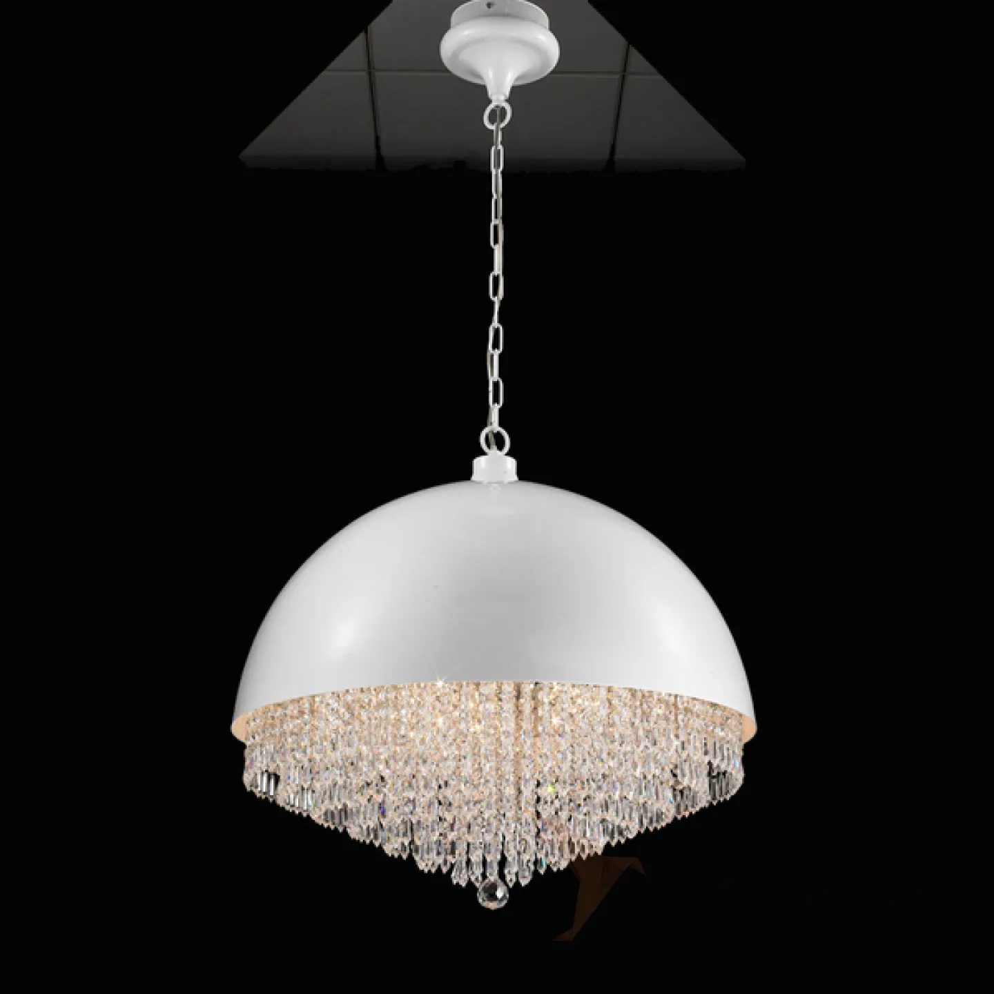 Подвесной светильник в виде купола из металла белого цвета. Внутри множество хрустальных подвесок разной длины.