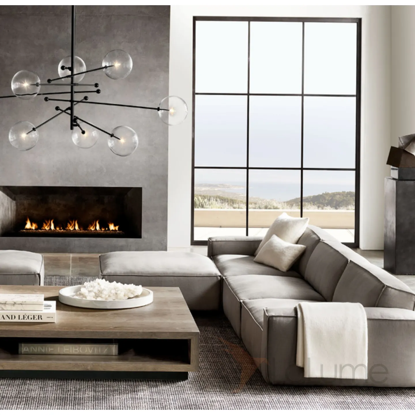 Подвесной светильник с металлической арматурой черного цвета. Плафоны и абажуры из прозрачного стекла.