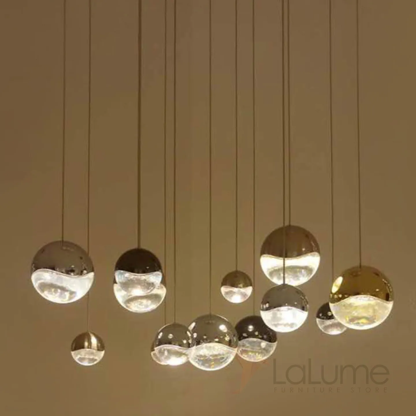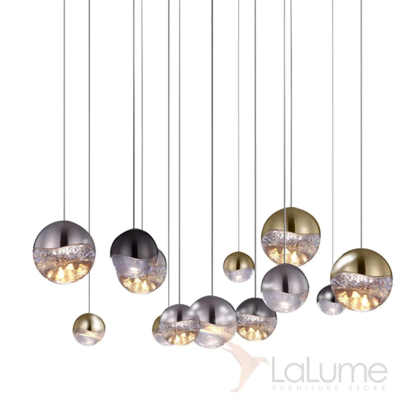Подвесной светильник с 13-тью плафонами из металла и прозрачного стекла. Цвет металла: сатинированный никель.