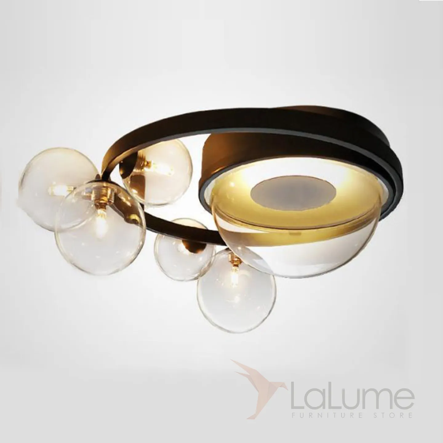 Потолочная люстра с LED-источником под прозрачной полусферой и шарообразными плафонами разного размера на кольцевом каркасе IONA CORE D47