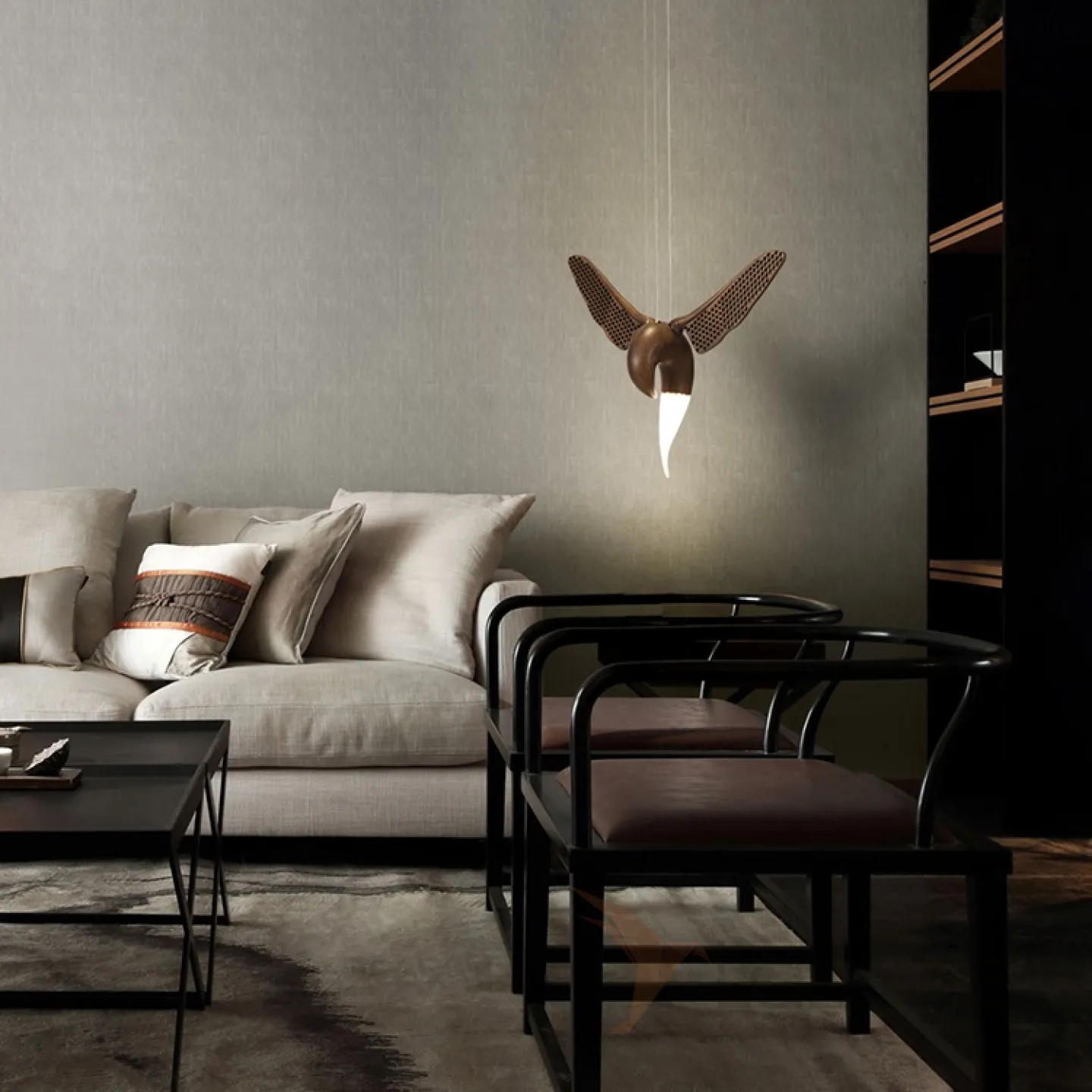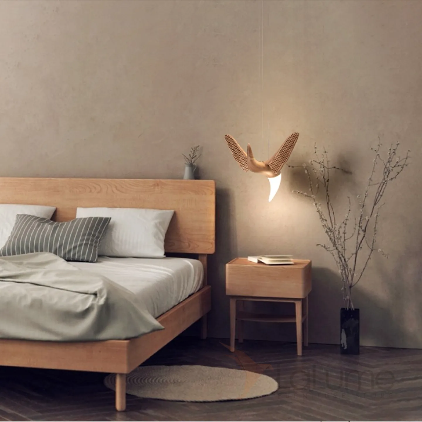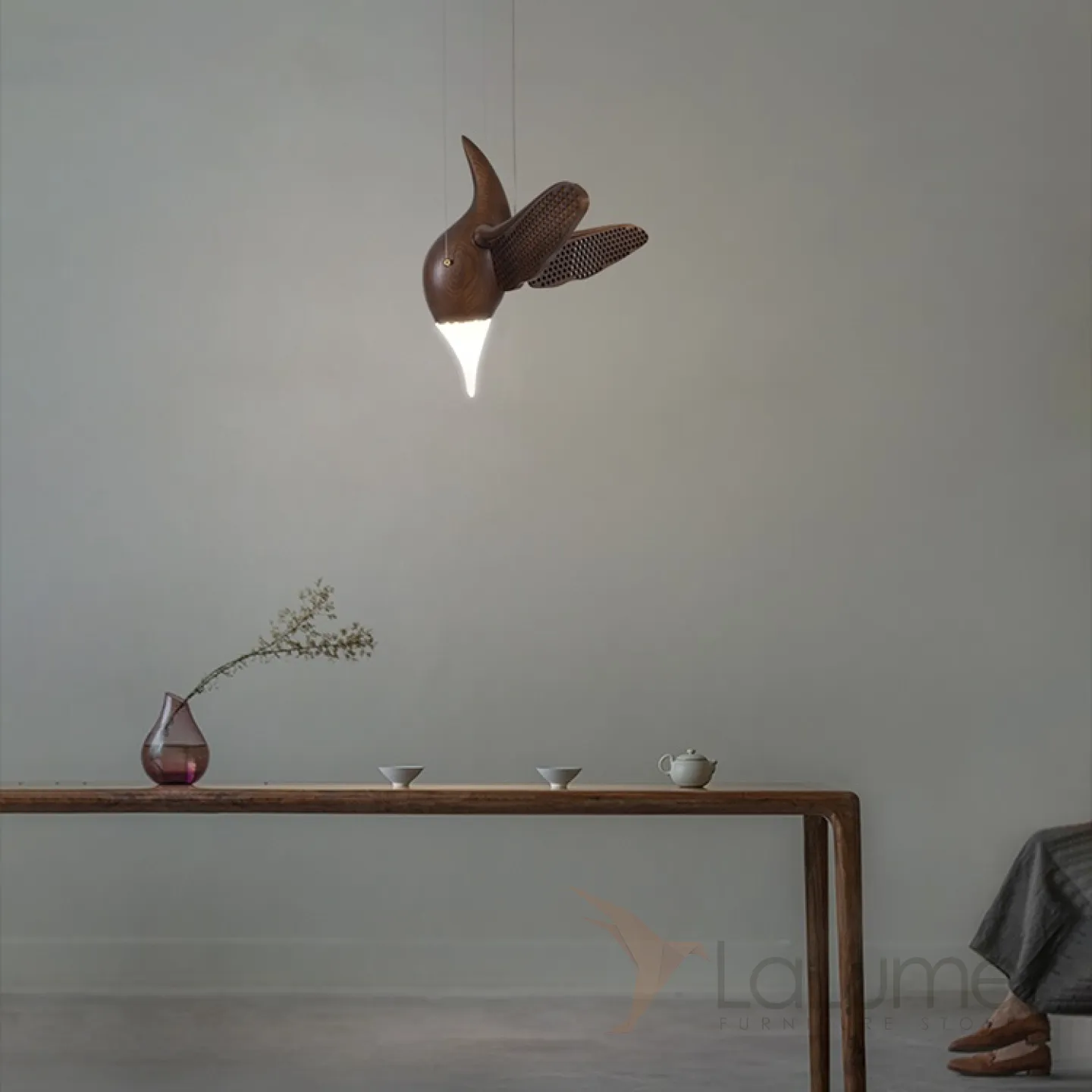 Серия подвесных светильников виде деревянных птиц со светящимися клювами с дополнительным световым элементом в потолочном креплении HANSY