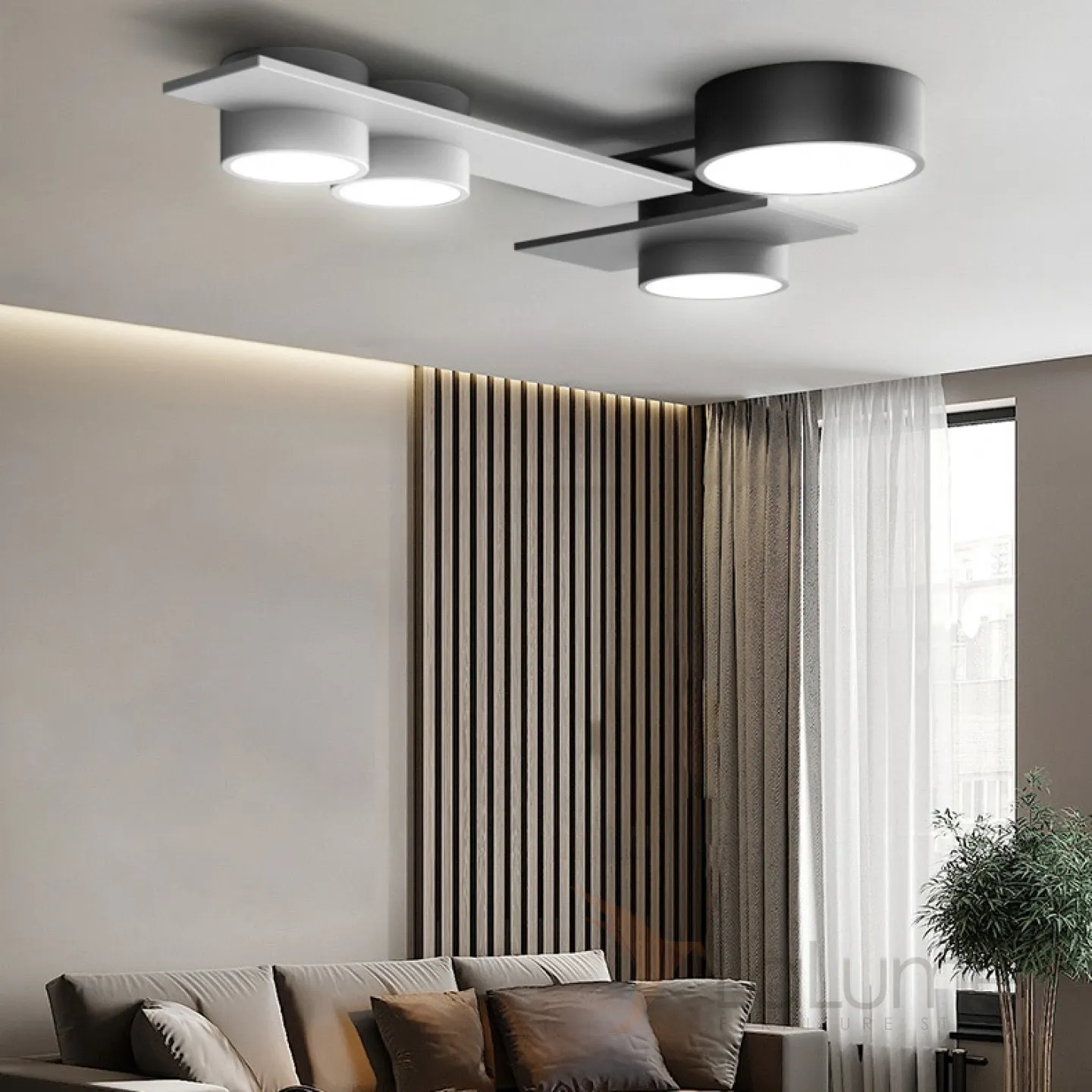 Серия потолочных светильников в виде комбинаций цилиндрических плафонов и прямоугольных панелей SLANT