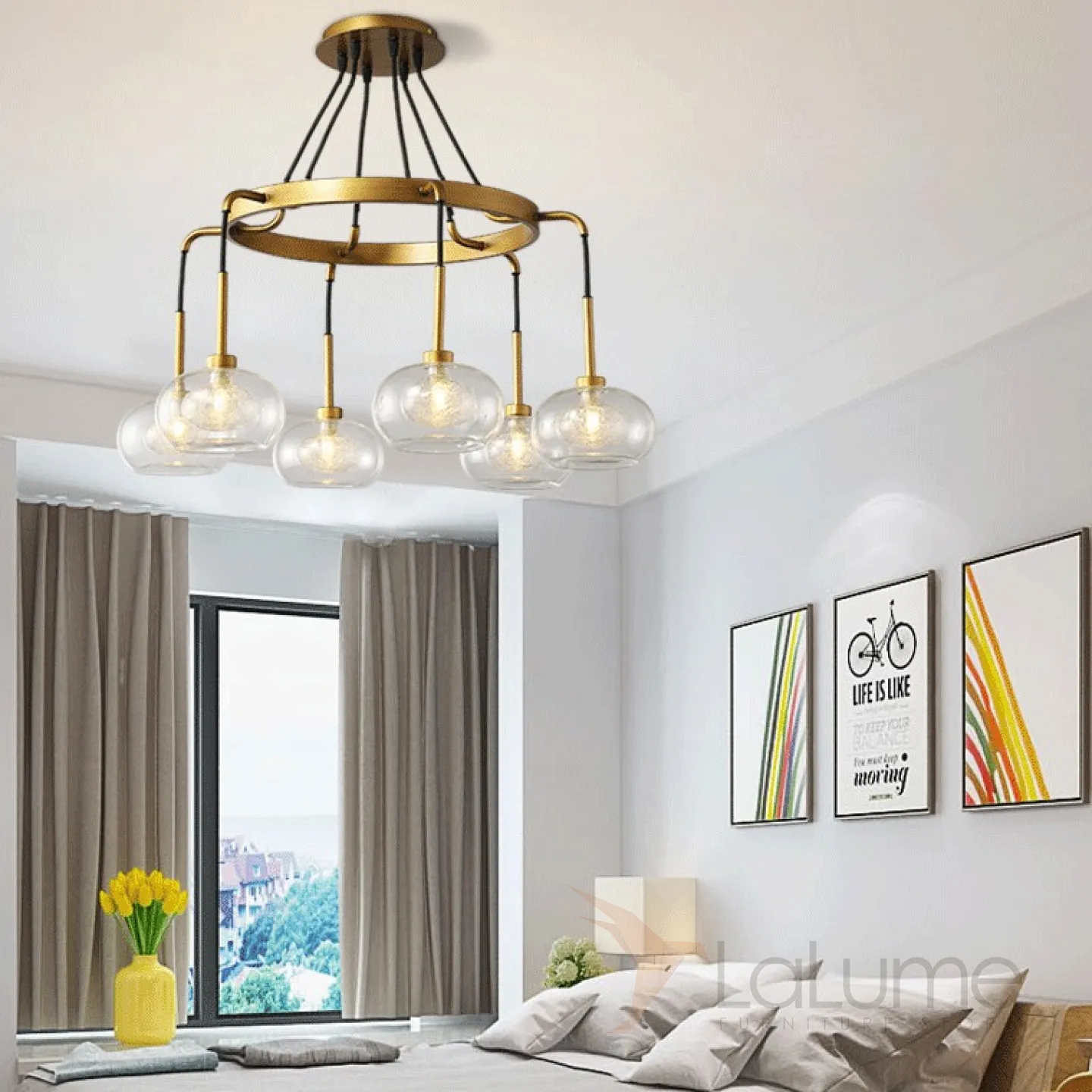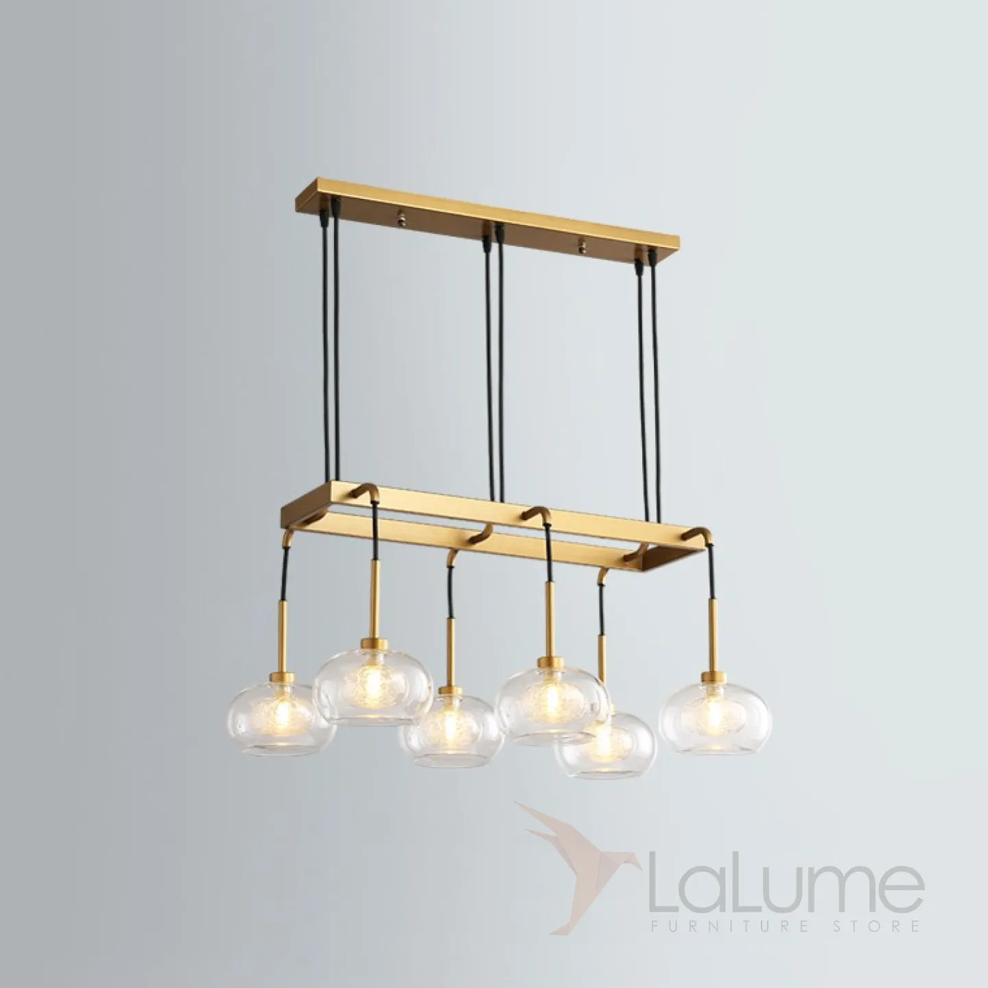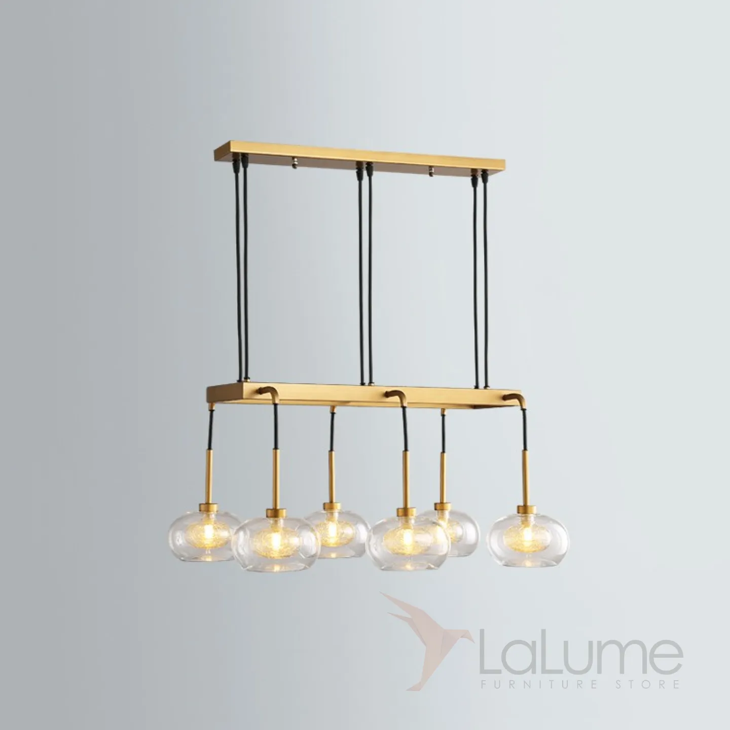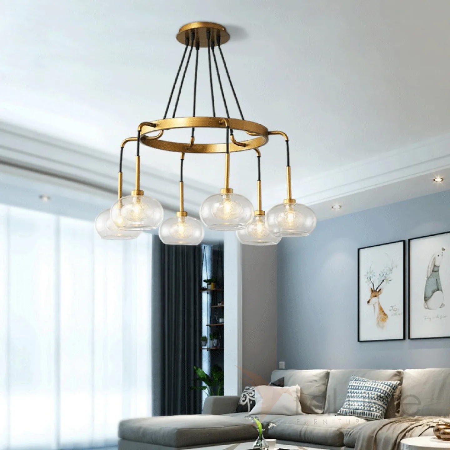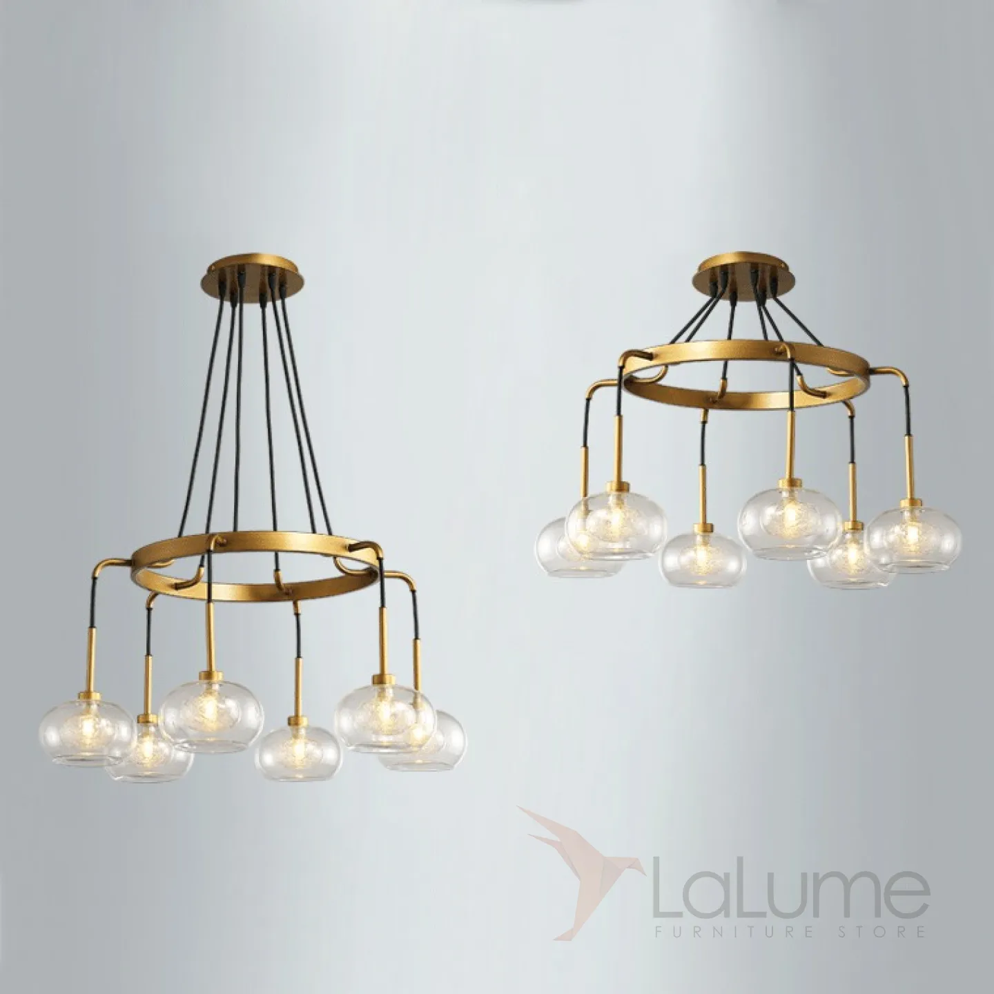 Серия подвесных люстр на кольцевом или прямоугольном каркасе со стеклянными плафонами с декором 2-х оттенков.